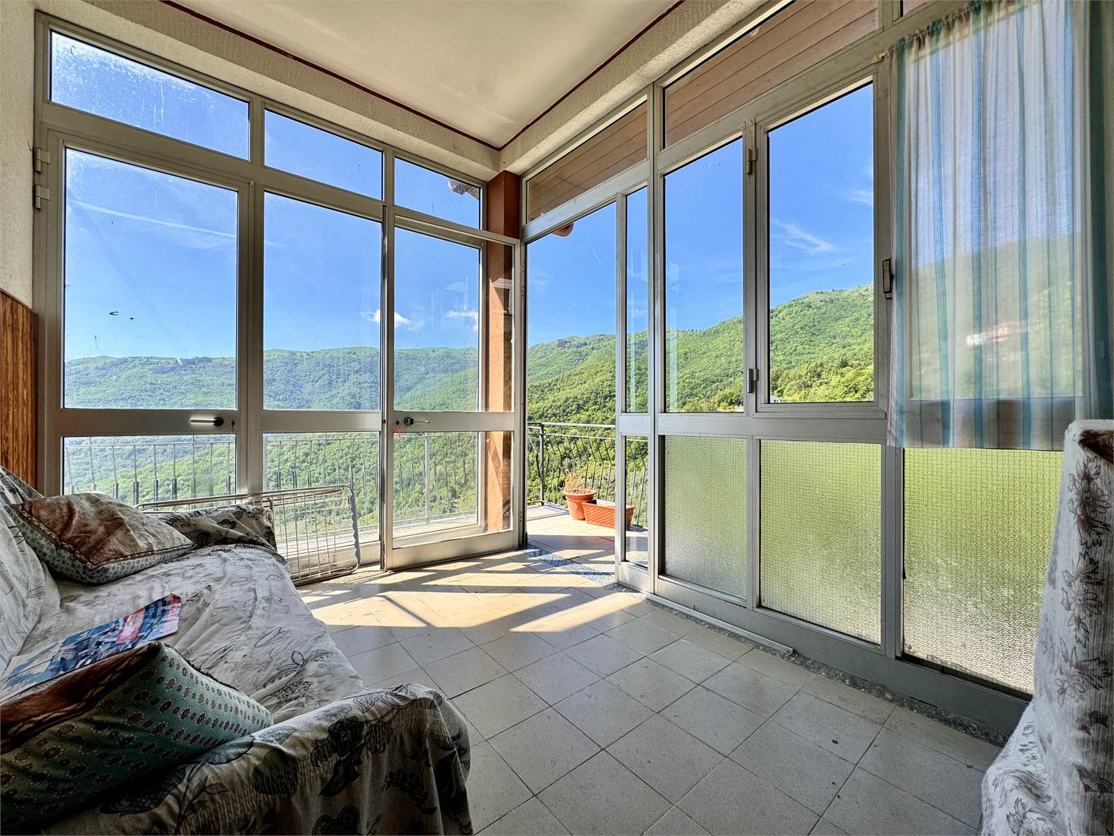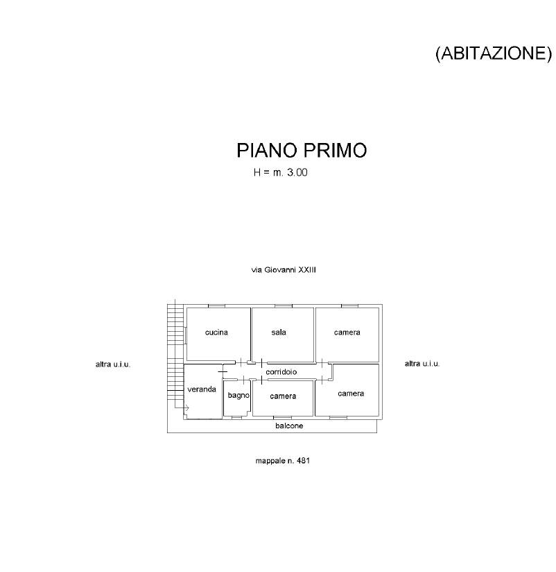 Si accede al primo piano tramite una scala esterna. Davanti all’ingresso si trova una veranda. L’interno è composto da un corridoio che collega la cucina, il soggiorno, tre camere e il bagno. Sul lato sud-est è presente un balcone con vista sulla valle.