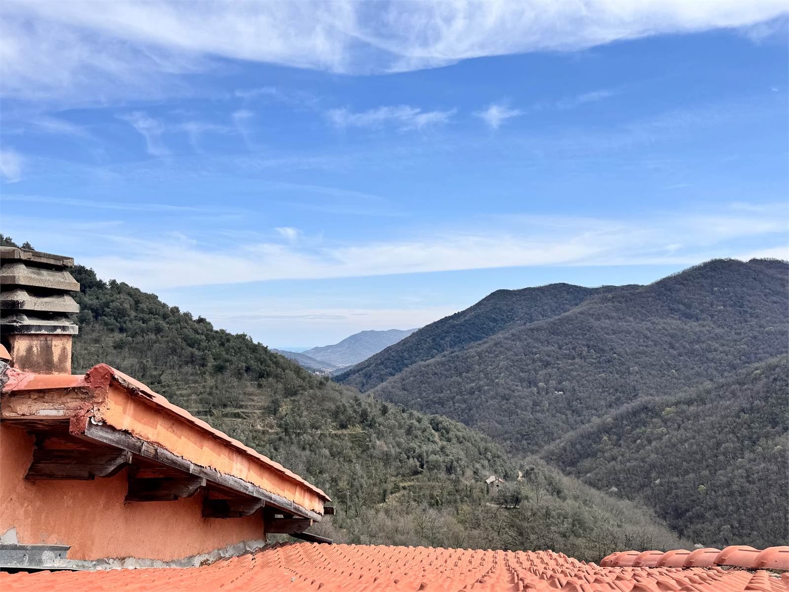 Il primo piano dell'abitazione dalla quale al momento si accede tramite una scala in legno è composto da un vano ad uso cucina e un terrazzo di circa 25 metri quadri con vista aperta sulla vallata di Andora fino al mare.