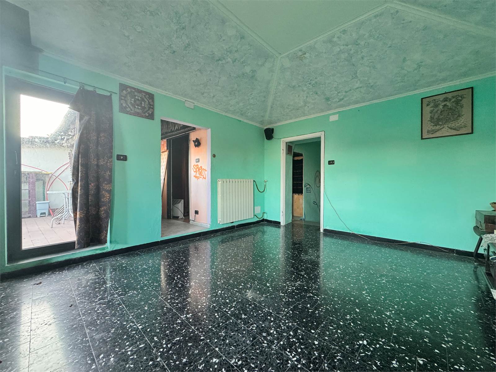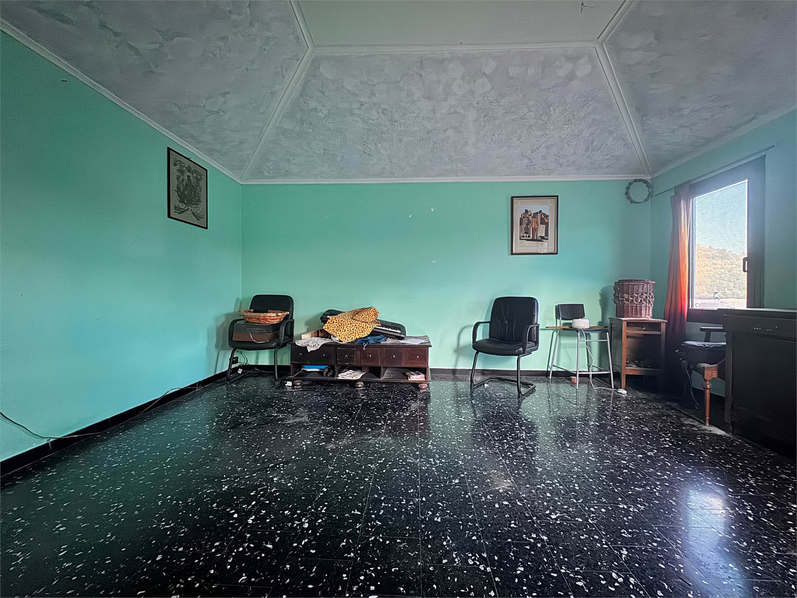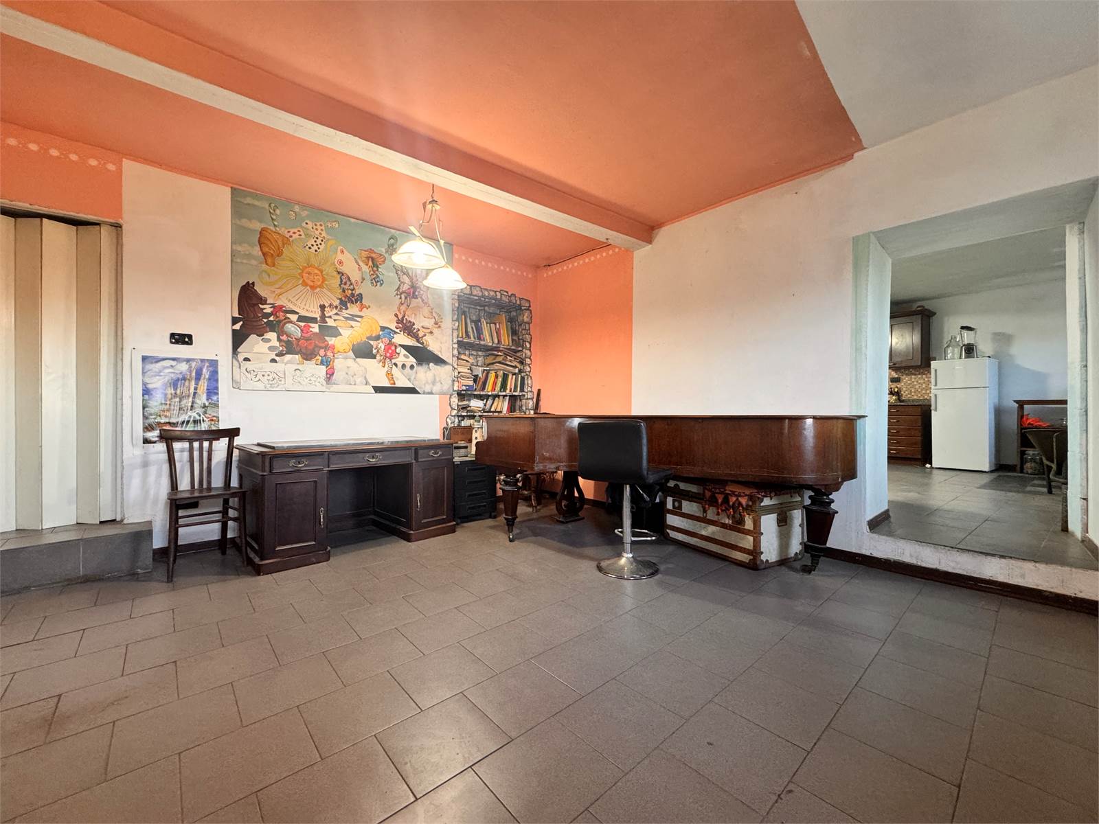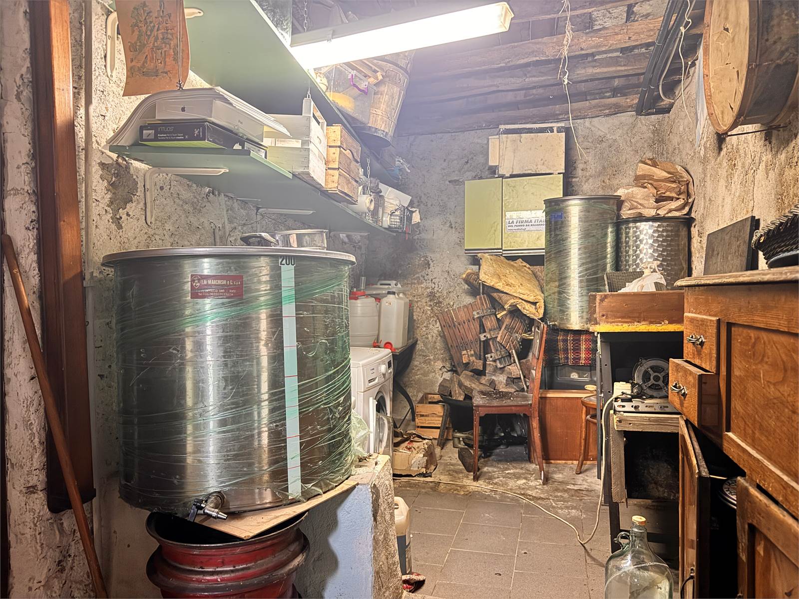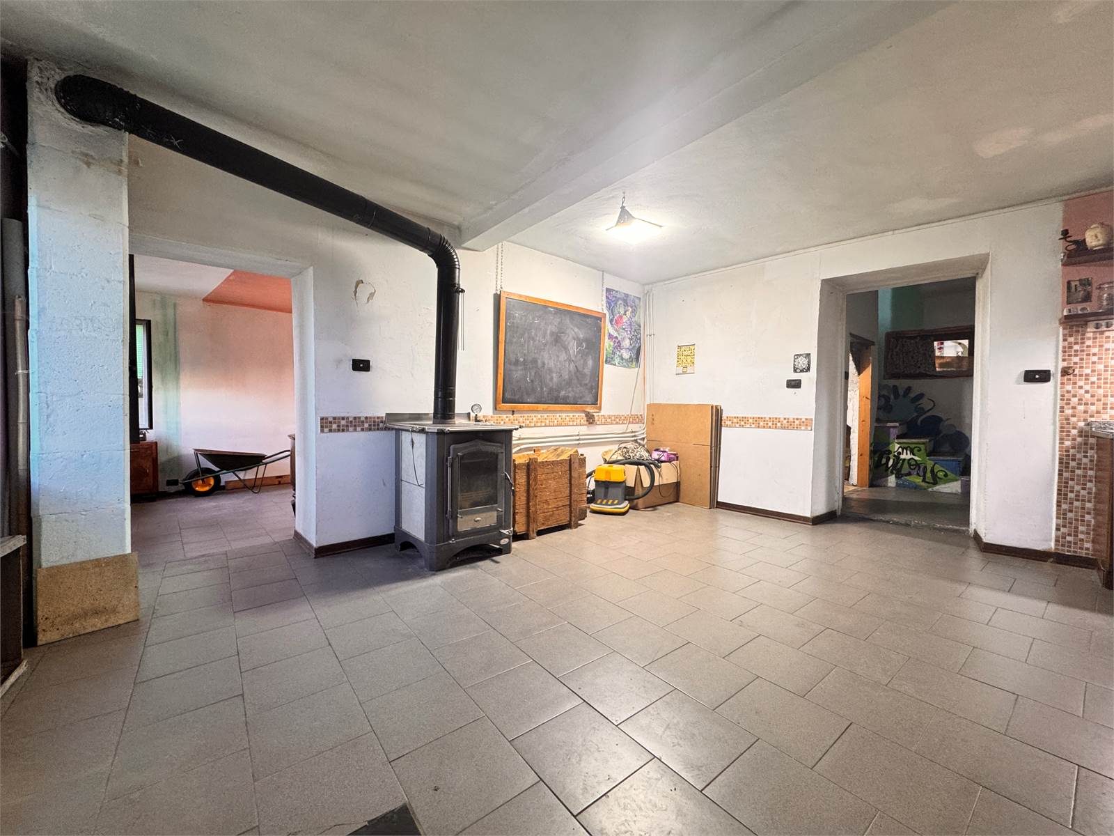 Il piano terra viene completato da una sala molto ampia con accesso a un magazzino dapprima utilizzato come dispensa, il quale offre un ulteriore porta d'ingresso.