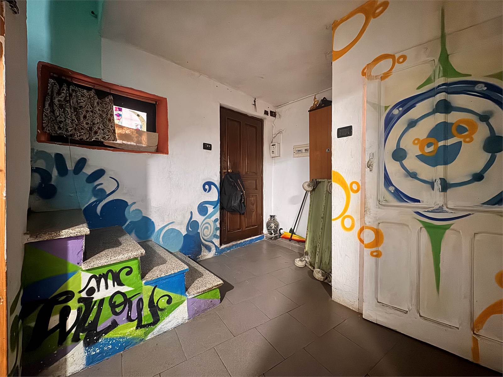 L'ingresso è al piano terra ed è direttamente su un'atrio di ingresso che funge da disimpegno per il vano scale, un bagno di servizio, l'accesso al piano di sotto e il resto del piano abitativo.