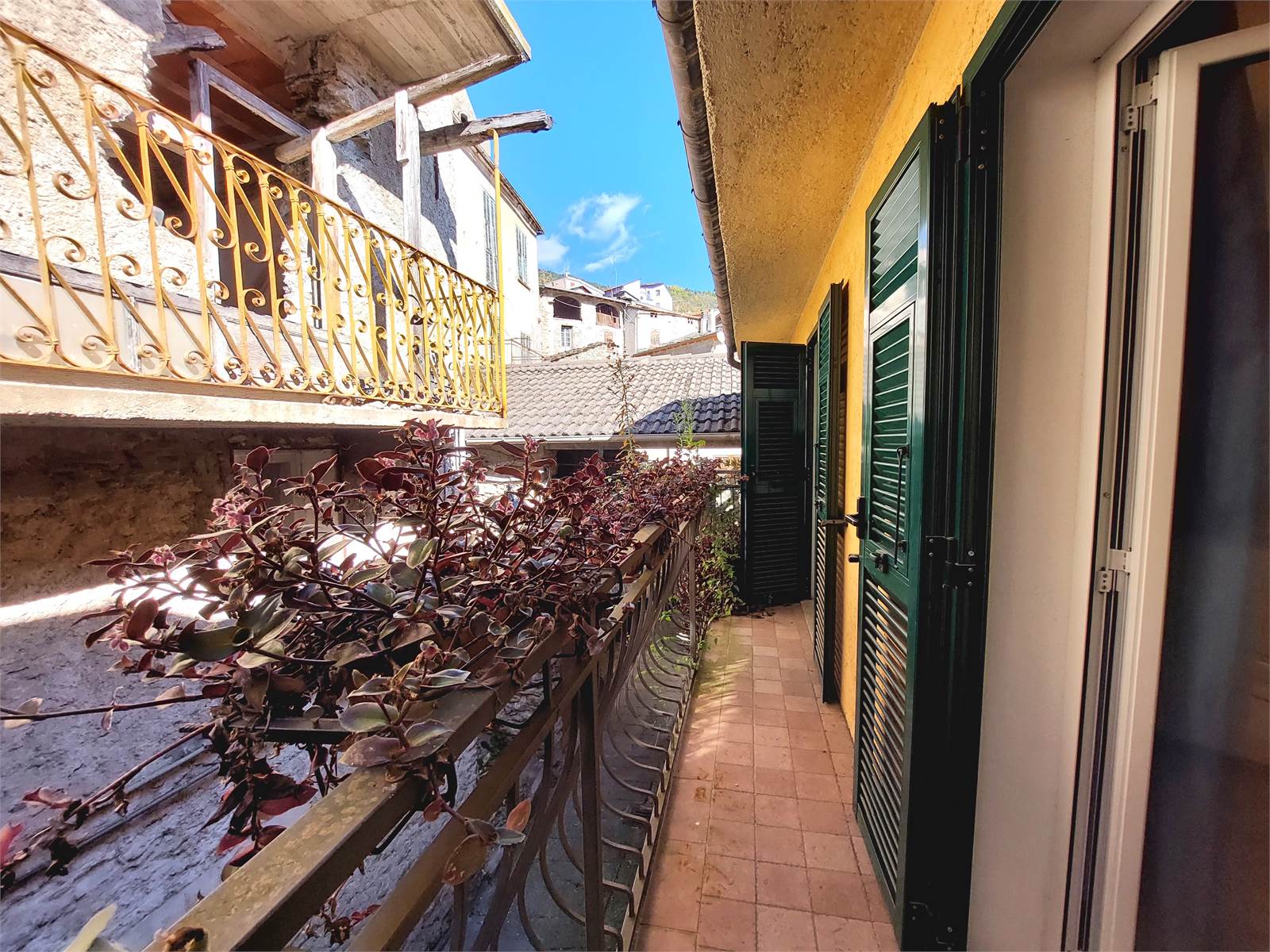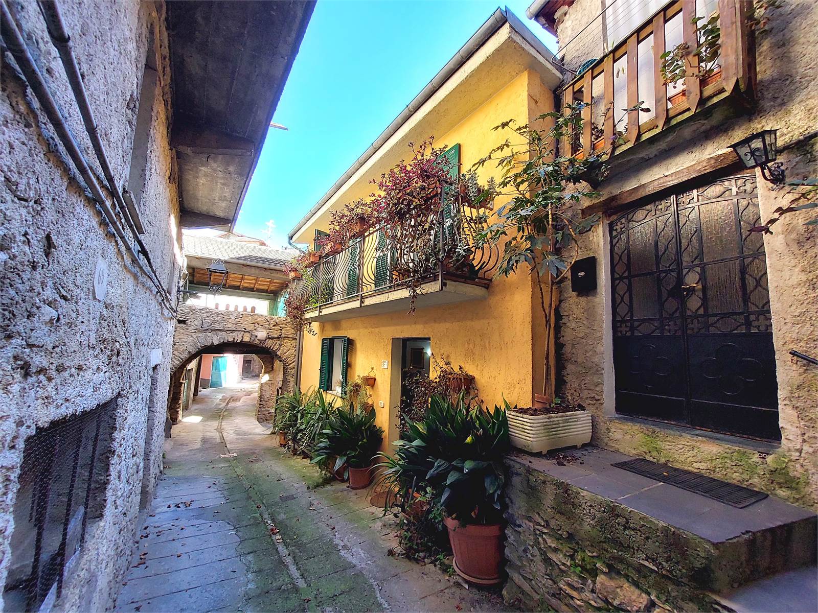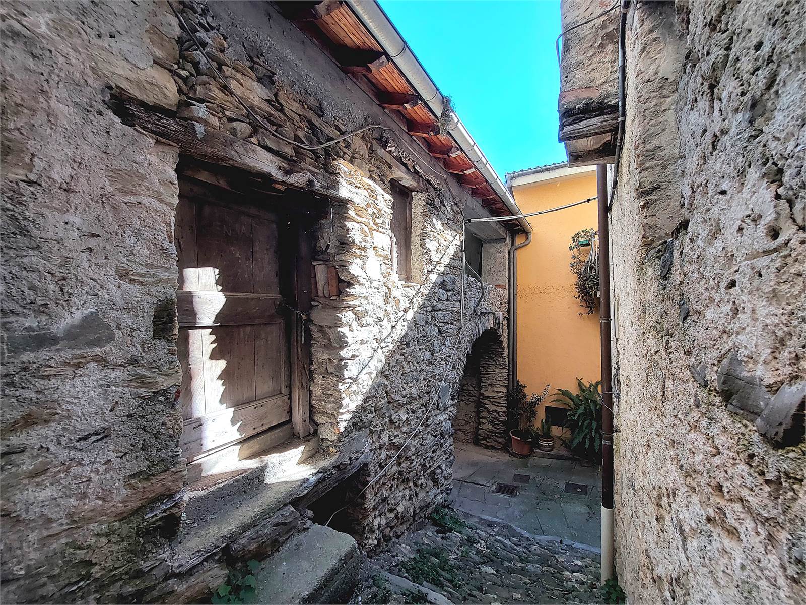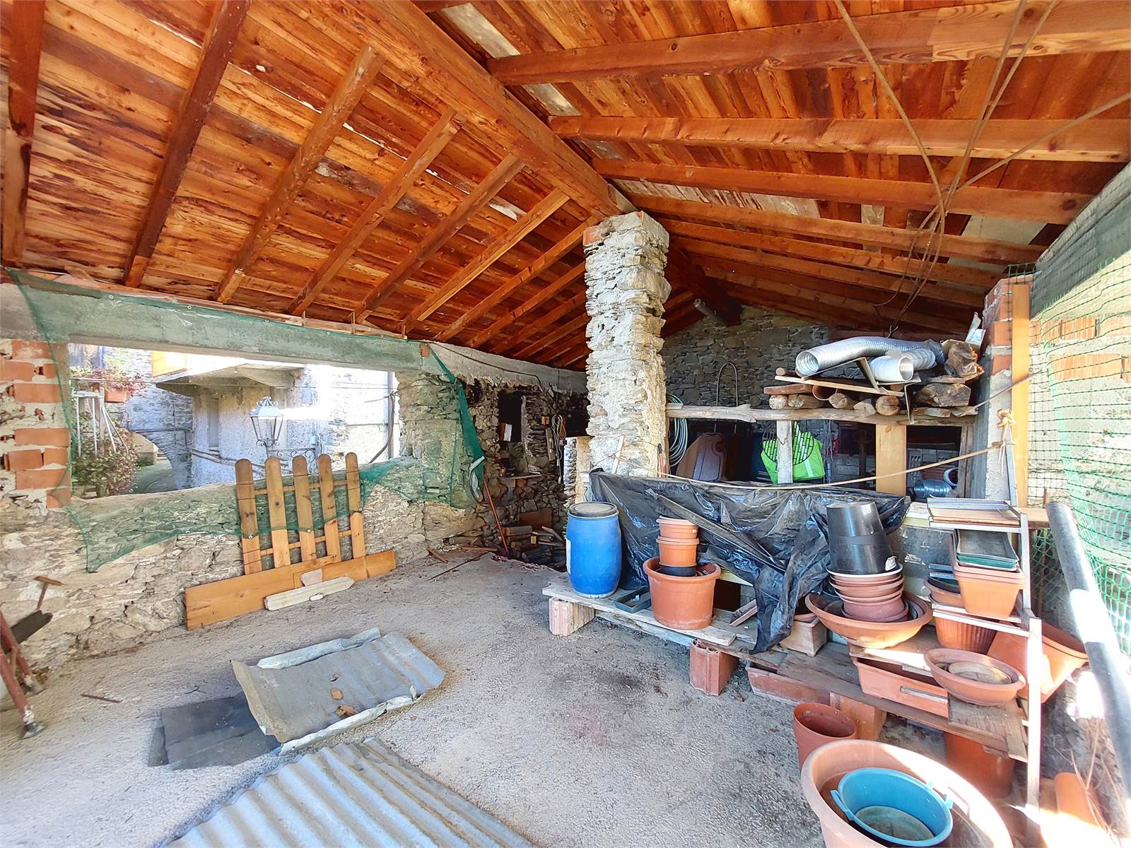 Adiacente al corpo principale della casa e compreso nella proprietà in vendita c'è infine un loggiato con ingresso indipendente esterno, posizionato al di sopra di un portico che sovrasta e attraversa il vicolo del paese. Questo locale è un unico ambiente con ampie aperture verso l'esterno che misura circa 34 metri quadrati e che può essere utilizzato come terrazzo coperto, oppure può anche essere trasformato in un'ulteriore unità abitativa indipendente. Anche per il loggiato erano stati rifatti soletta e tetto ed è attualmente dotato di impianto elettrico.