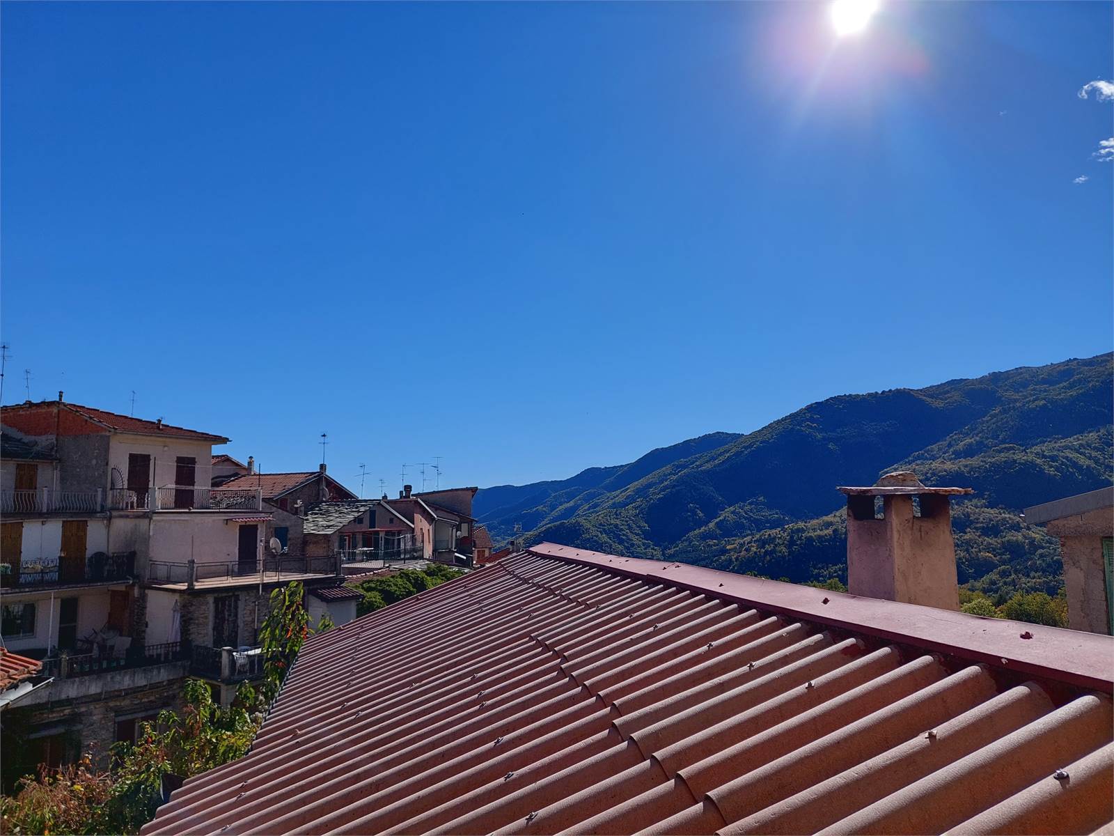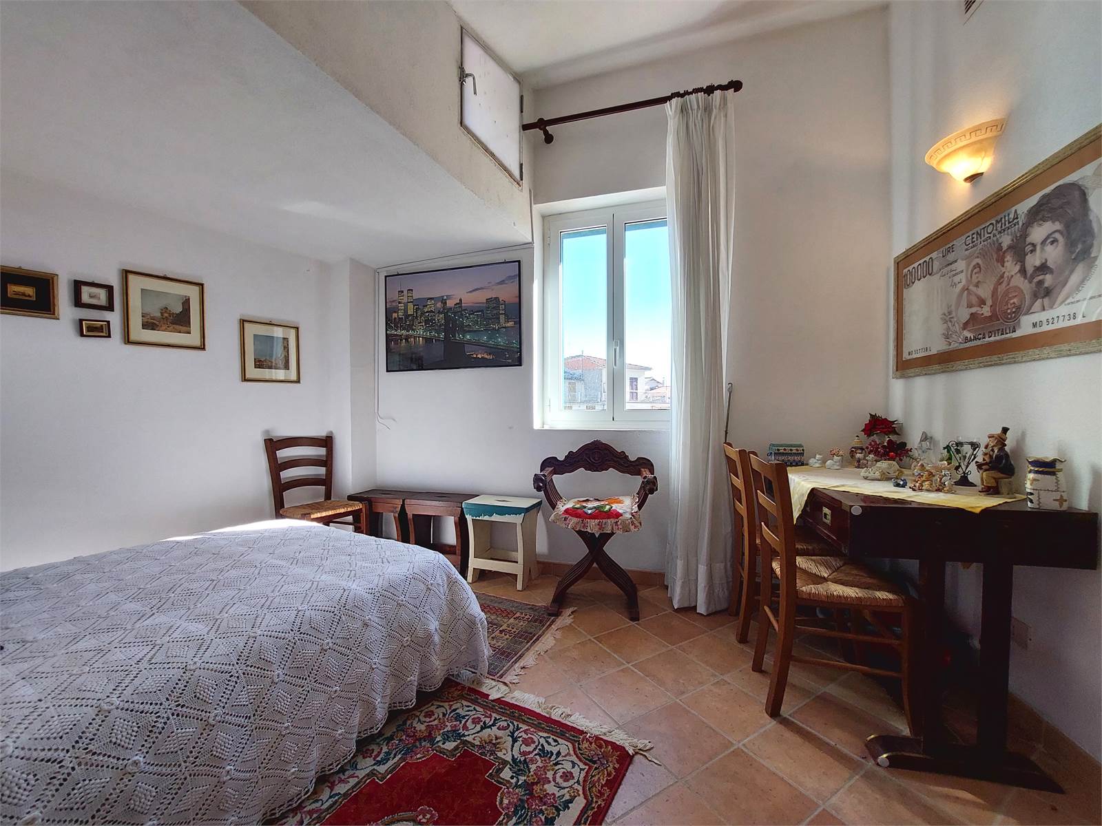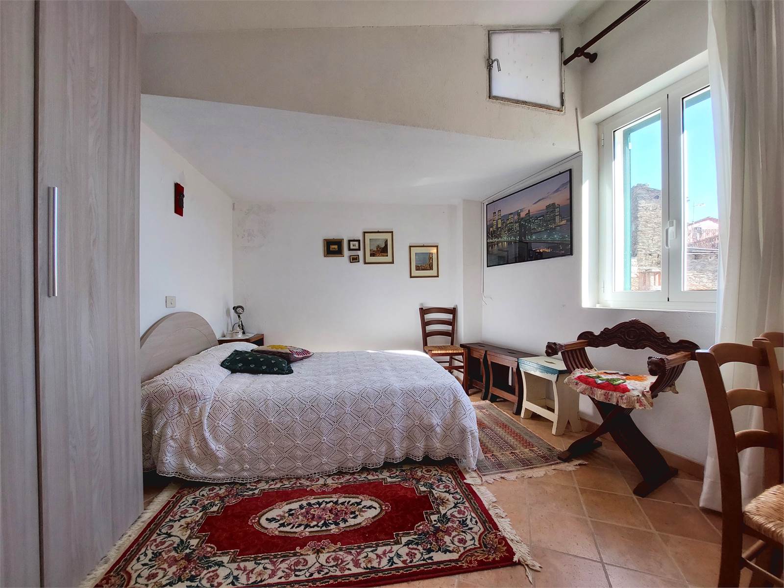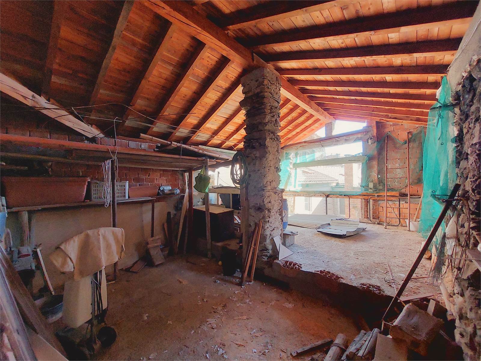 Adiacente al corpo principale della casa e compreso nella proprietà in vendita c'è infine un loggiato con ingresso indipendente esterno, posizionato al di sopra di un portico che sovrasta e attraversa il vicolo del paese. Questo locale è un unico ambiente con ampie aperture verso l'esterno che misura circa 34 metri quadrati e che può essere utilizzato come terrazzo coperto, oppure può anche essere trasformato in un'ulteriore unità abitativa indipendente. Anche per il loggiato erano stati rifatti soletta e tetto ed è attualmente dotato di impianto elettrico.