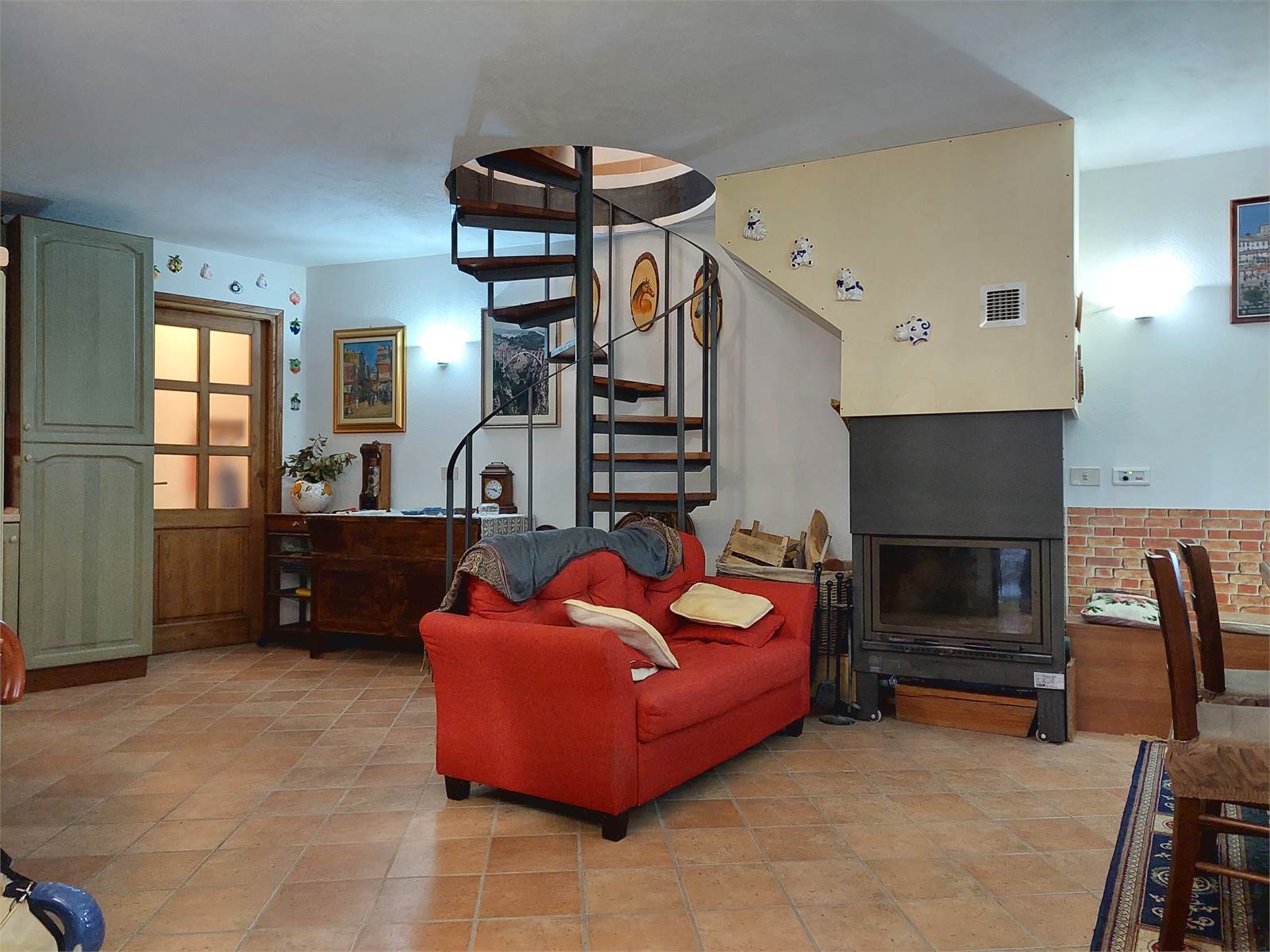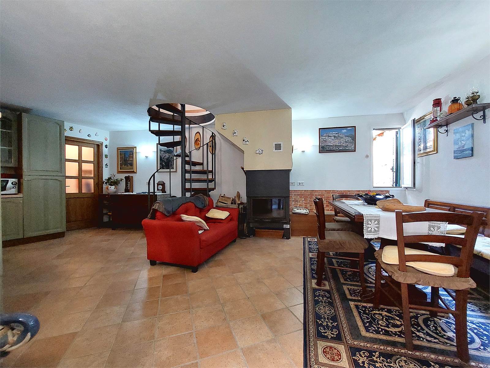 Il portoncino d'ingresso è blindato e da accesso alla zona giorno che è situata al piano terra della casa. Cucina e soggiorno formano un ambiente unico che misura circa 30 metri quadrati. La zona giorno è valorizzata da un camino a legna posizionato al centro della stanza, il quale ha un impianto di ventilazione e bocchette di diffusione aria calda presenti anche in ogni vano del piano superiore. Di fianco alla parete attrezzata della cucina sono presenti antibagno e bagno a servizio del piano terra dell'abitazione.