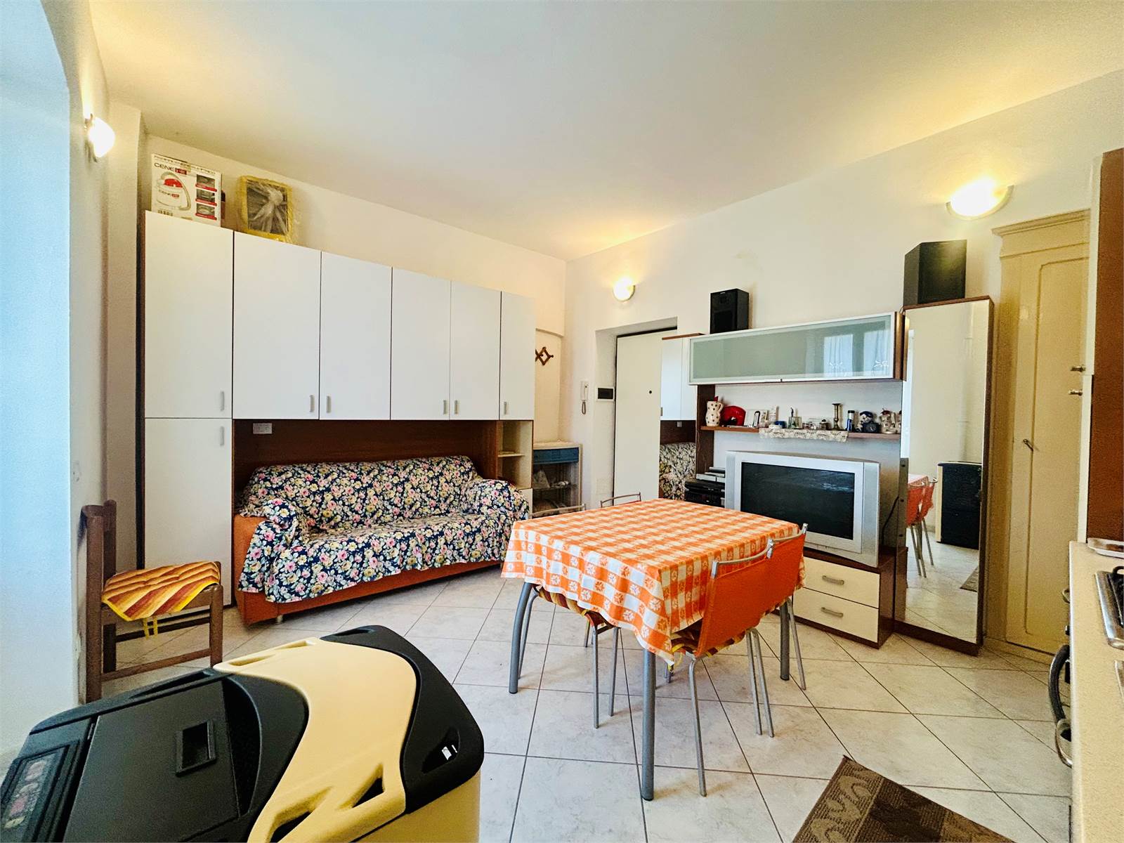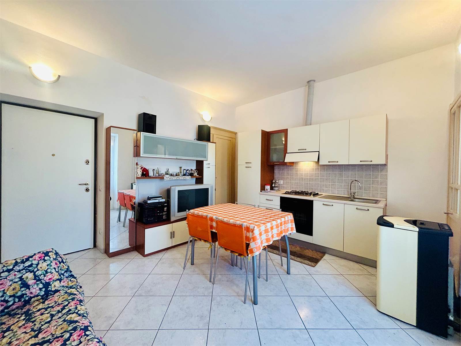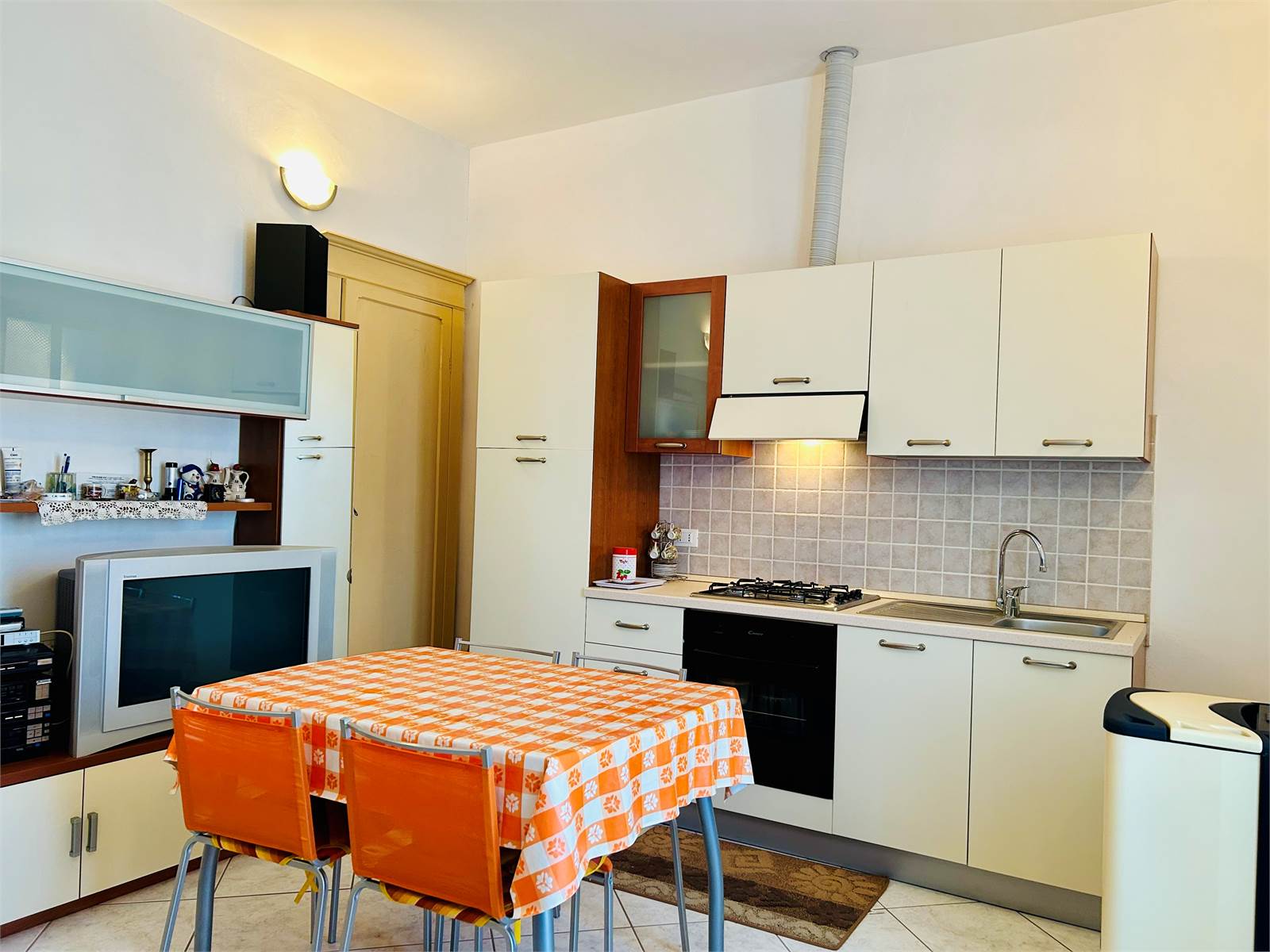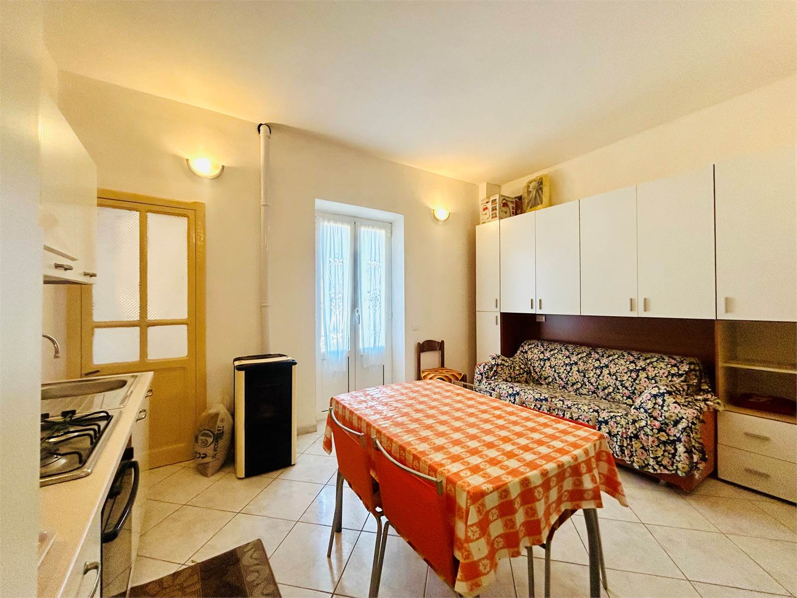 L'ingresso, attraverso la porta blindata è direttamente nella cucina abitabile, al suo interno è presente la lavatrice e la caldaia a pellet collegata ai termoconvettori ad aria.