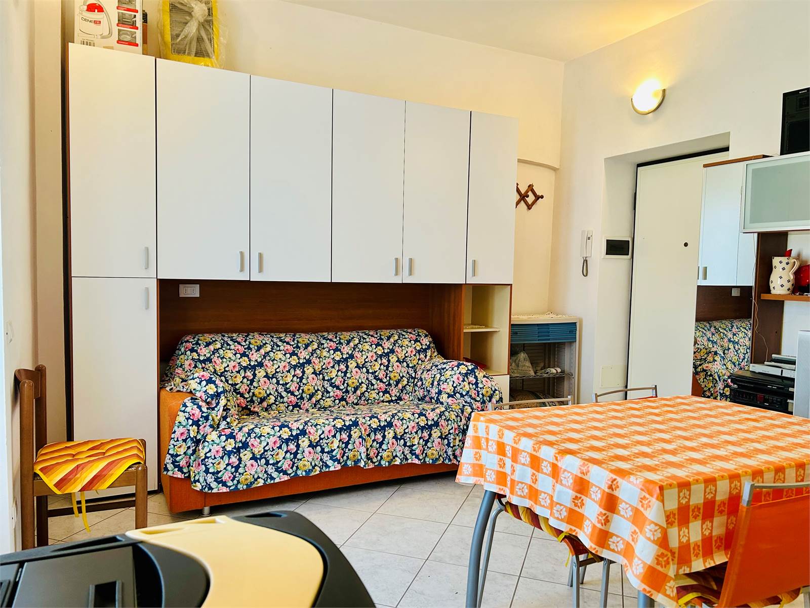 Al suo interno troviamo l'angolo cottura a vista con stufa a pellet, un'armadiatura a ponte con divano letto matrimoniale e una piccola dispensa.