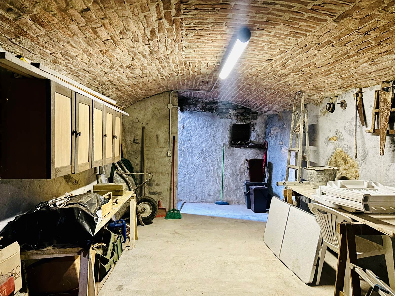 Essa è resa luminosa dalla portafinestra che affaccia sul terrazzo di circa 8 metri e che si estende per la maggior parte della facciata. Da qui, c'è inoltre la possibilità di scendere al piano interrato, ove si trova la cantina di pertinenza che misura oltre 20 metri. Quest'ultima ha la particolarità di avere il soffitto a volta in mattoni a vista.