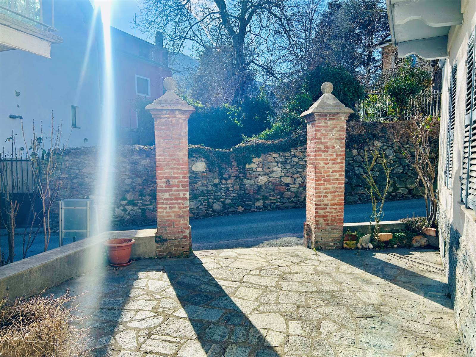 Dalla strada, attraverso il cortile comune impreziosito da due colonne in mattoni a vista, si accede nell'atrio che introduce il primo appartamento del piano terra.