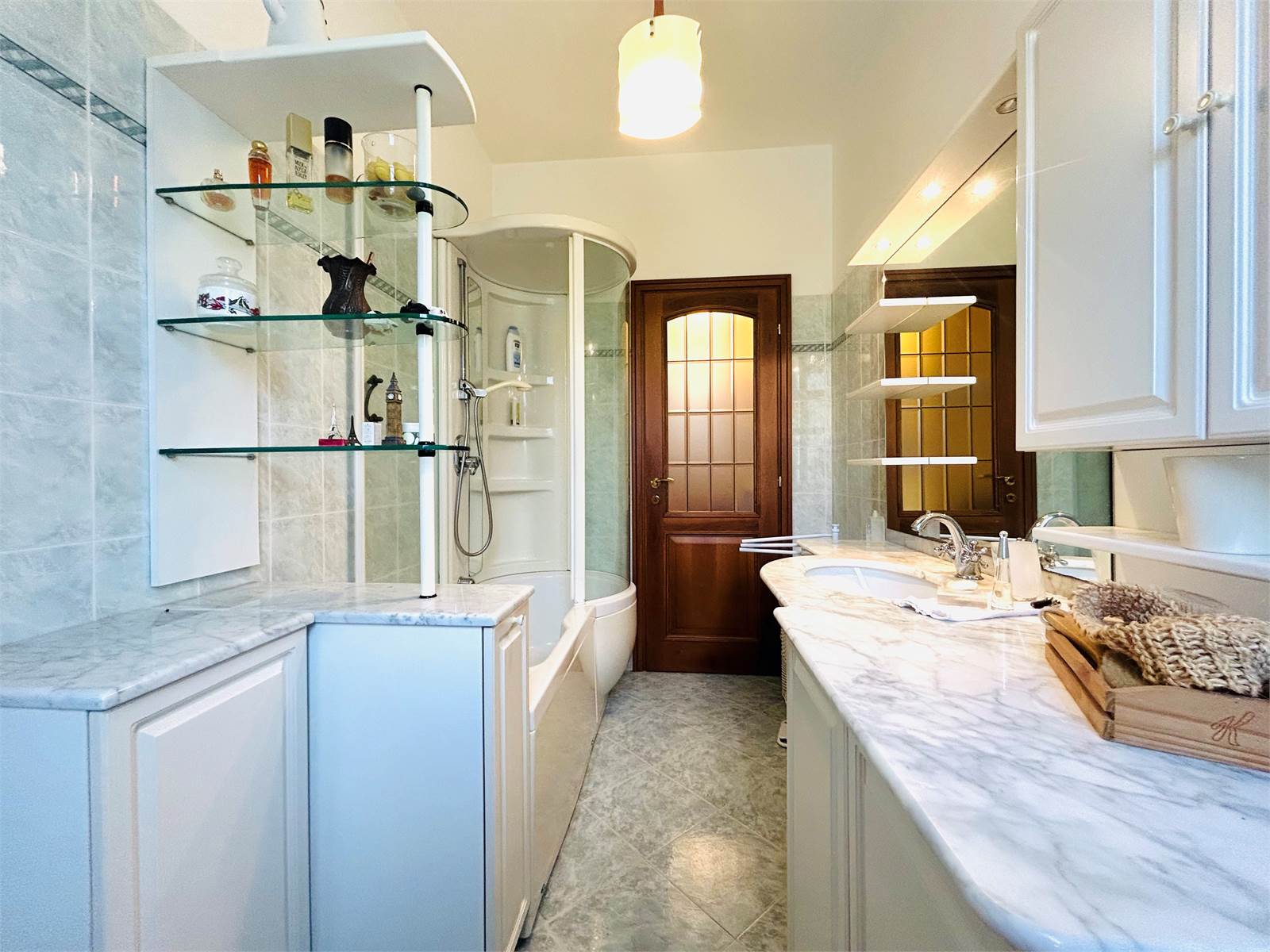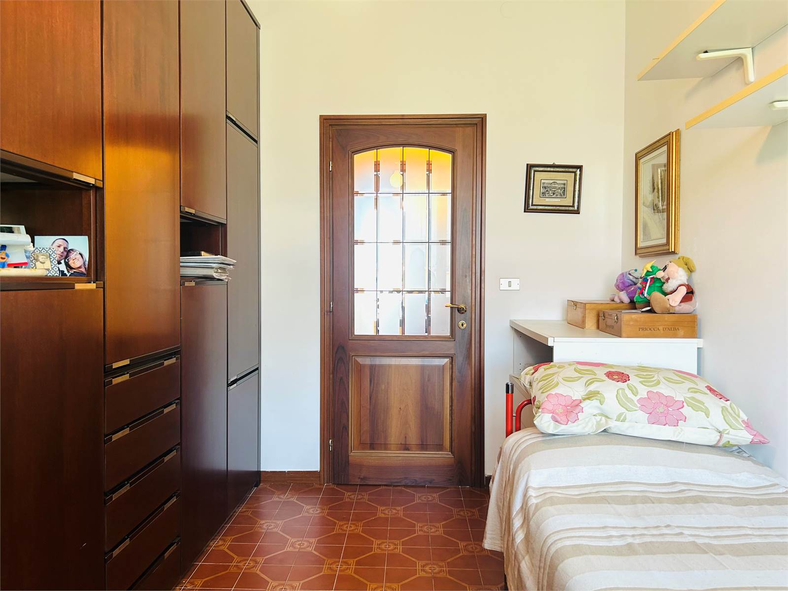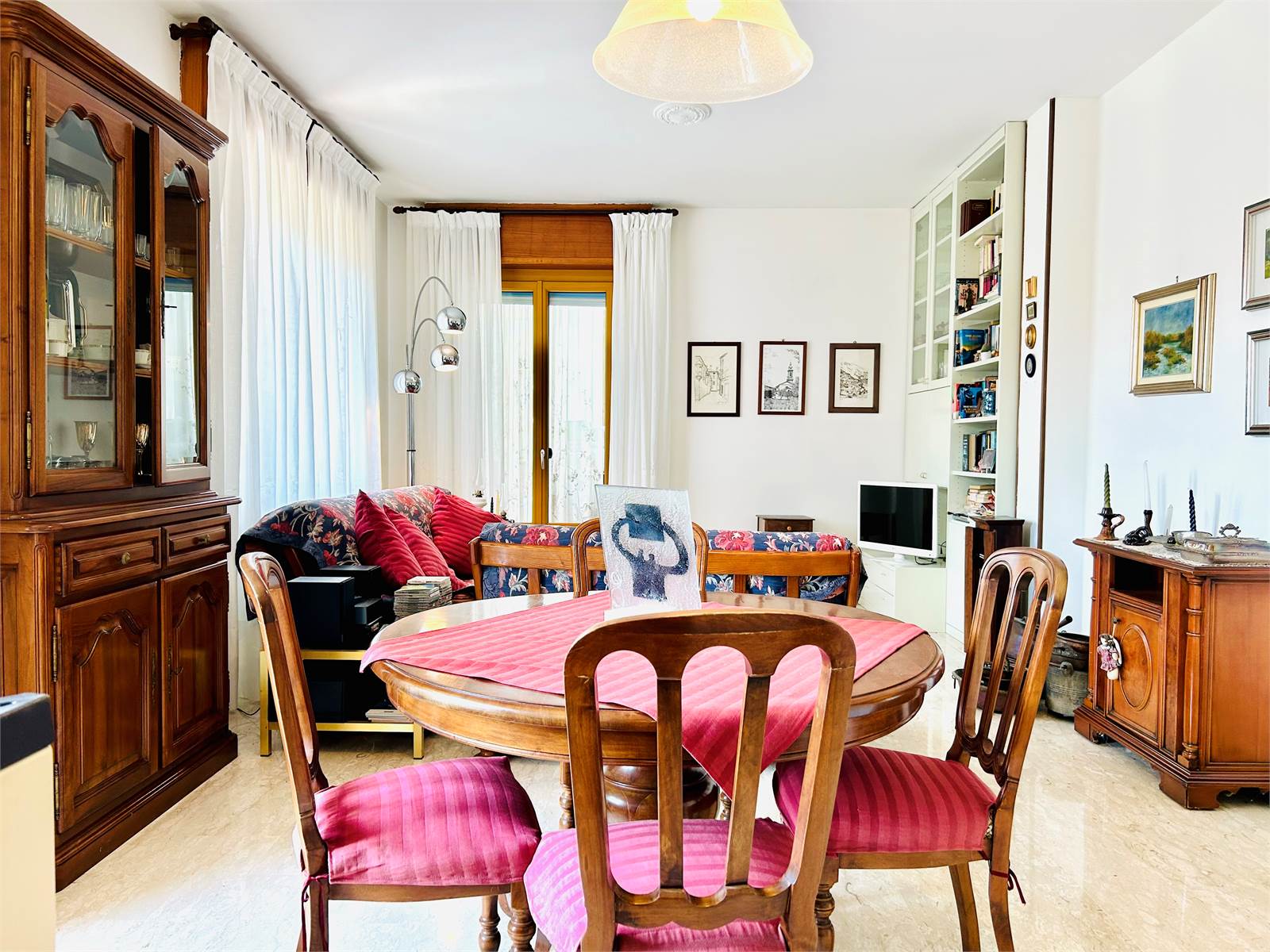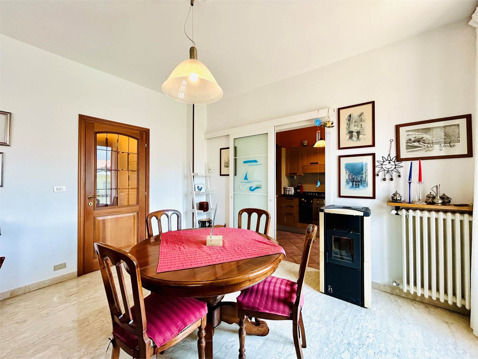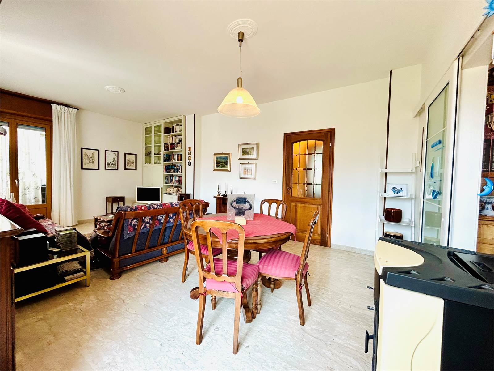 Il soggiorno misura circa 30 metri ed è molto luminoso grazie alla doppia esposizione e alle portefinestre che permettono di uscire da una parte nella veranda e frontalmente sul balcone che si estende per l'intera facciata che è panoramico sul paese e sulle montagne circostanti.