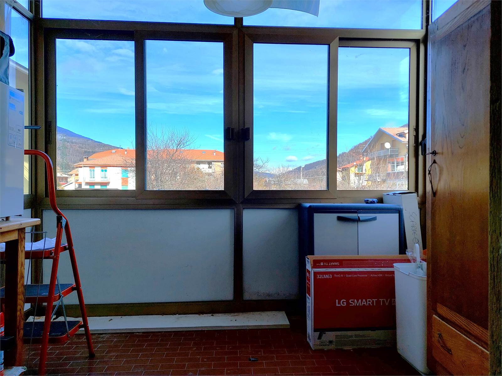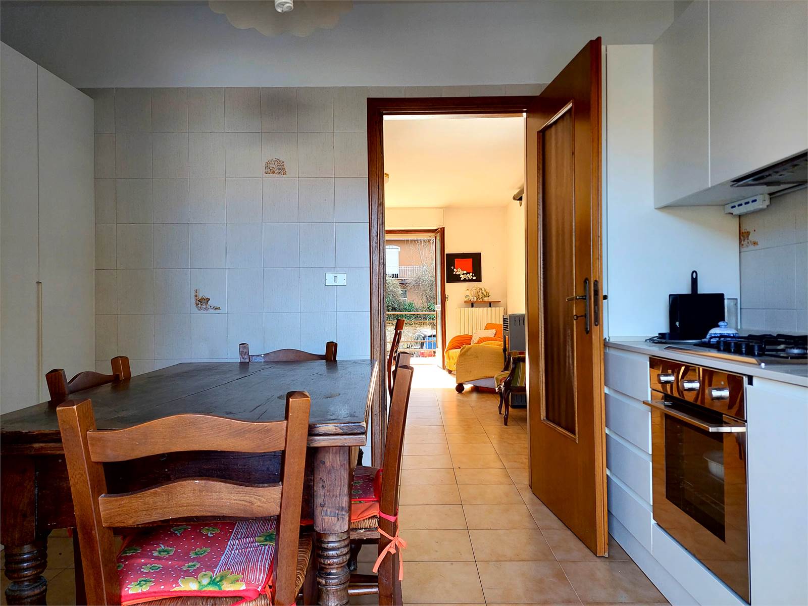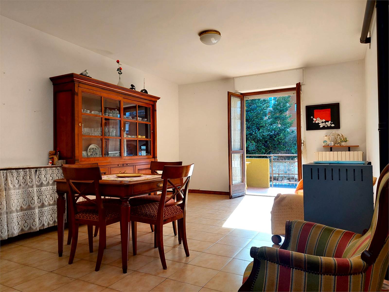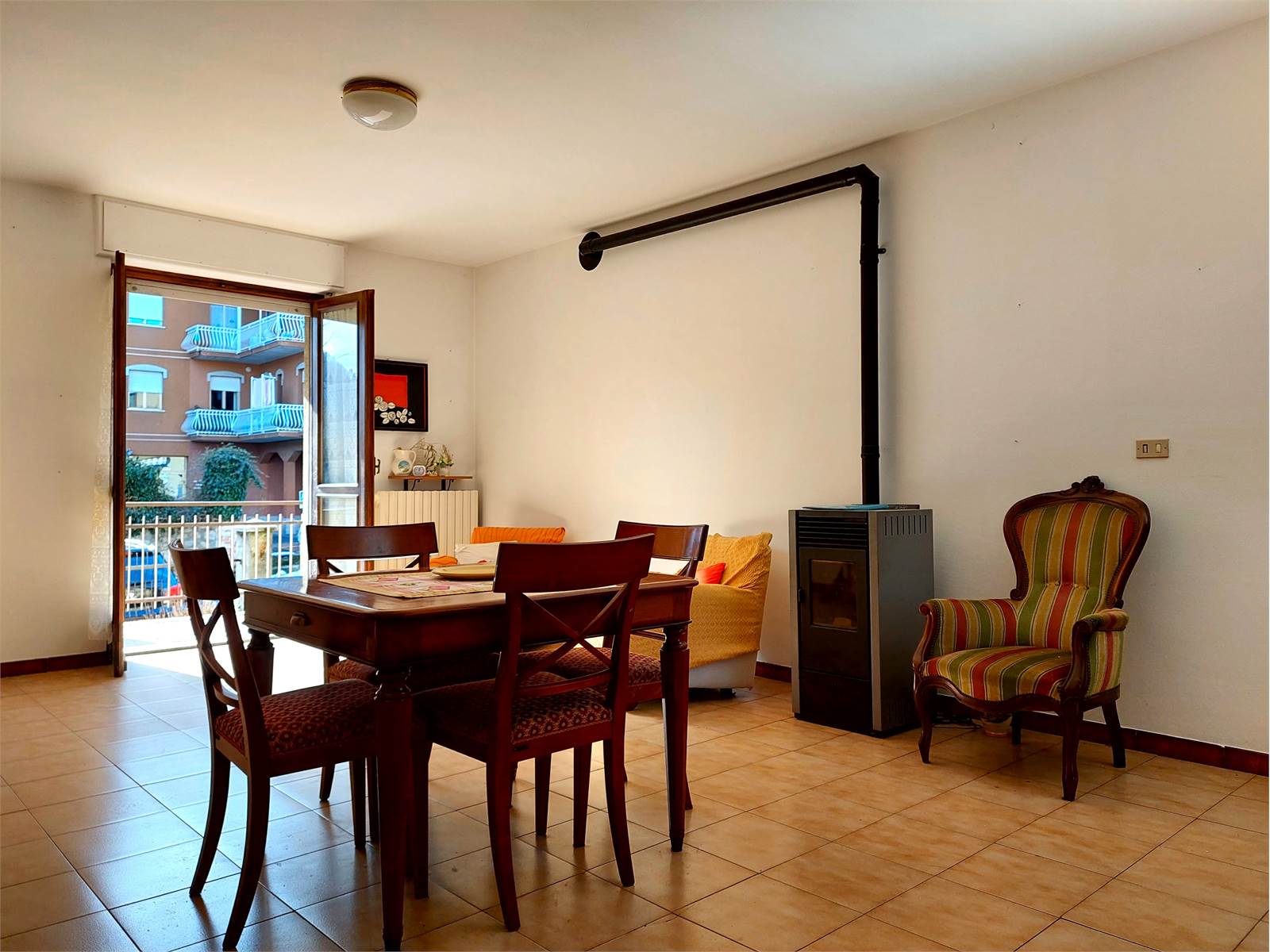 La porta d'ingresso dell'appartamento immette direttamente nel soggiorno. L'ambiente ha sfogo sul terrazzo di proprietà accessibile direttamente attraverso la porta finestra della stanza, che è accessoriata con una canna fumaria ed una stufa a pellet.