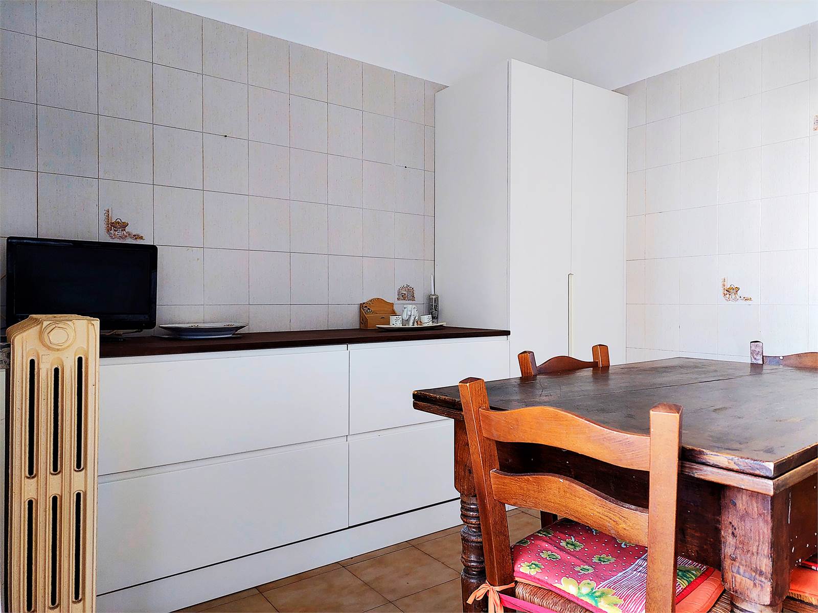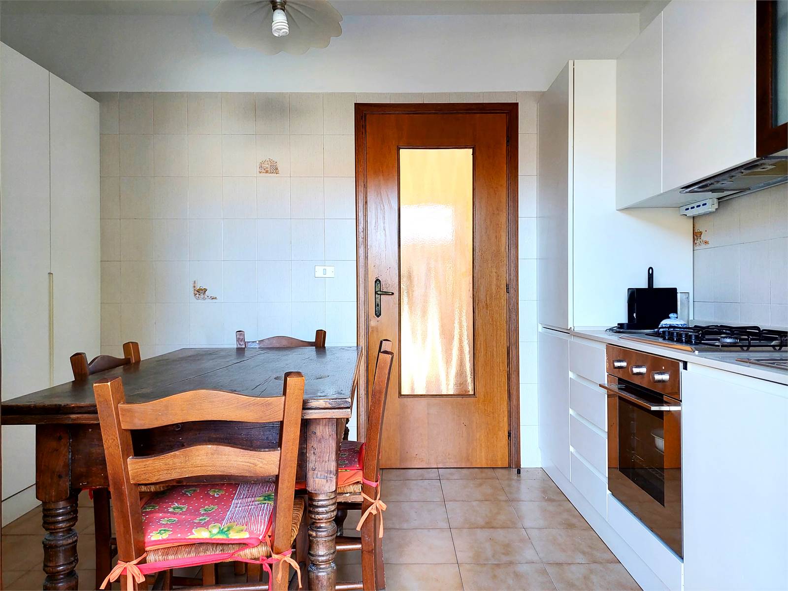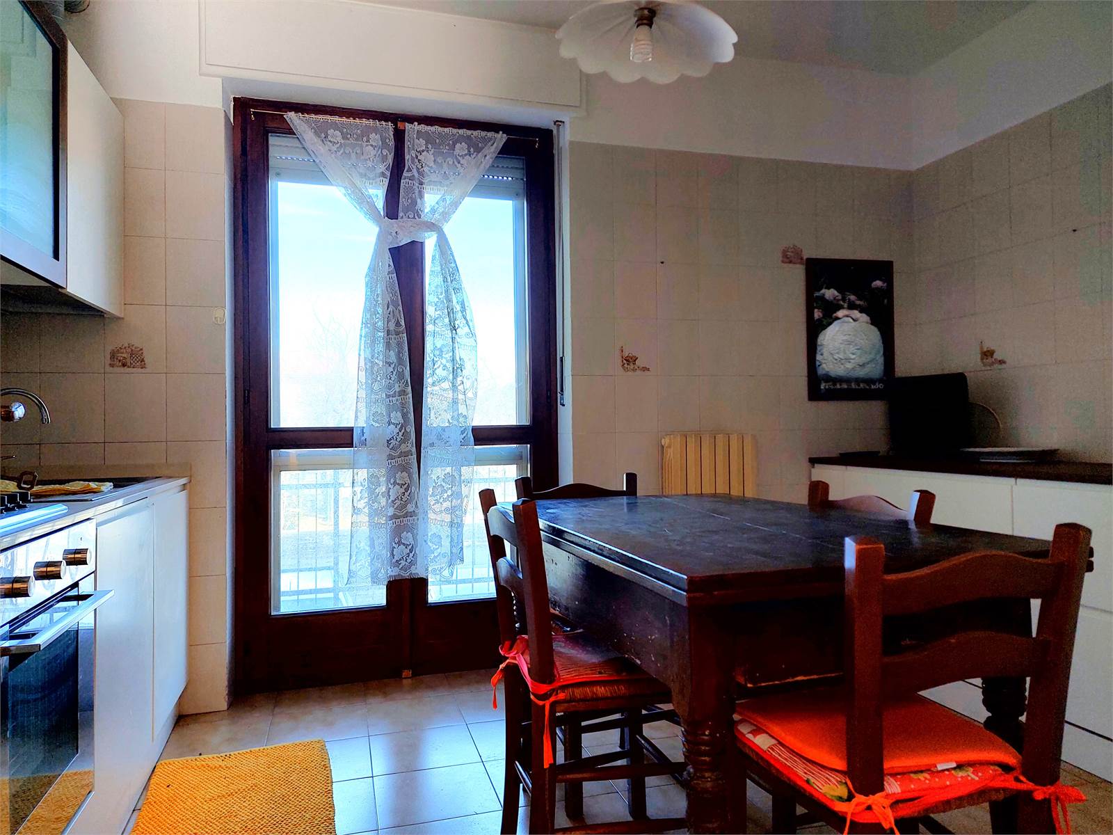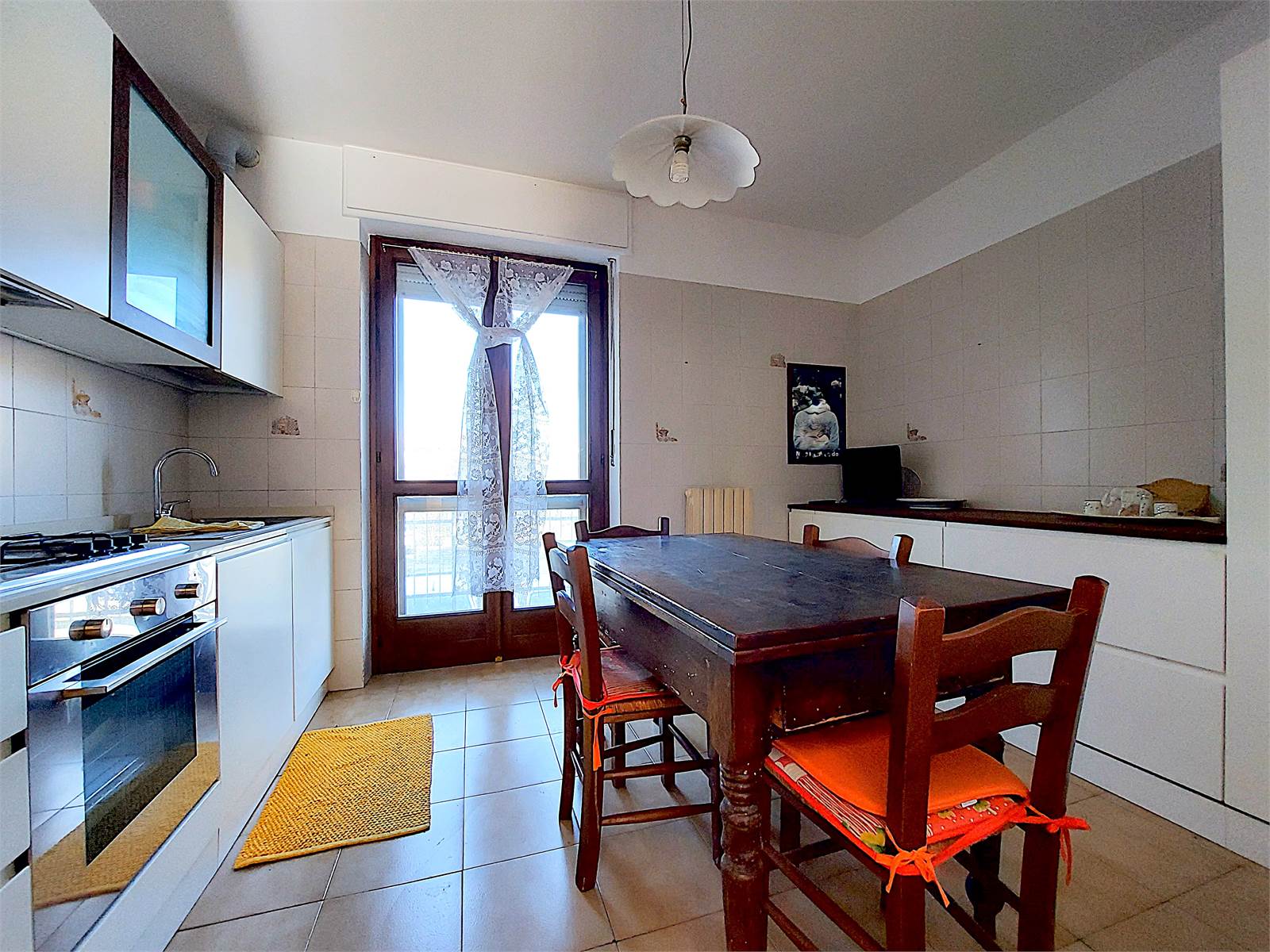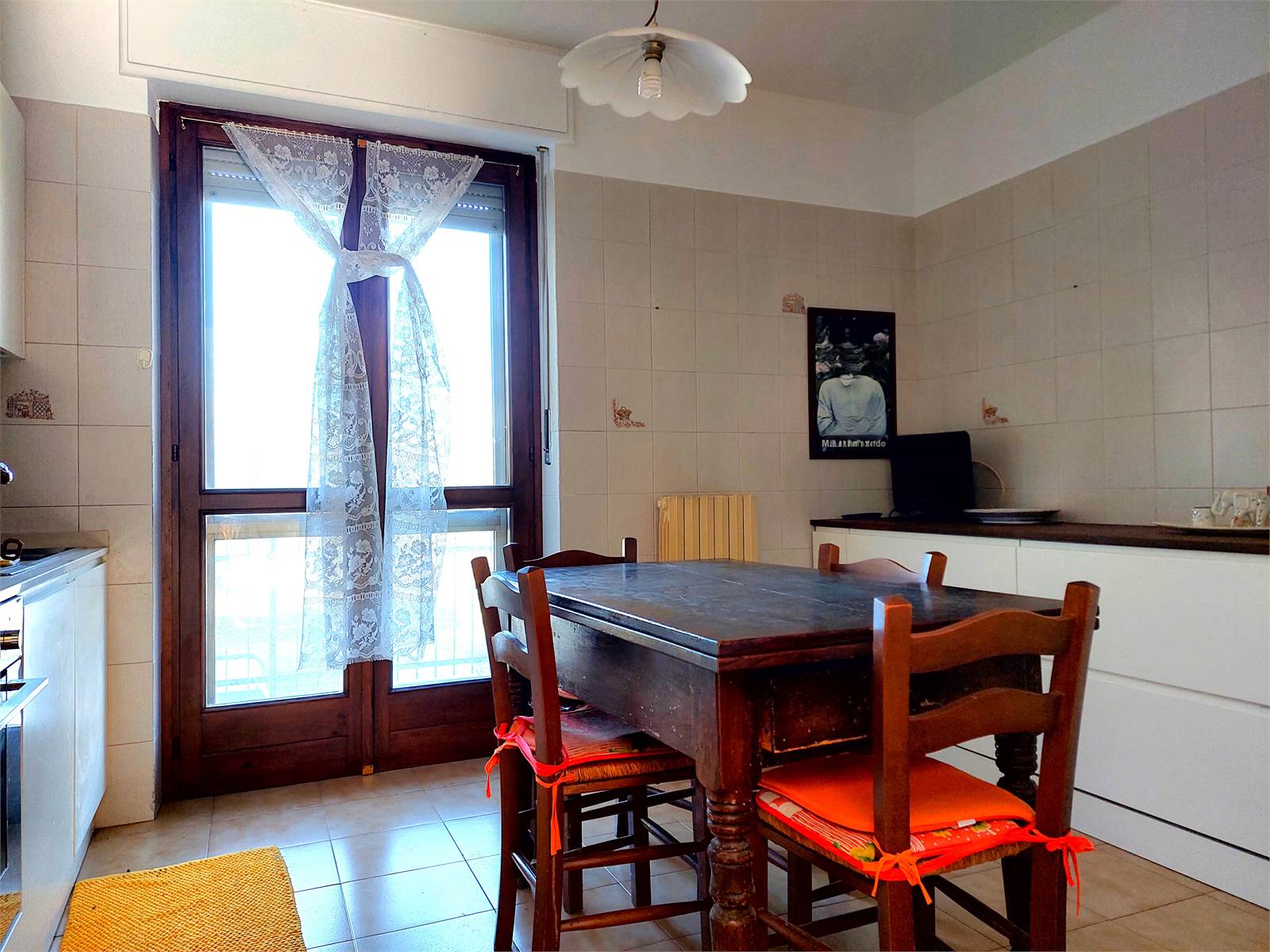 La cucina comunica con la sala ed è anch'essa dotata di porta finestra e balcone. Il vano è ammobiliato con un tavolo per quattro/sei persone ed ha due pareti attrezzate con mobili ed elettrodomestici.