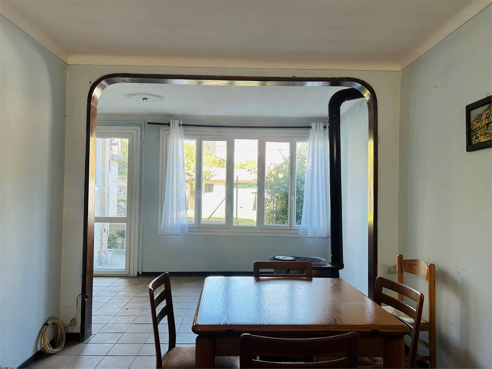 Il corridoio interno da accesso al soggiorno dotato di stufa a legna e ampia vetrata con affaccio sul giardino.