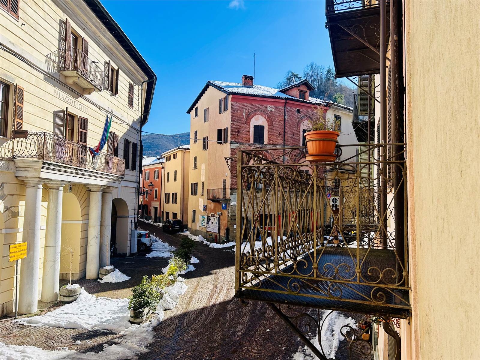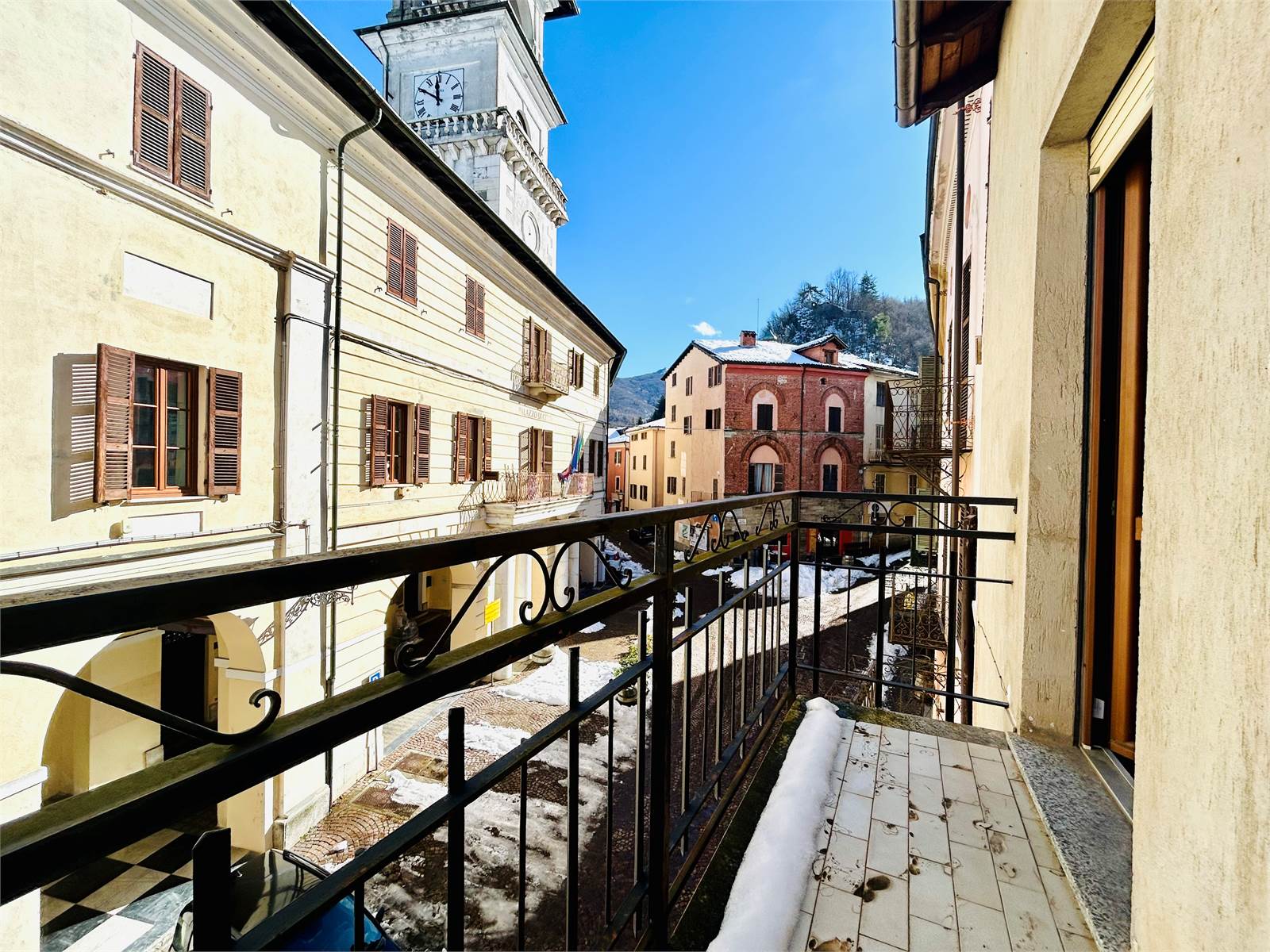 Il soggiorno è spazioso ed è aperto sull’angolo cottura, grazie alla portafinestra si esce sul balcone soleggiato che affaccia sulla piazza del Municipio.