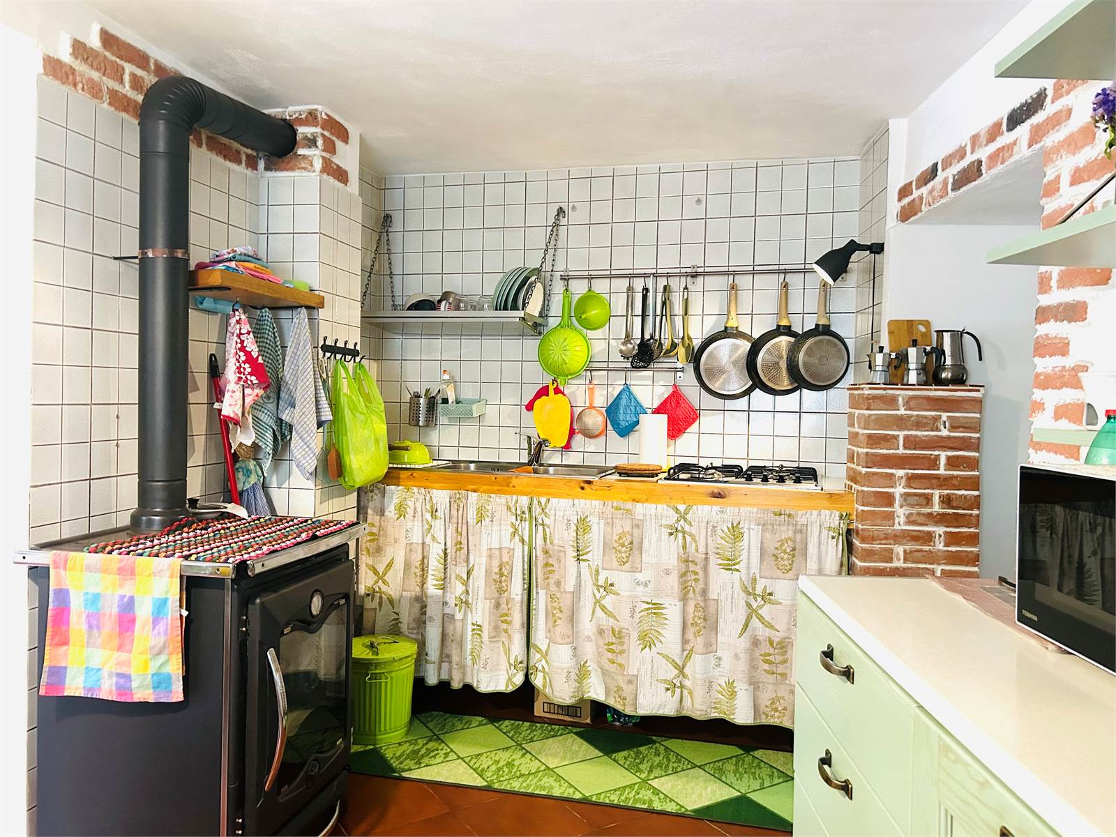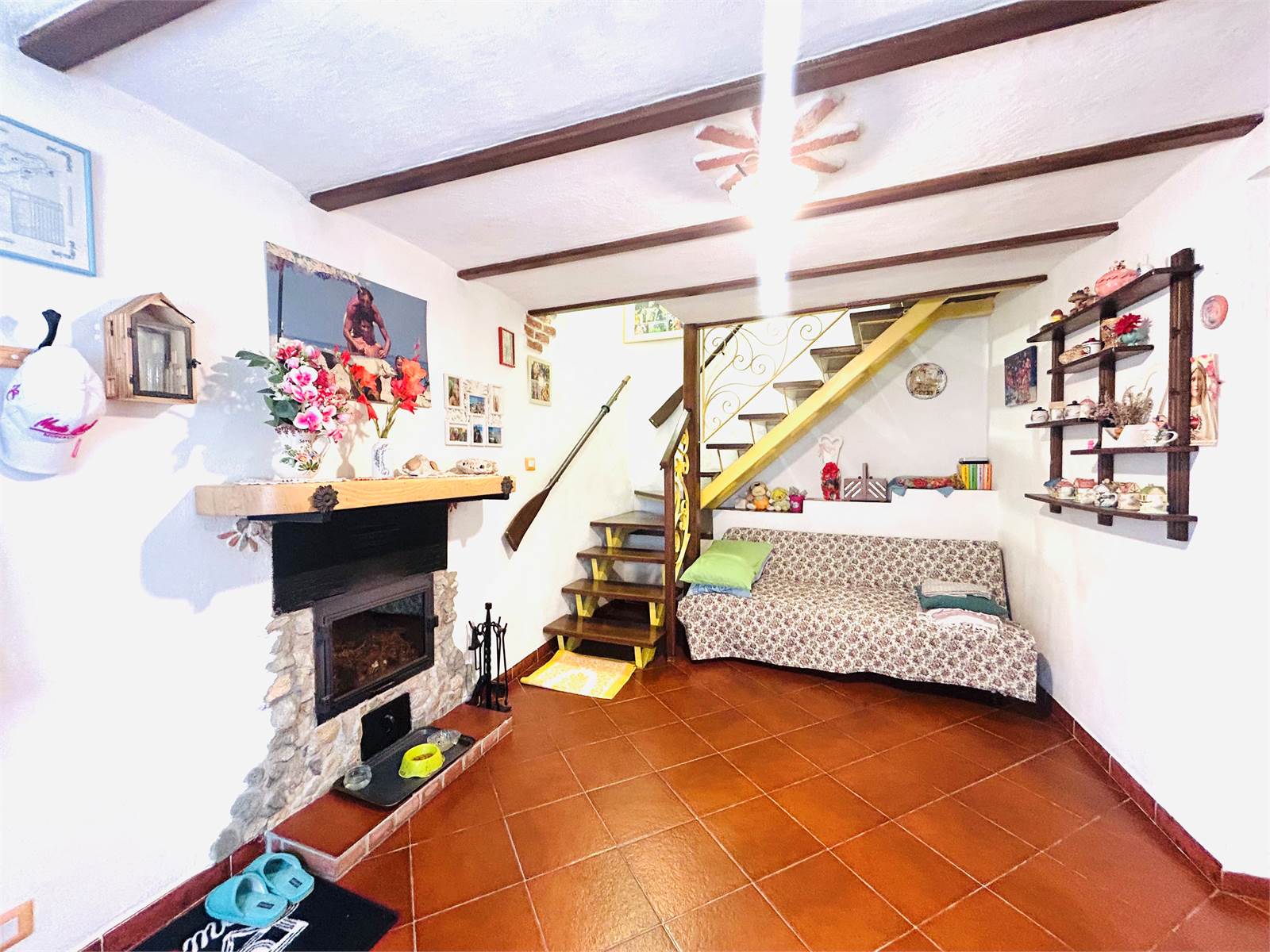 L'ingresso dal piano terra è direttamente nella zona giorno, suddivisa in piccolo angolo cottura con termo-cucina a legna e sala con camino, che rende l'ambiente molto accogliente.