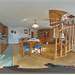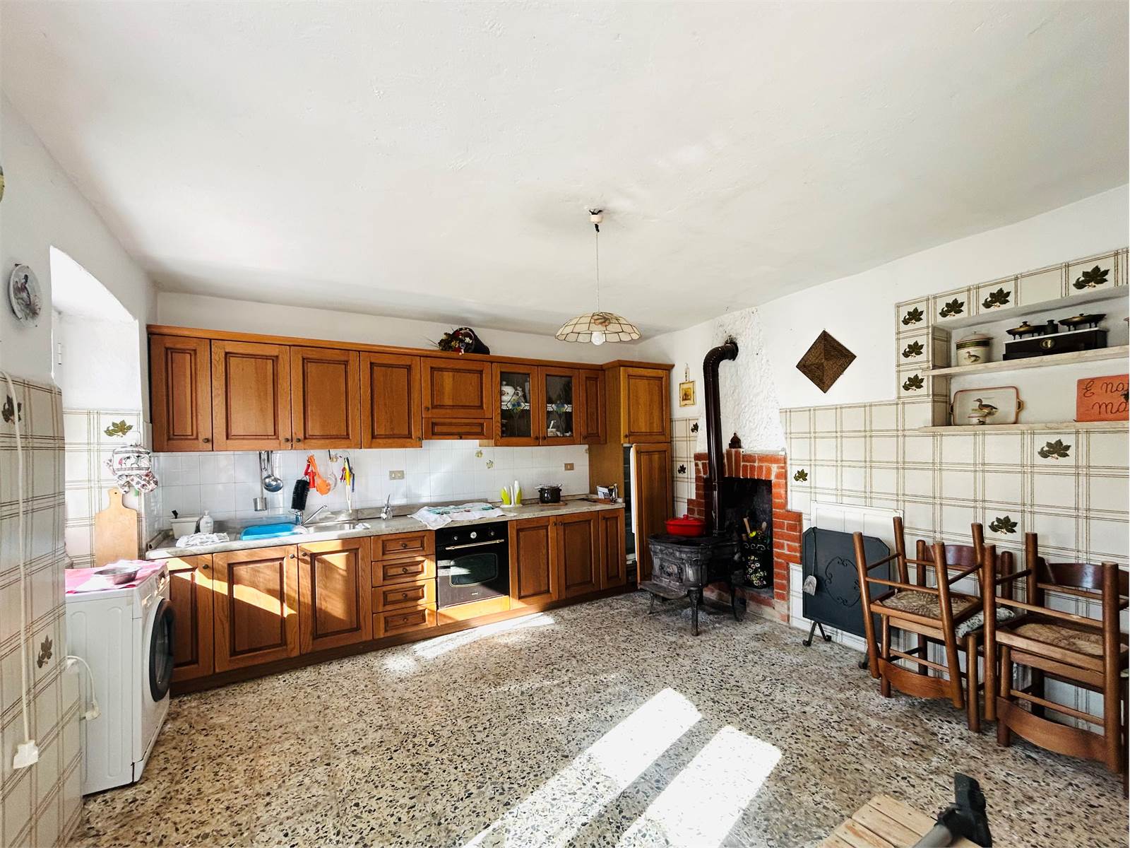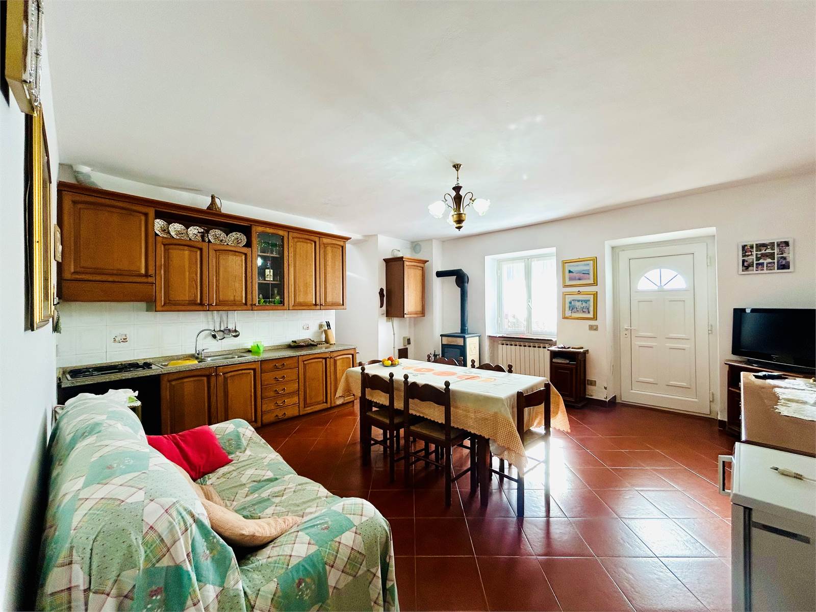 L'ingresso alla prima casa introduce all'ampia zona giorno con angolo cottura a vista e stufa a legna.