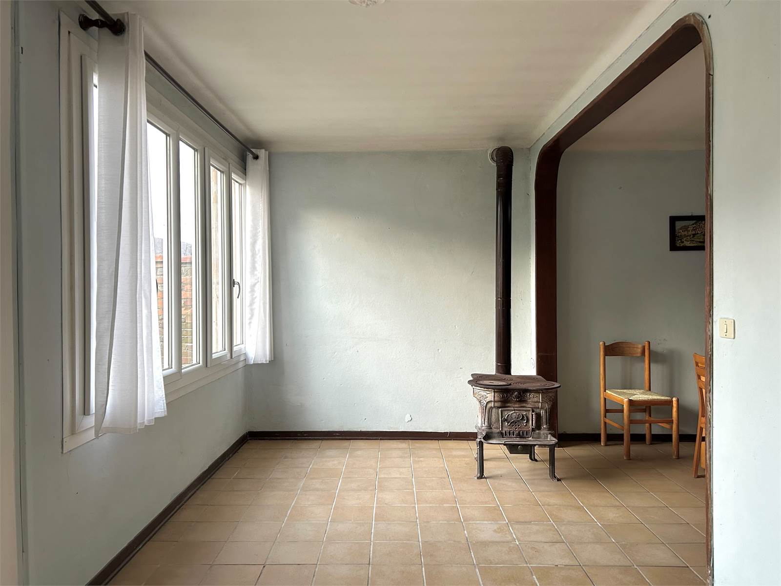 Il corridoio interno da accesso al soggiorno dotato di stufa a legna e ampia vetrata con affaccio sul giardino.