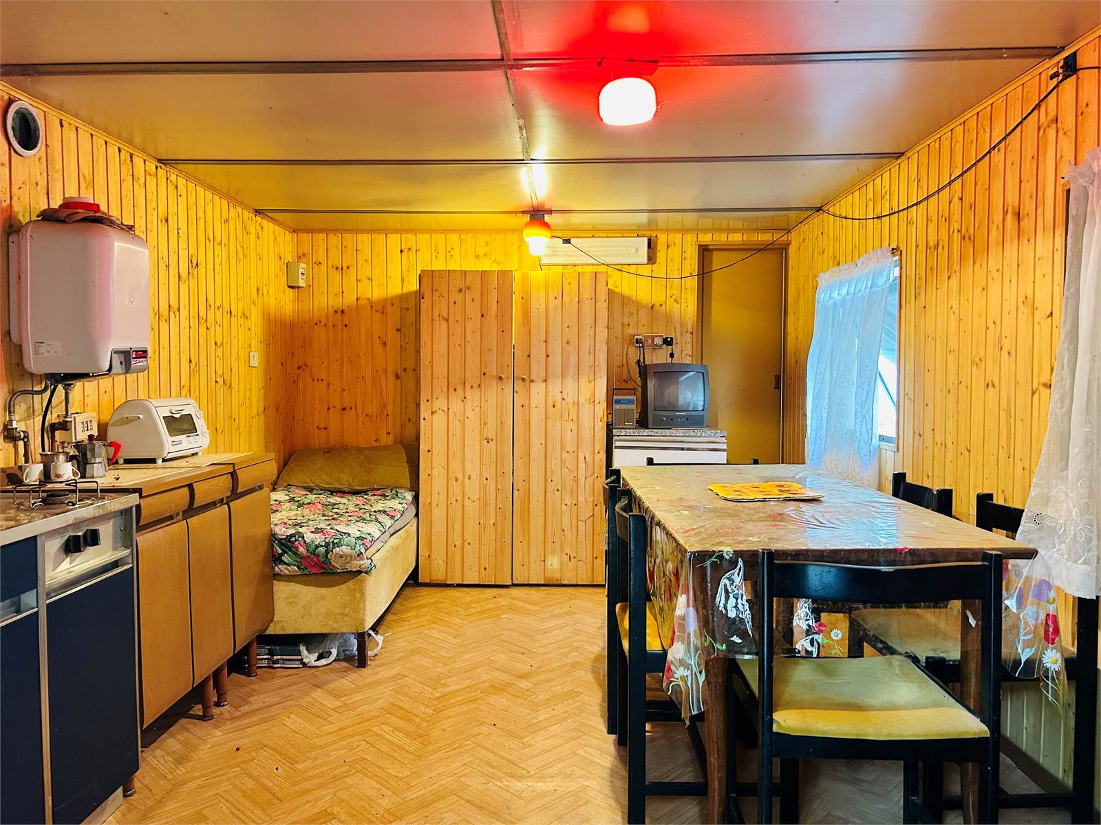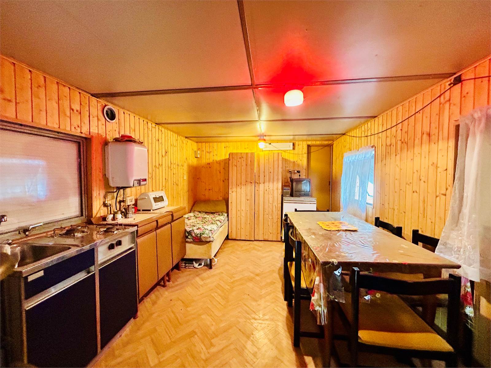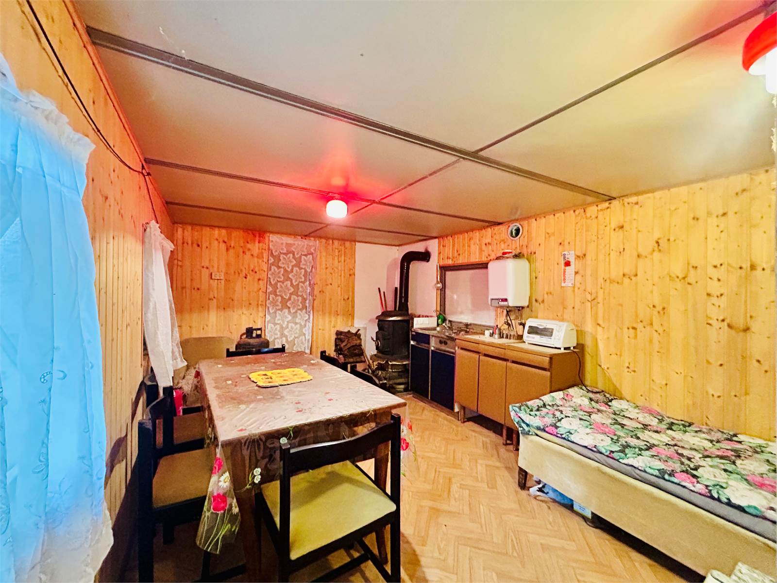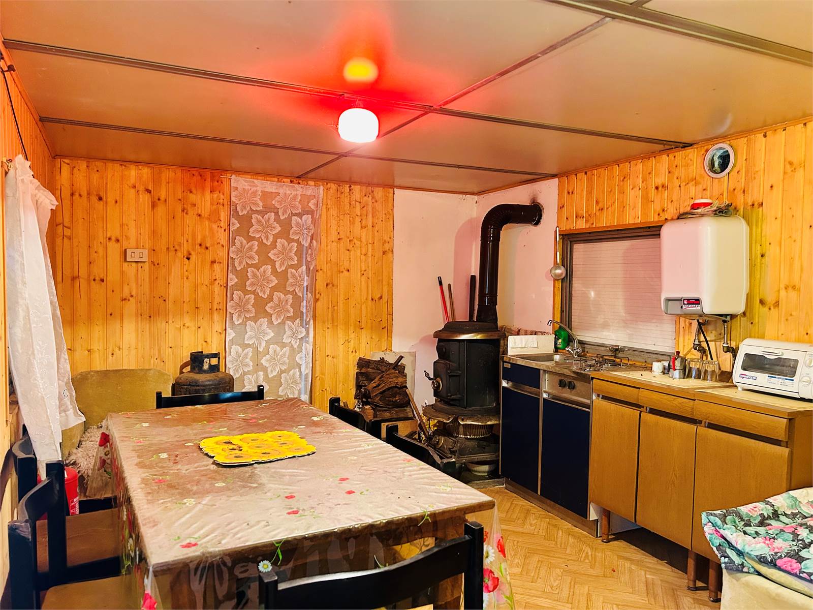 Il primo locale in cui si accede è la zona giorno, rivestita con perline in legno a vista e misura circa 16 metri. Grazie alle tre finestre è luminosa, dotata di angolo cottura con stufa a legna e tavolo da pranzo. Al suo interno è inoltre presente il boiler elettrico per l'acqua calda sanitaria. La cucina è alimentata a Gas con bombola esterna alla proprietà.