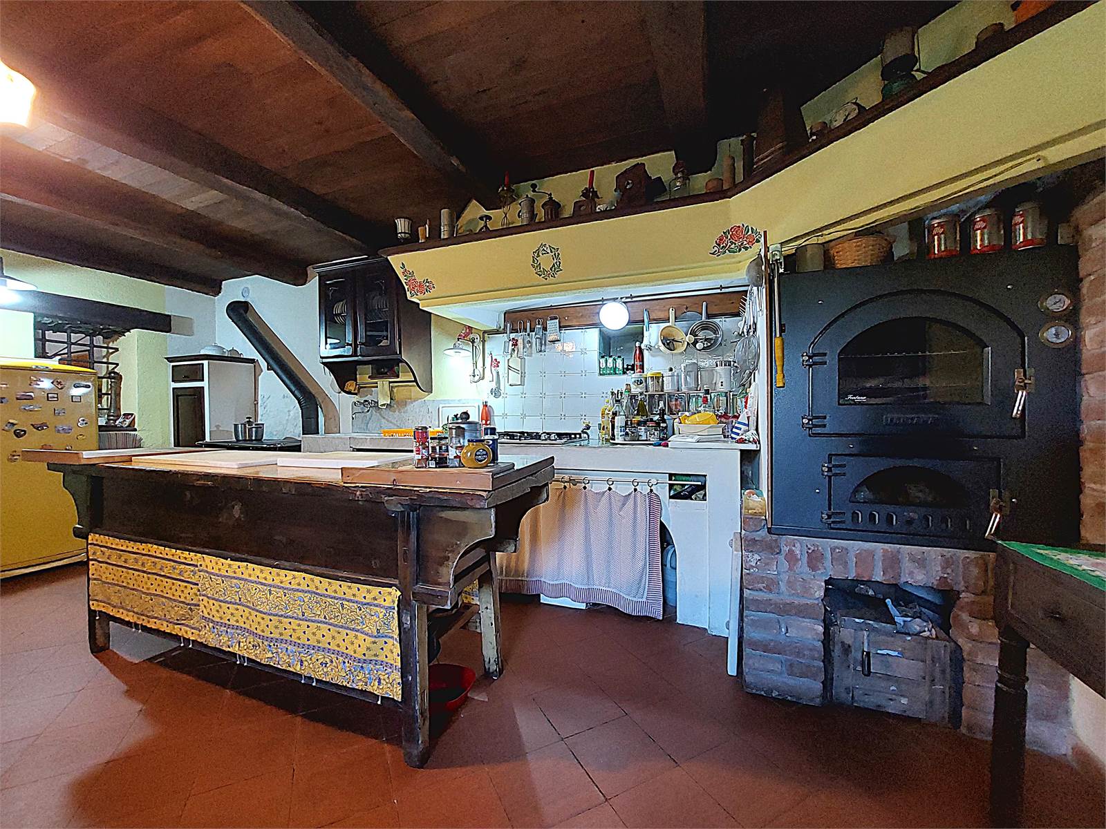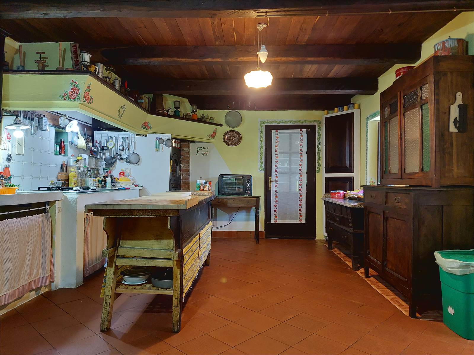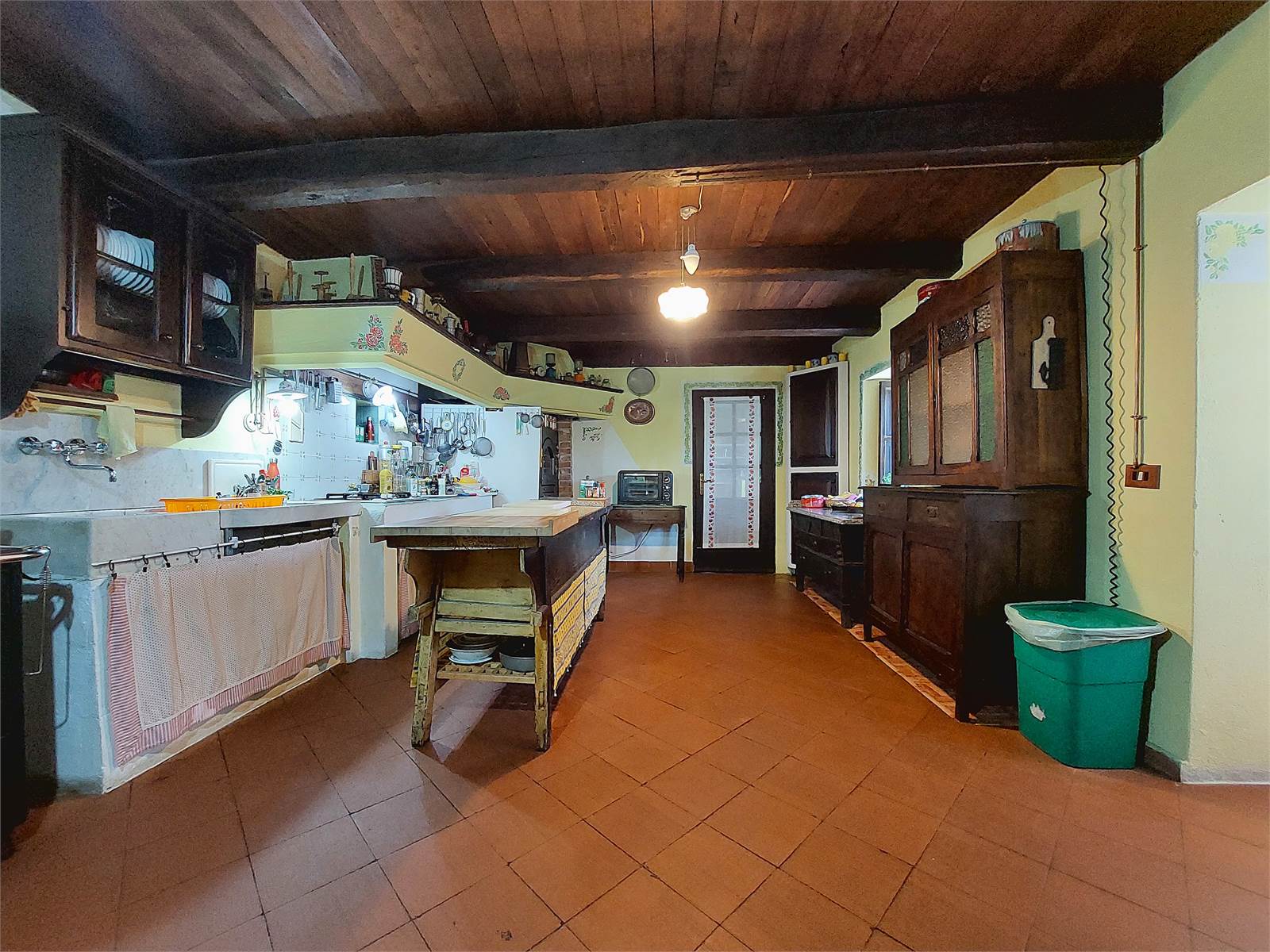 La zona giorno si sviluppa al piano terra del fabbricato. Il vano d'ingresso principale, dove ci sono le scale interne che conducono al primo piano, misura circa 15 metri quadrati, può avere diversi usi ed è aperto sul soggiorno, il quale ha il camino a legna ed ha un suo ingresso separato attraverso una veranda. La cucina, che è anch'essa dotata di ingresso separato dall'esterno, misura oltre 20 metri quadrati ed ha il piano di lavoro in muratura ed il lavandino d'epoca in marmo, oltre ad essere accessoriata con forno a legna. La zona giorno è caratterizzata da antichi pavimenti in cotto e soffitti in legno originali restaurati. Sono infine presenti un bagno con finestra e doccia ed un ripostiglio sfruttato come lavanderia. Ogni stanza del piano terra ha accesso diretto al giardino che si trova di fronte alla casa e dove è presente un forno a legna in muratura.