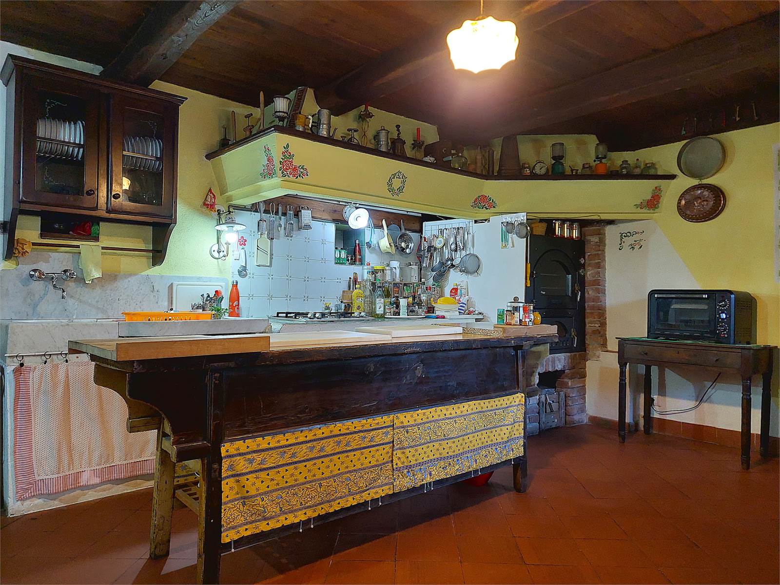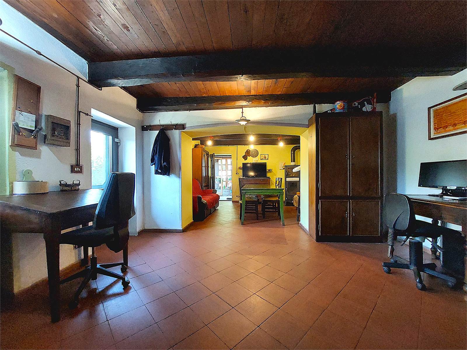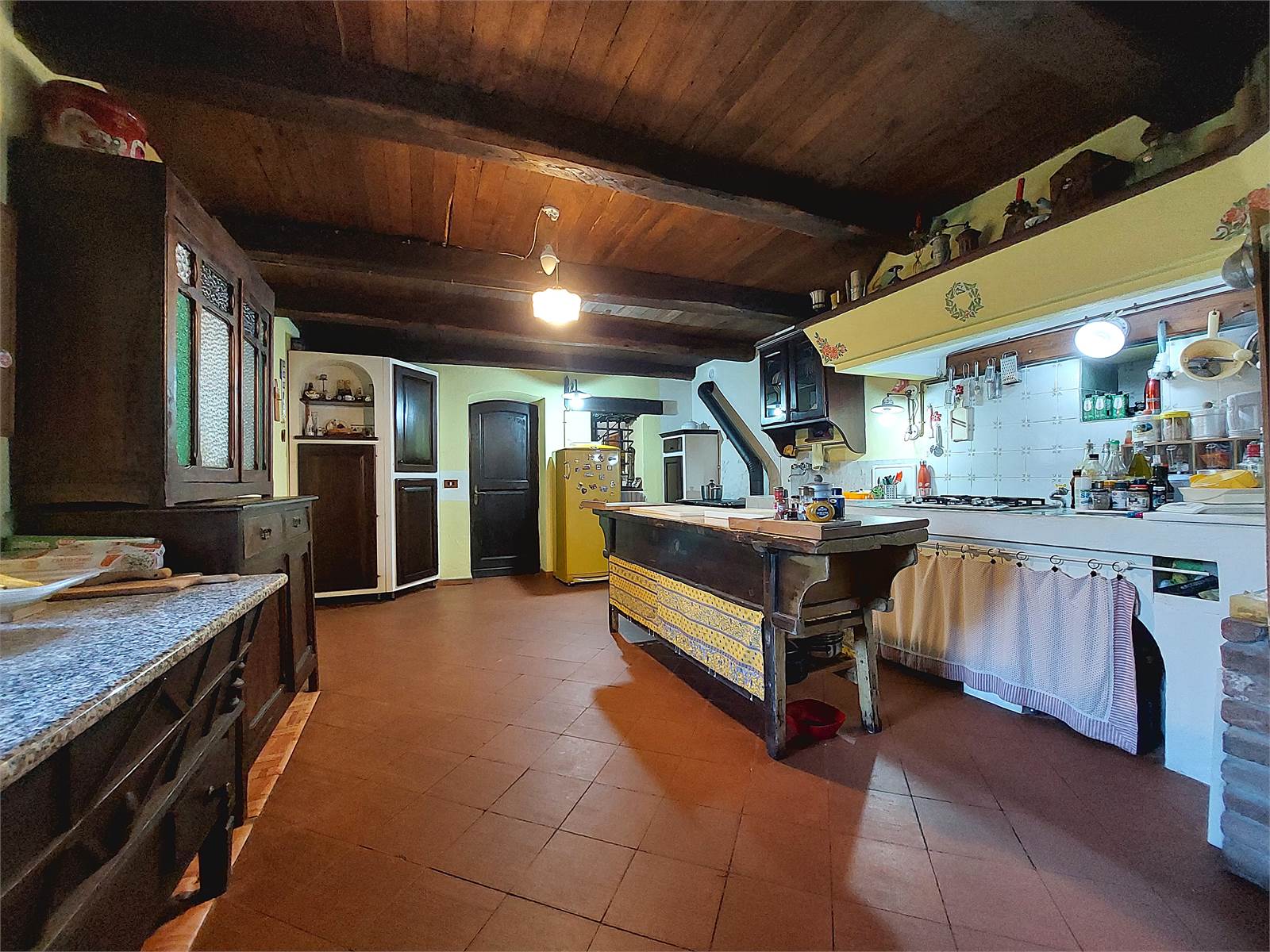 La zona giorno si sviluppa al piano terra del fabbricato. Il vano d'ingresso principale, dove ci sono le scale interne che conducono al primo piano, misura circa 15 metri quadrati, può avere diversi usi ed è aperto sul soggiorno, il quale ha il camino a legna ed ha un suo ingresso separato attraverso una veranda. La cucina, che è anch'essa dotata di ingresso separato dall'esterno, misura oltre 20 metri quadrati ed ha il piano di lavoro in muratura ed il lavandino d'epoca in marmo, oltre ad essere accessoriata con forno a legna. La zona giorno è caratterizzata da antichi pavimenti in cotto e soffitti in legno originali restaurati. Sono infine presenti un bagno con finestra e doccia ed un ripostiglio sfruttato come lavanderia. Ogni stanza del piano terra ha accesso diretto al giardino che si trova di fronte alla casa e dove è presente un forno a legna in muratura.