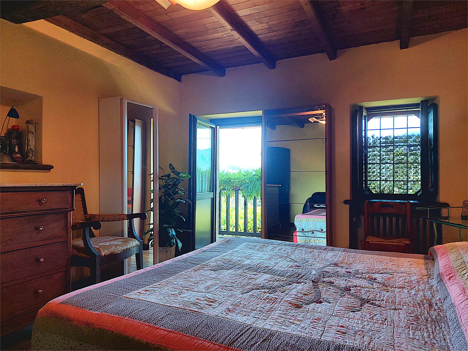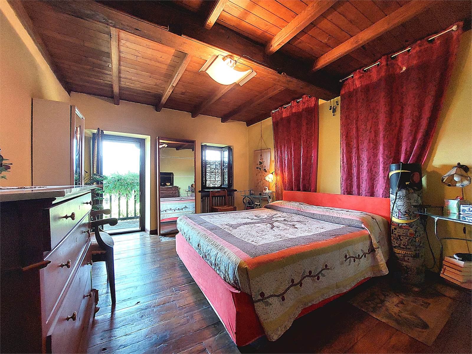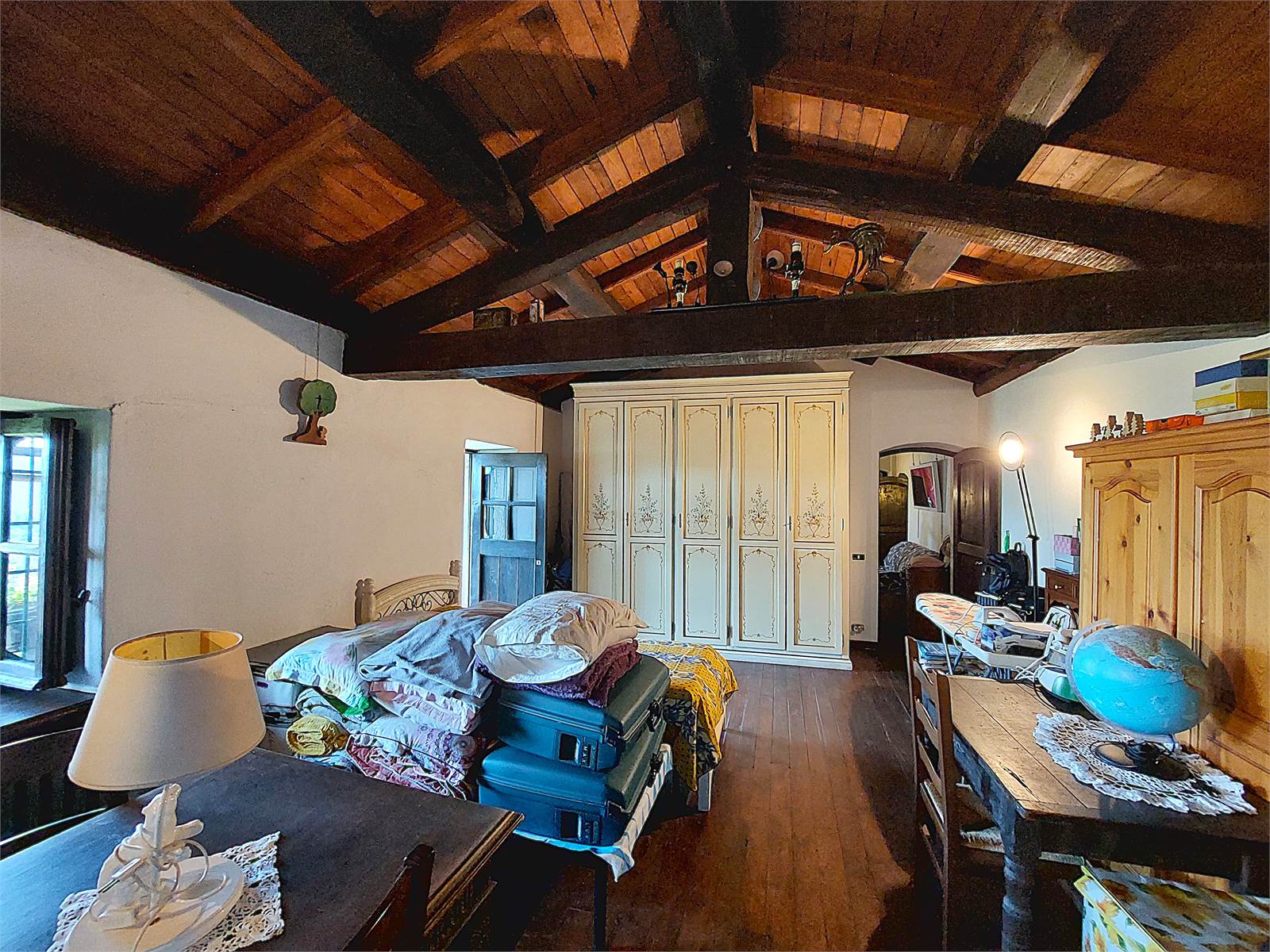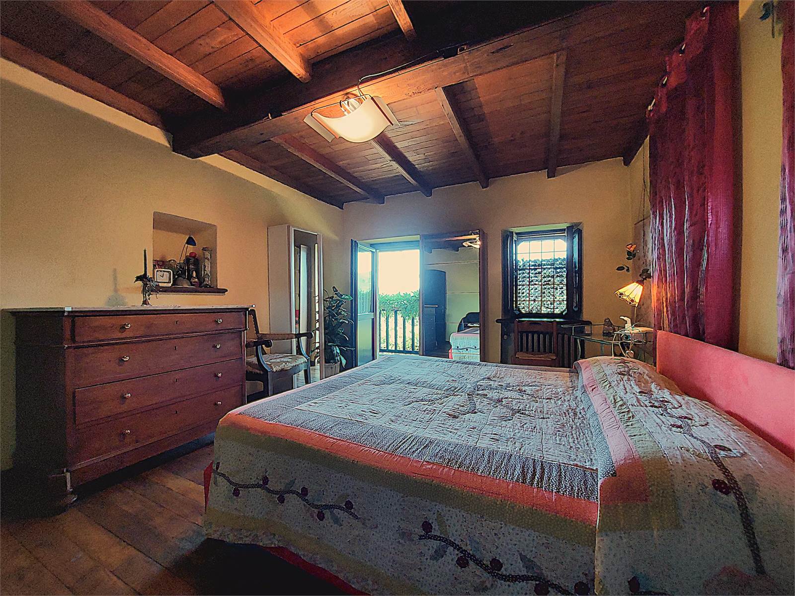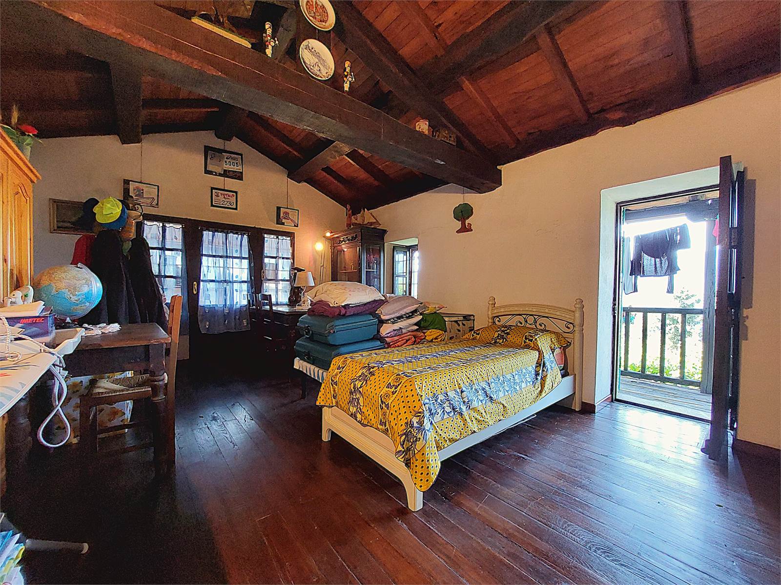 La scala interna conduce al primo piano dove si sviluppa la zona notte. Sono presenti tre grandi camere, ognuna delle quali ha sfogo sul balcone in legno che si estende per tutta la larghezza della facciata dell'abitazione. La vista è aperta sulla vallata e sulle montagne. Al primo piano è anche presente un bagno con finestra e vasca. Gli ambienti della zona notte sono caratterizzati da pavimenti e soffitti in tavolato e travi di legno d'epoca restaurati.