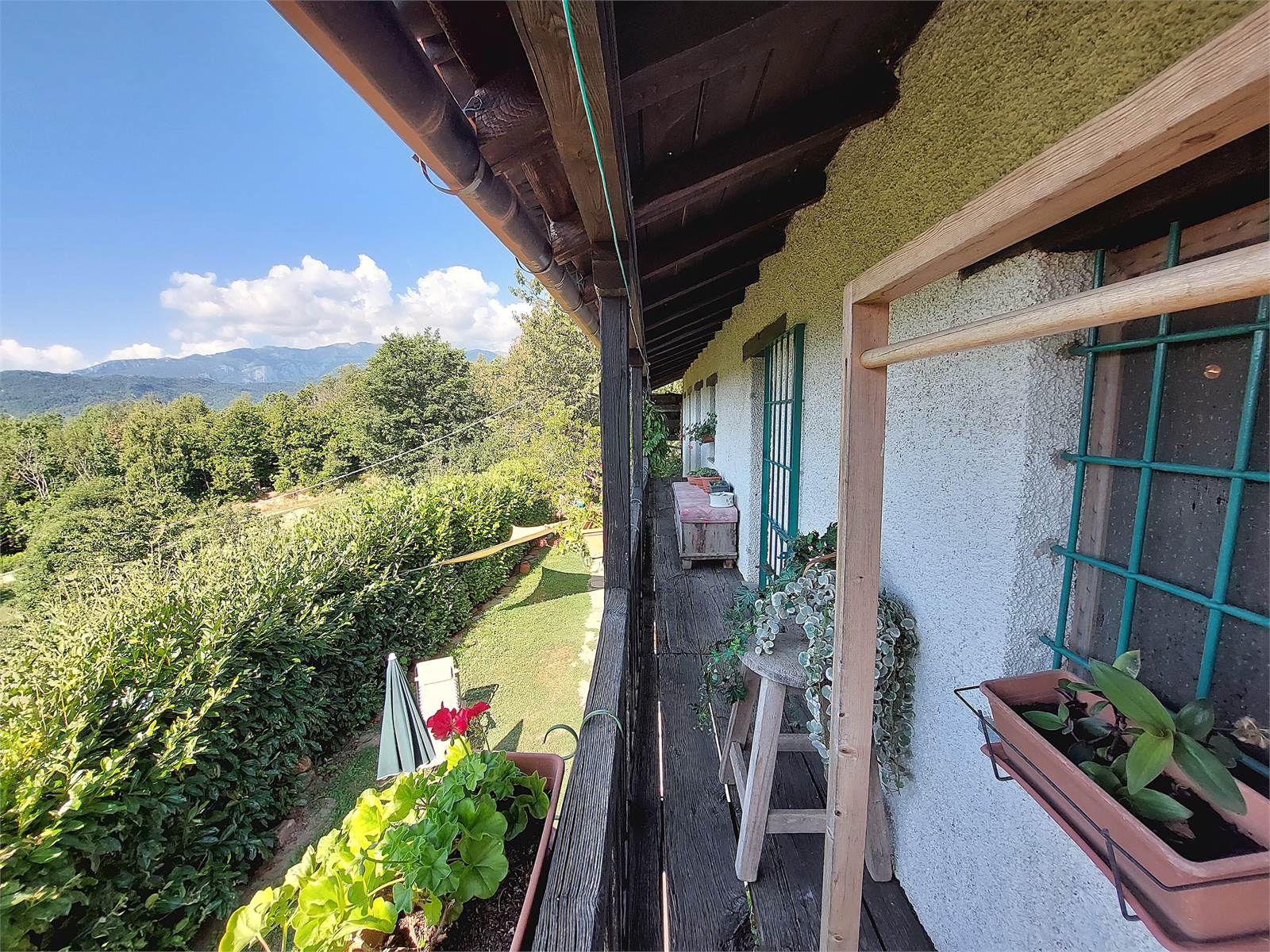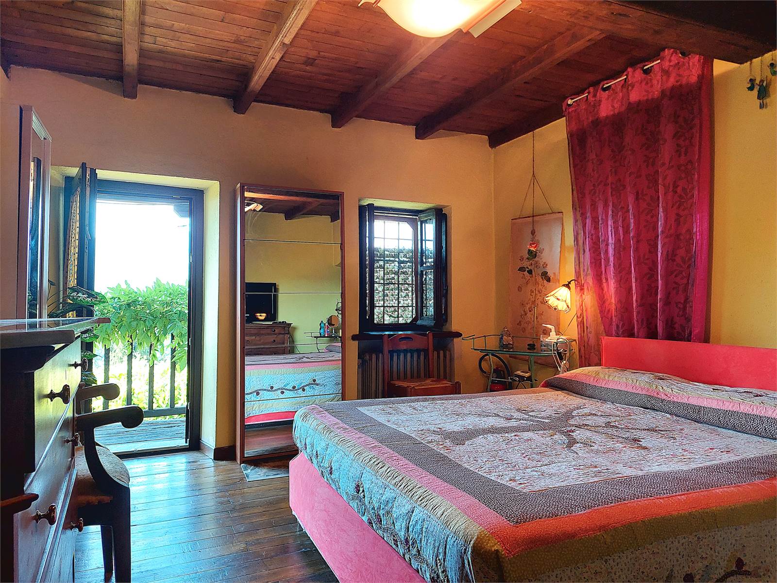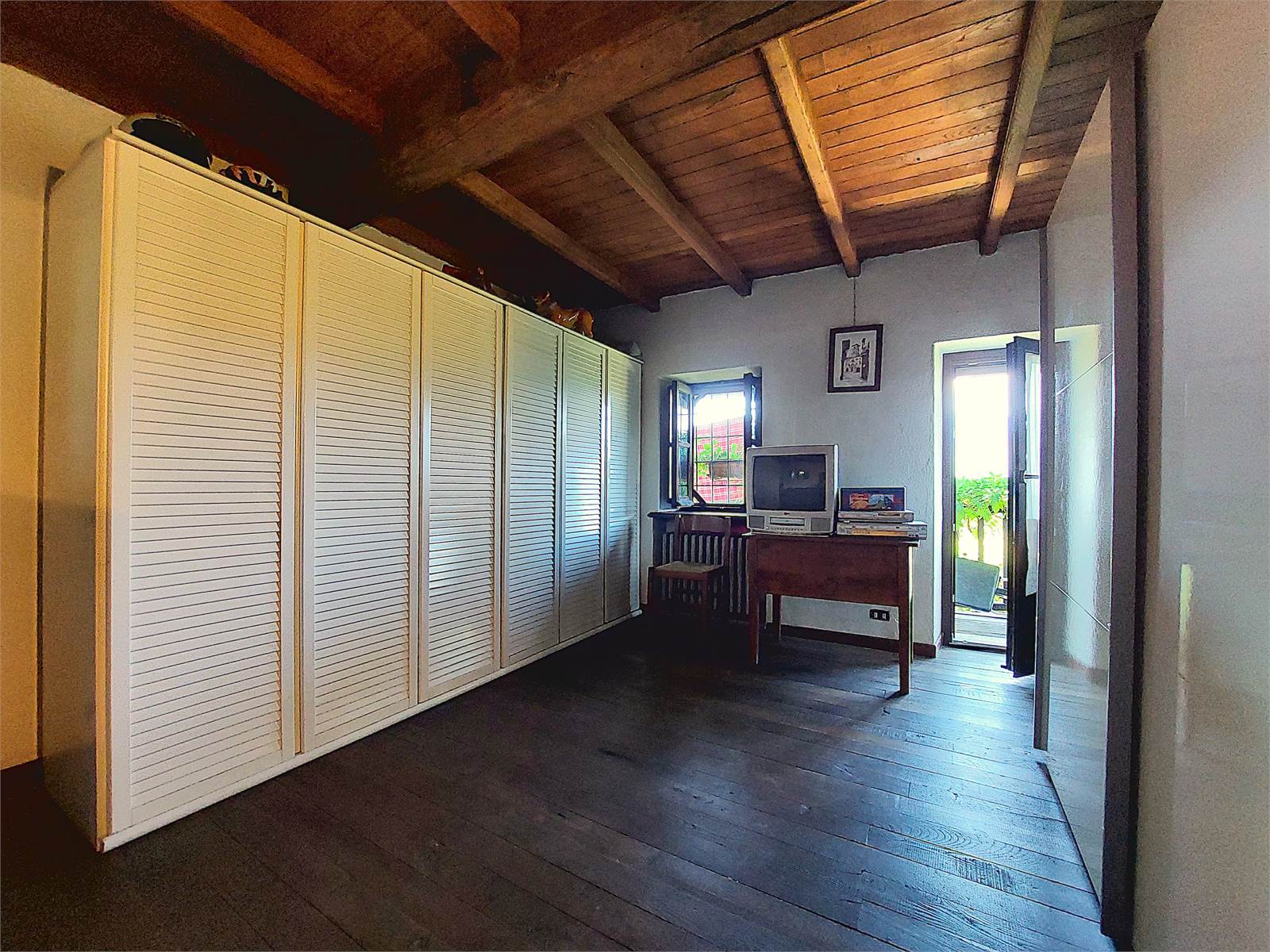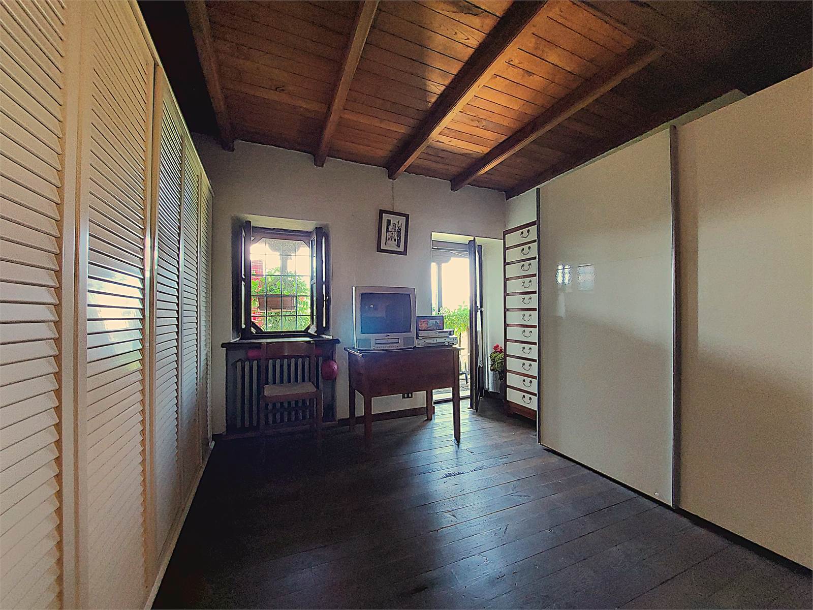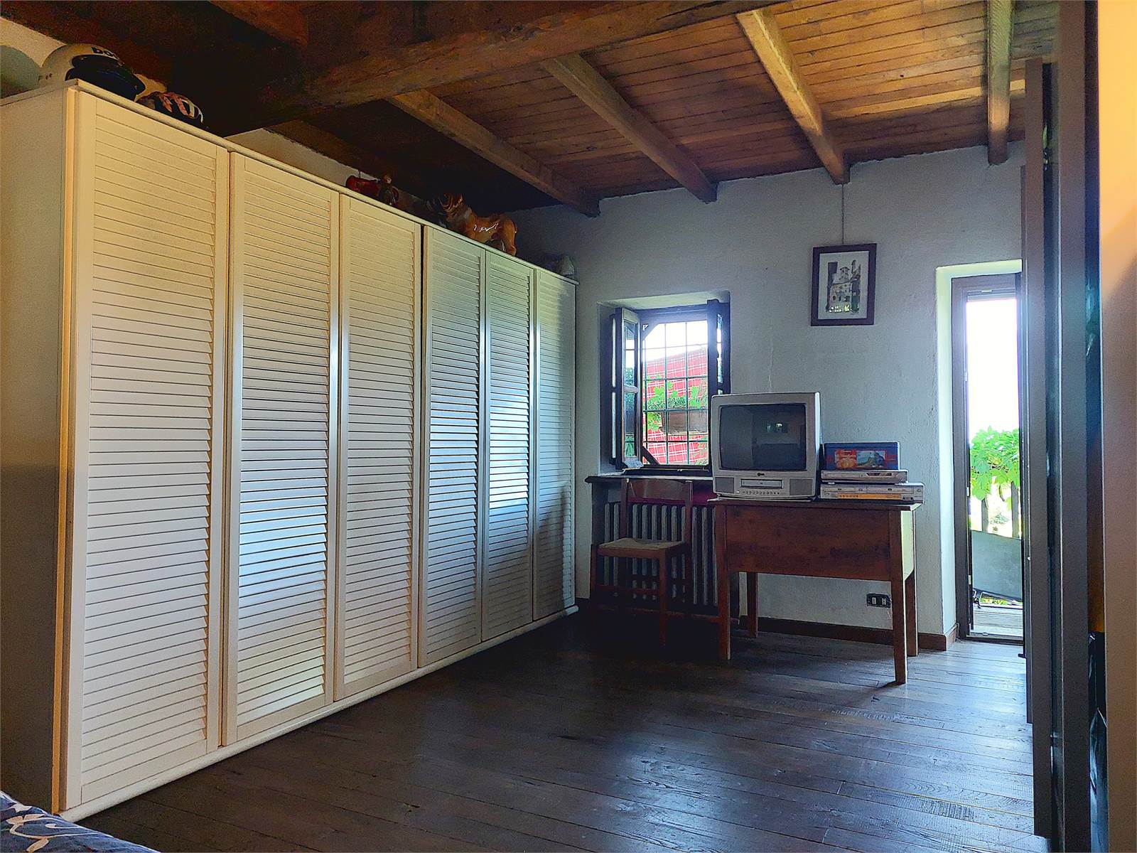 La scala interna conduce al primo piano dove si sviluppa la zona notte. Sono presenti tre grandi camere, ognuna delle quali ha sfogo sul balcone in legno che si estende per tutta la larghezza della facciata dell'abitazione. La vista è aperta sulla vallata e sulle montagne. Al primo piano è anche presente un bagno con finestra e vasca. Gli ambienti della zona notte sono caratterizzati da pavimenti e soffitti in tavolato e travi di legno d'epoca restaurati.