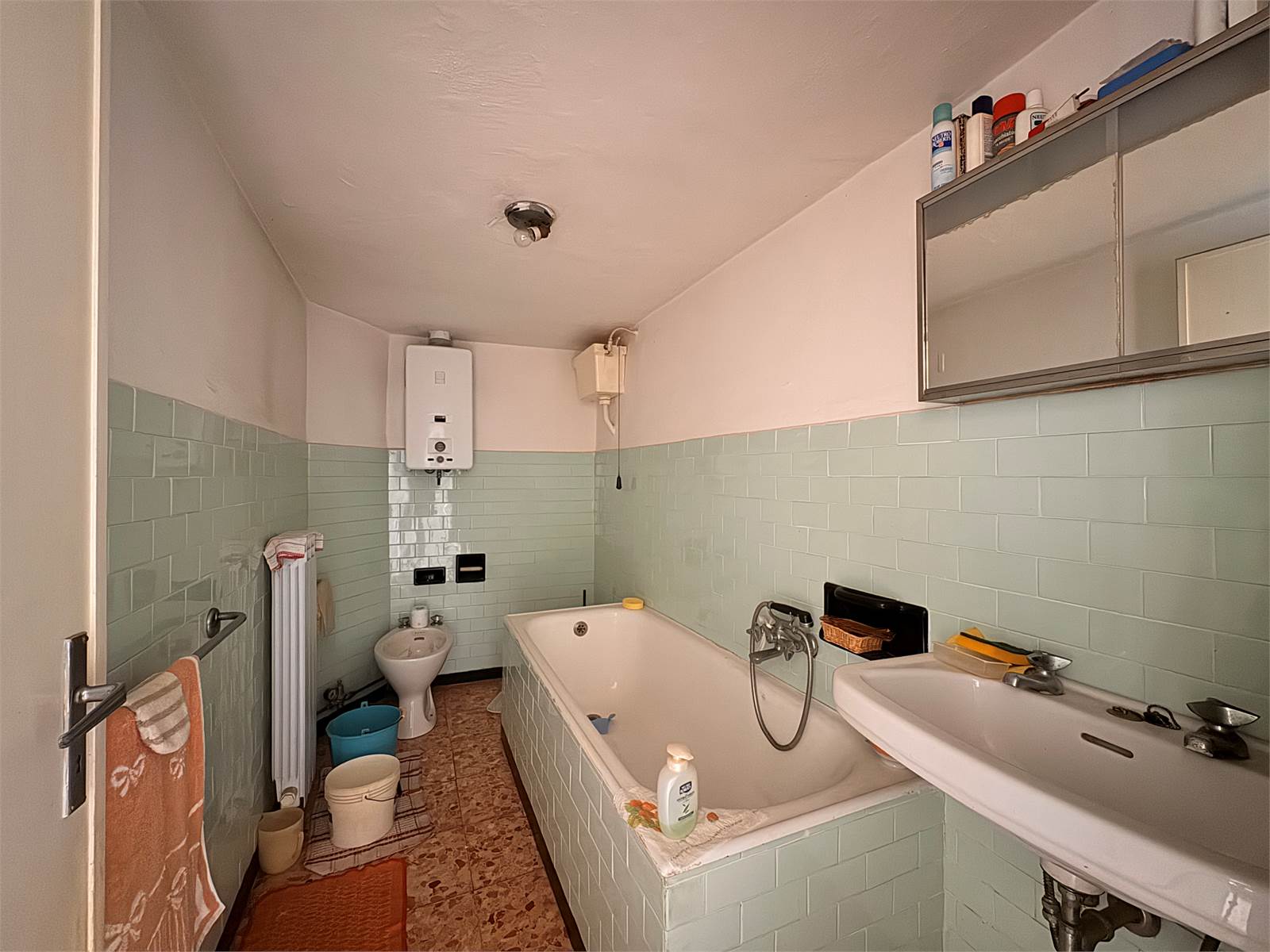 Al primo piano, il secondo appartamento offre una disposizione simile, con ingresso su una cucina abitabile e due ulteriori stanze dapprima utilizzate come camere da letto, una delle quali accessoriate con un piccolo bagno di servizio, L'appartamento è ulteriormente valorizzato da un balconcino che affaccia sulla piazza principale del paese. Inoltre, un ripostiglio collega l’appartamento al sottotetto non abitabile, accessibile tramite una scala.