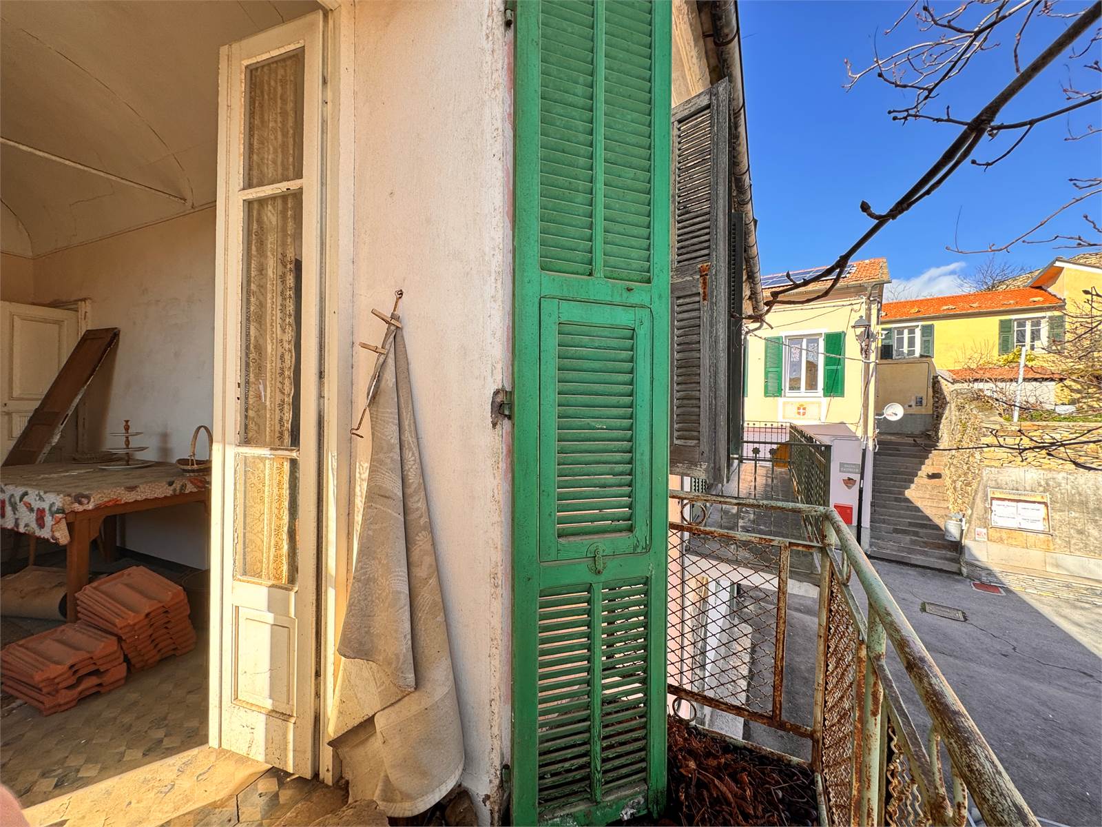 Al primo piano, il secondo appartamento offre una disposizione simile, con ingresso su una cucina abitabile e due ulteriori stanze dapprima utilizzate come camere da letto, una delle quali accessoriate con un piccolo bagno di servizio, L'appartamento è ulteriormente valorizzato da un balconcino che affaccia sulla piazza principale del paese. Inoltre, un ripostiglio collega l’appartamento al sottotetto non abitabile, accessibile tramite una scala.
