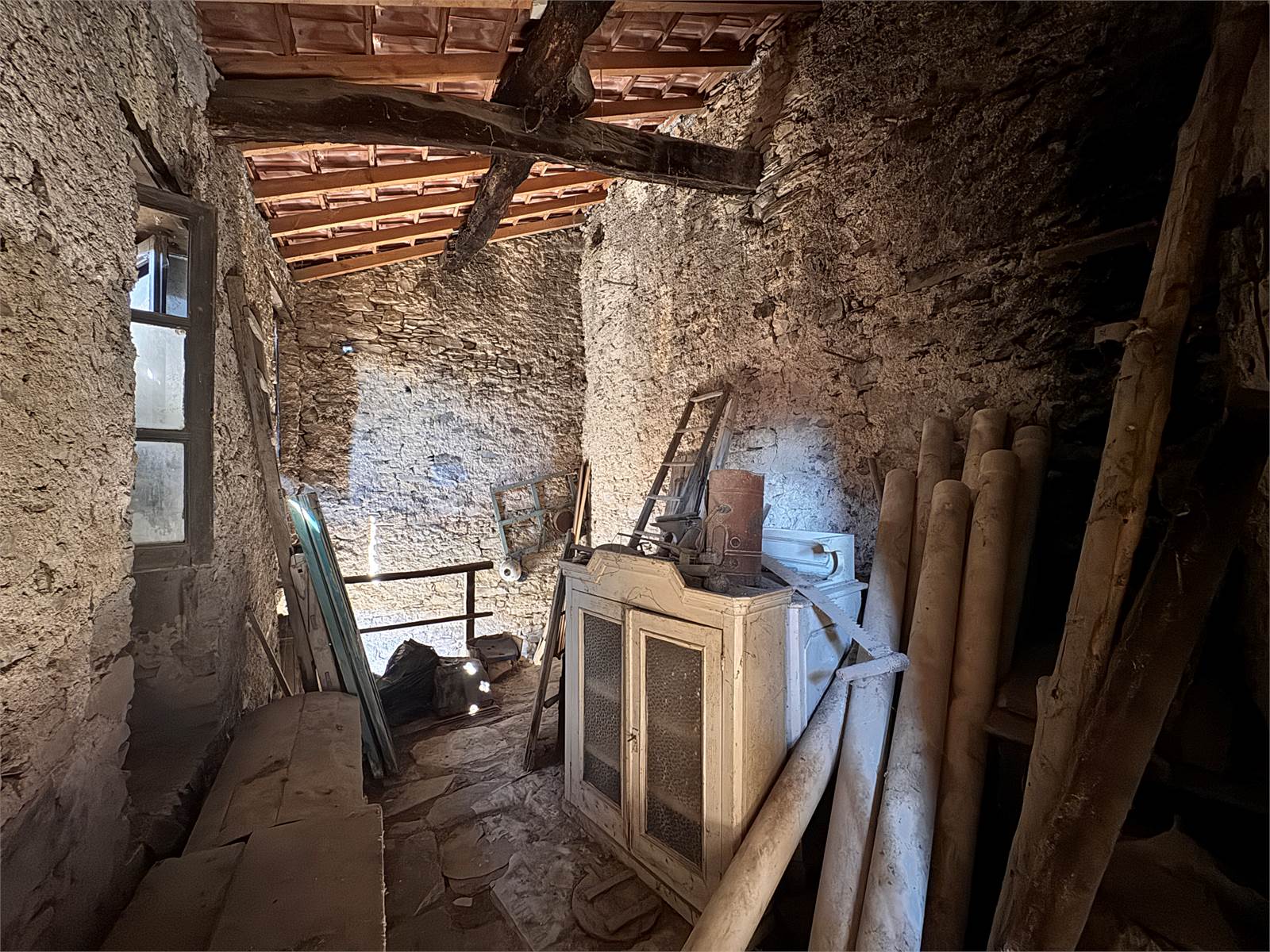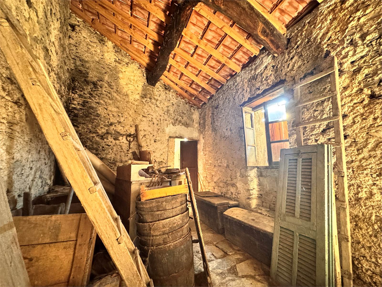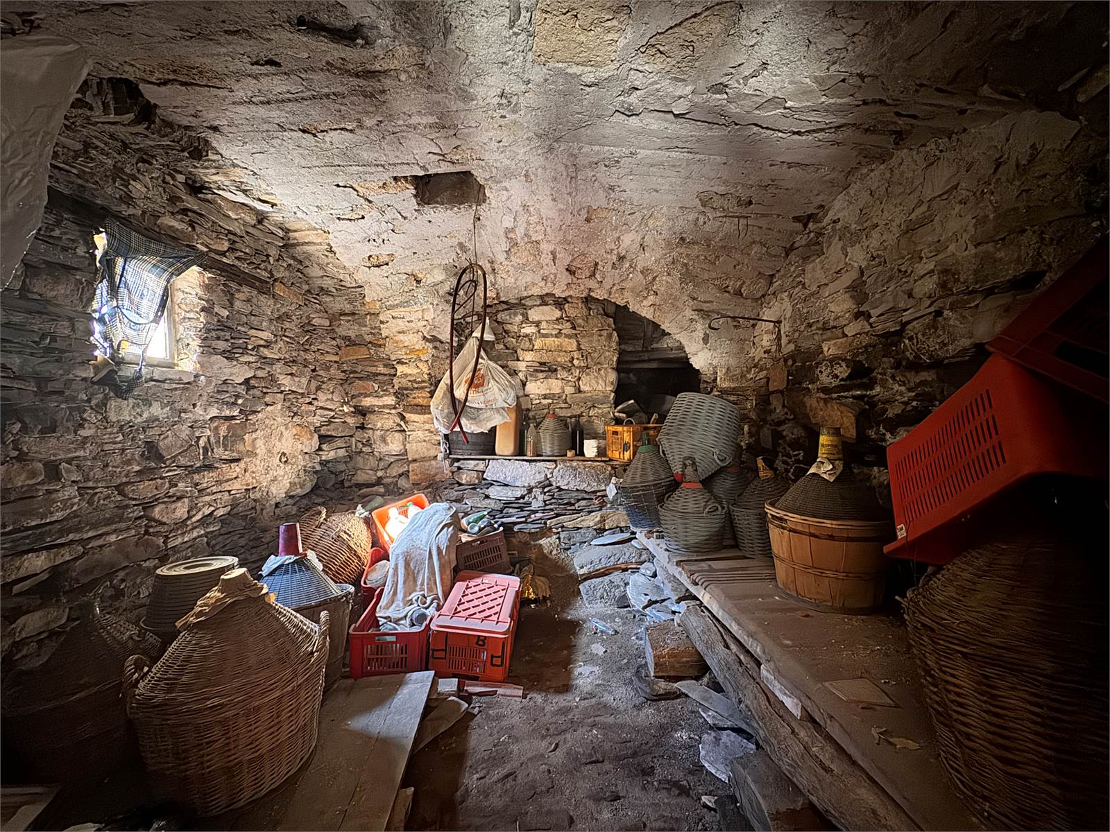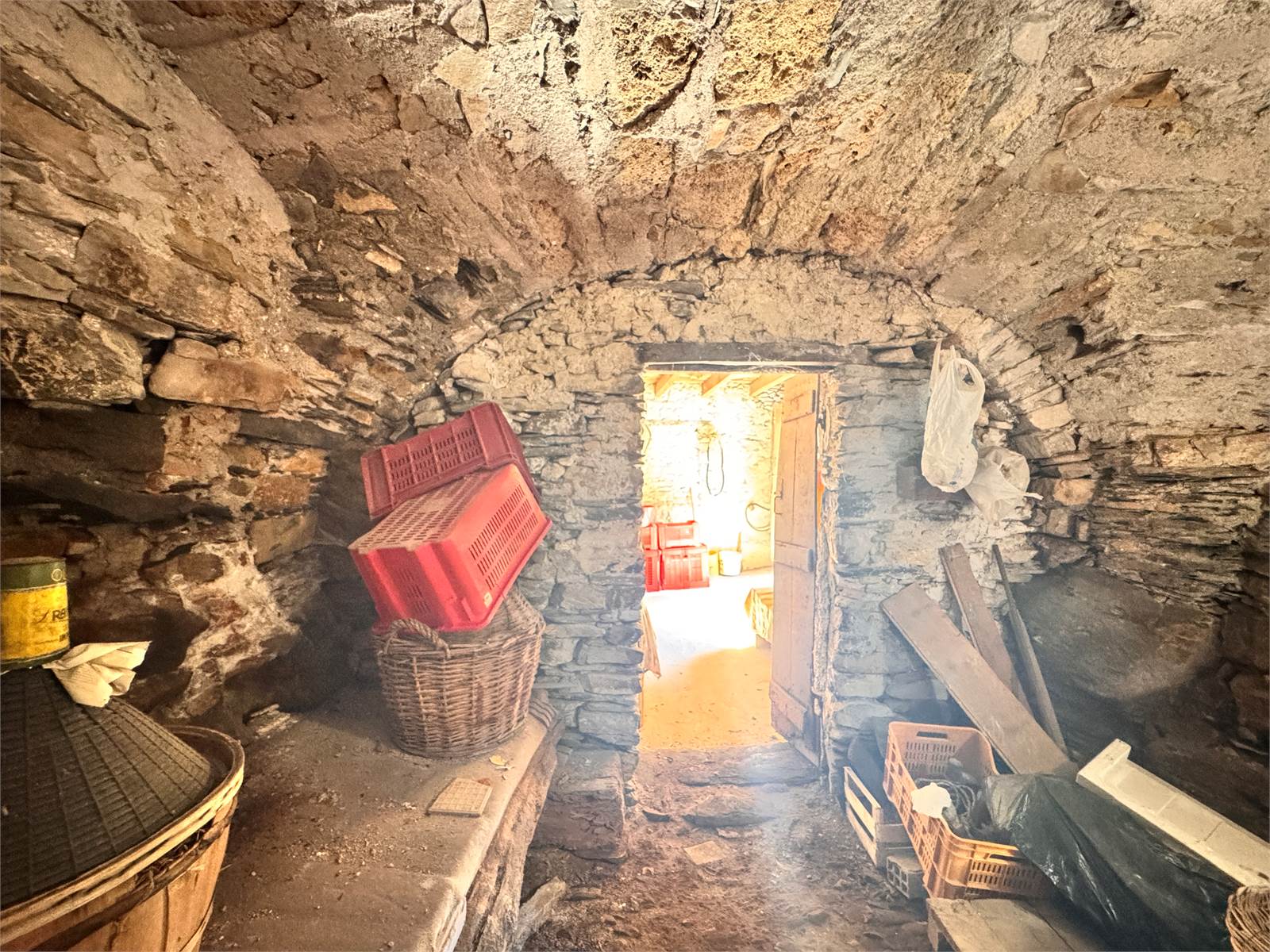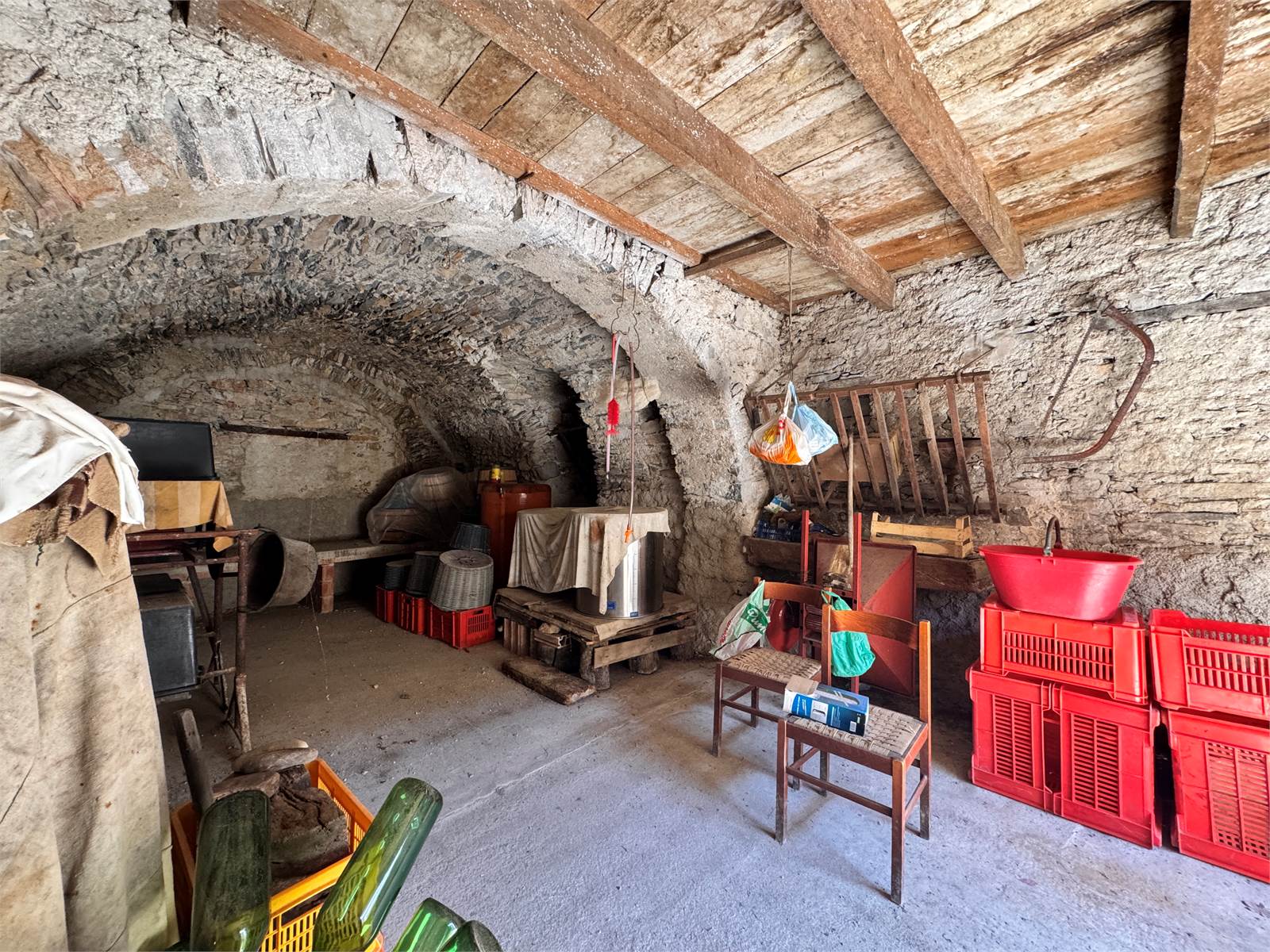 Gli impianti elettrici, idraulici e di scarico sono tutti da creare, l'allaccio alla rete idrica è presente nel magazzino posto al piano terra, quest'ultimo completa la proprietà e misura circa 48 metri quadri con soffitti a volta e suddiviso in due vani adibiti a deposito/cantina.