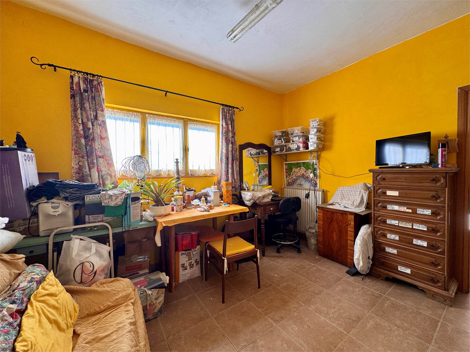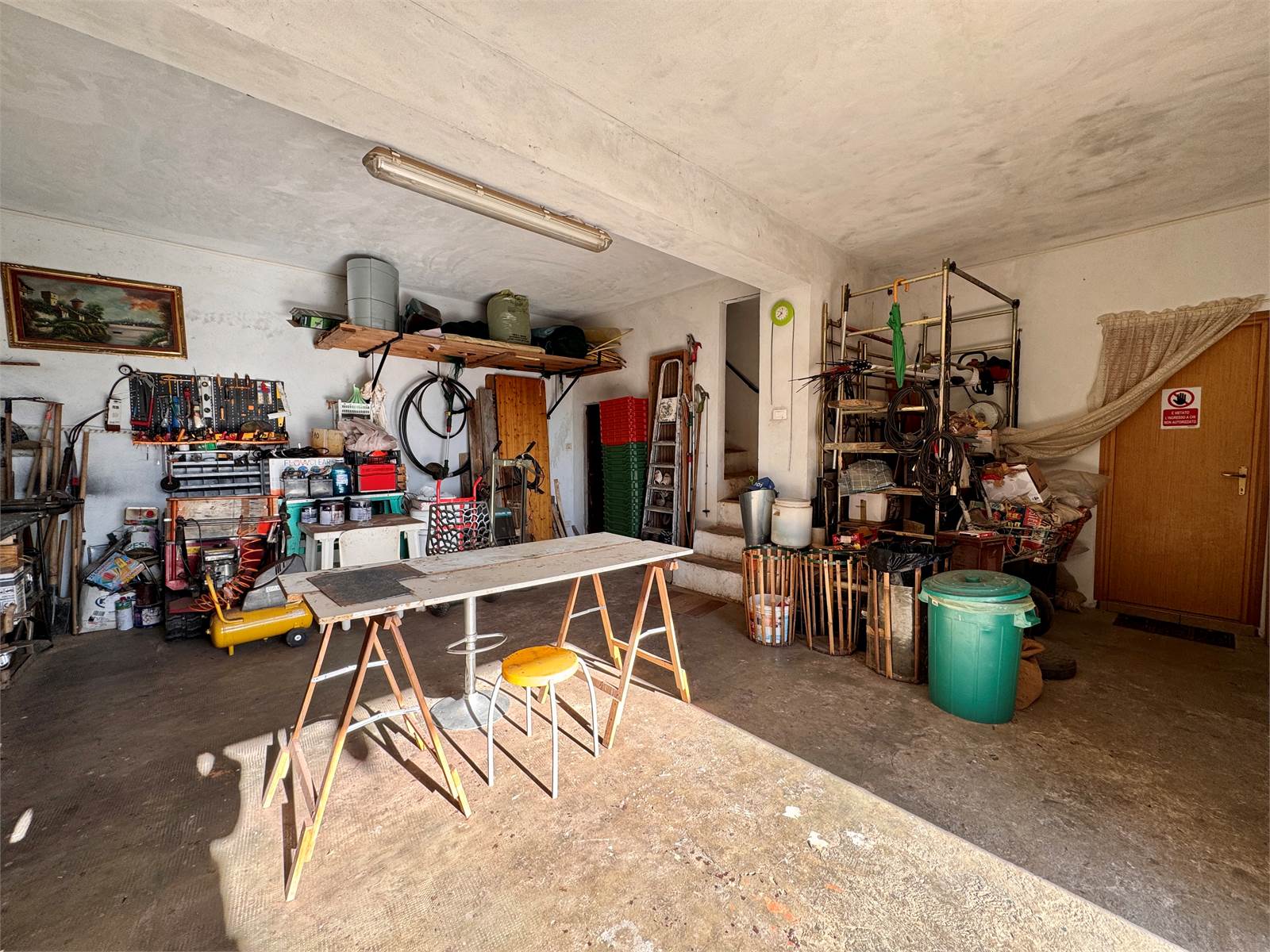 Il piano terra è composto da un ampio locale magazzino di circa 60 metri quadrati, una stanza da letto attualmente adibita a laboratorio e un bagno con box doccia oggetto di recente ristrutturazione.