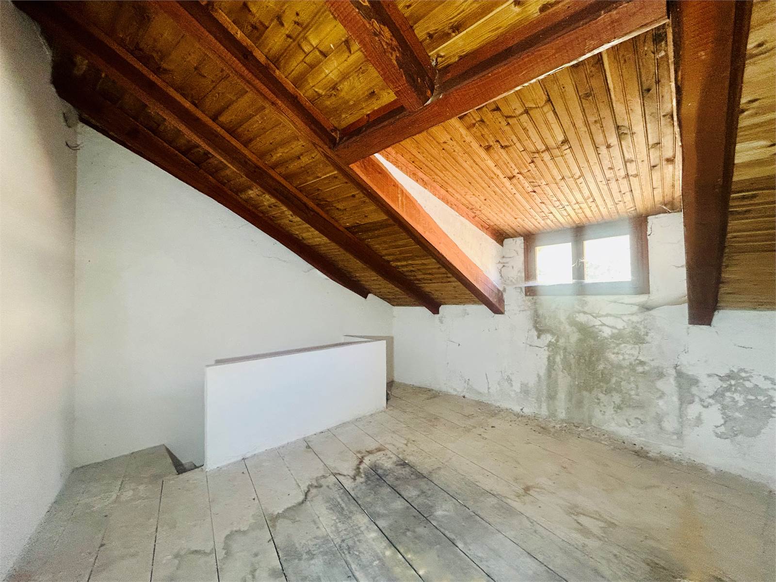 Tramite la scala in legno si sale nella camera da letto matrimoniale mansardata con soffitto in legno a vista e parquet di tavole.