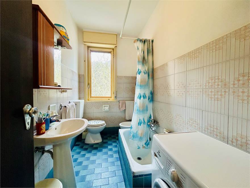 Il bagno ha la vasca, la finestra e la lavatrice.