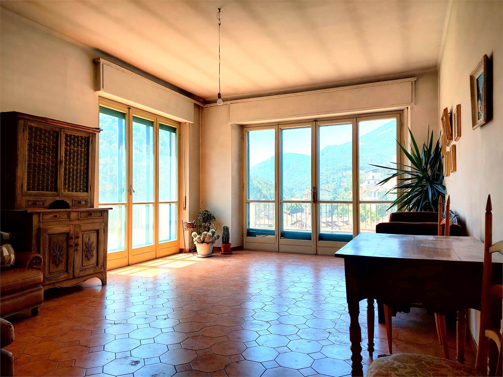Il salone ha una superficie di circa 25 metri quadrati ed è dotato di camino a legna. Due ampie porte a vetri posizionate su due pareti perpendicolari tra loro lasciano entrare molta luce nella stanza. Le vetrate permettono inoltre di uscire sul terrazzo ad angolo di 8 metri quadrati, dove è possibile prendere il sole grazie all'esposizione a sud e dal quale si ha vista aperta su montagne e vallata.