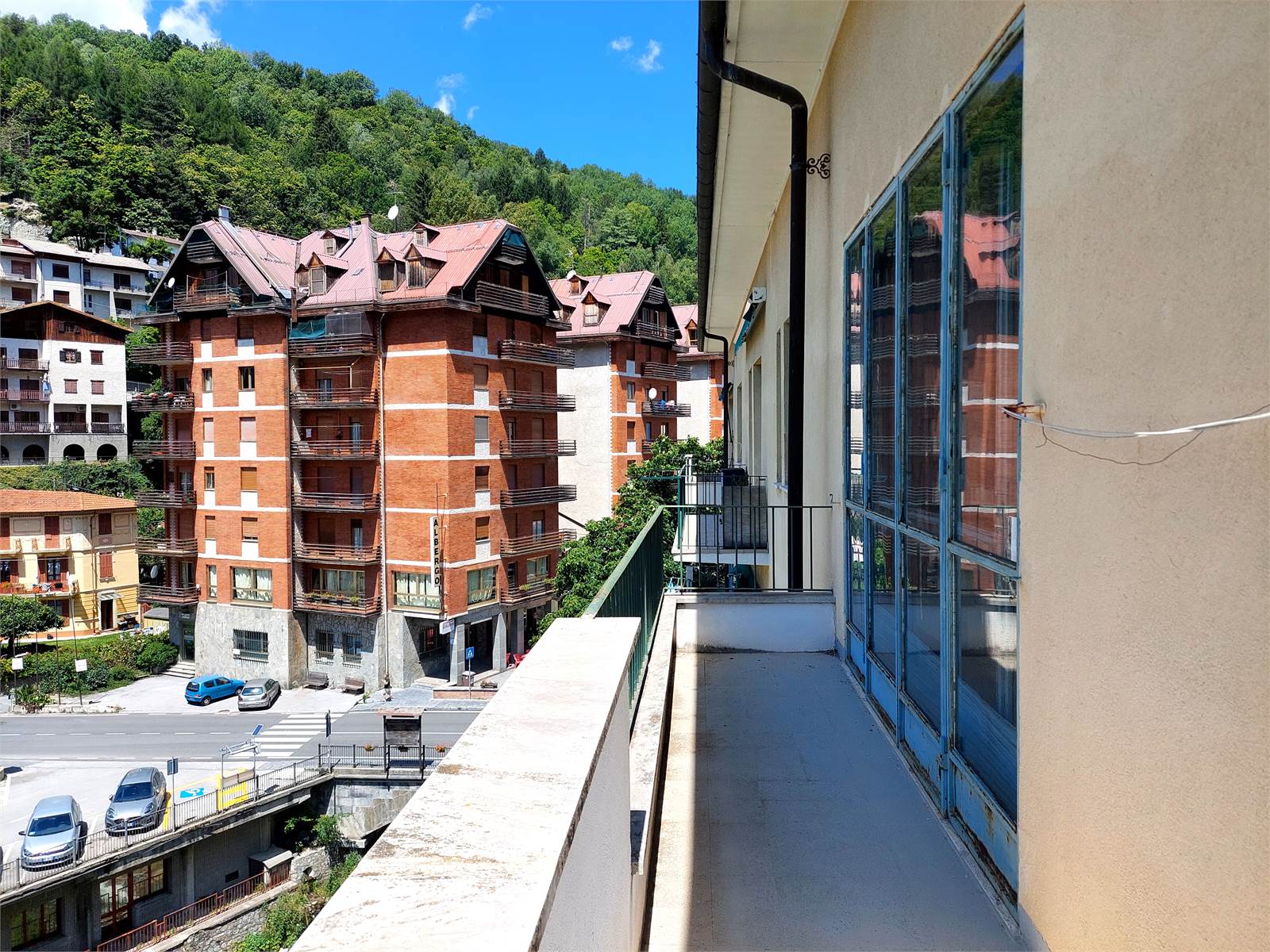 La cucina contiene un tavolo per tre persone, ha il lavandino in marmo e un'ampia portafinestra che permette di accedere ad un balcone che misura circa 6 metri quadrati. La vista è aperta e spazia dalle vette alpine delle Panne e del Monte Antoroto ai tetti del centro del paese.