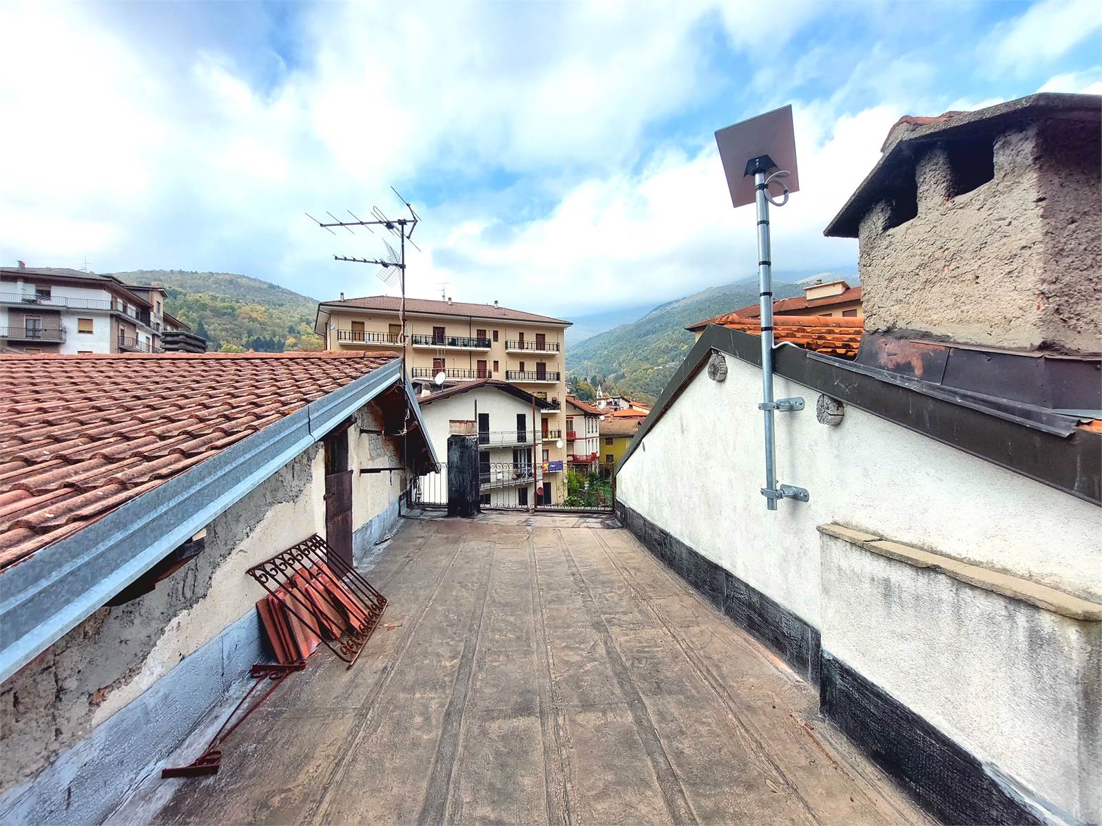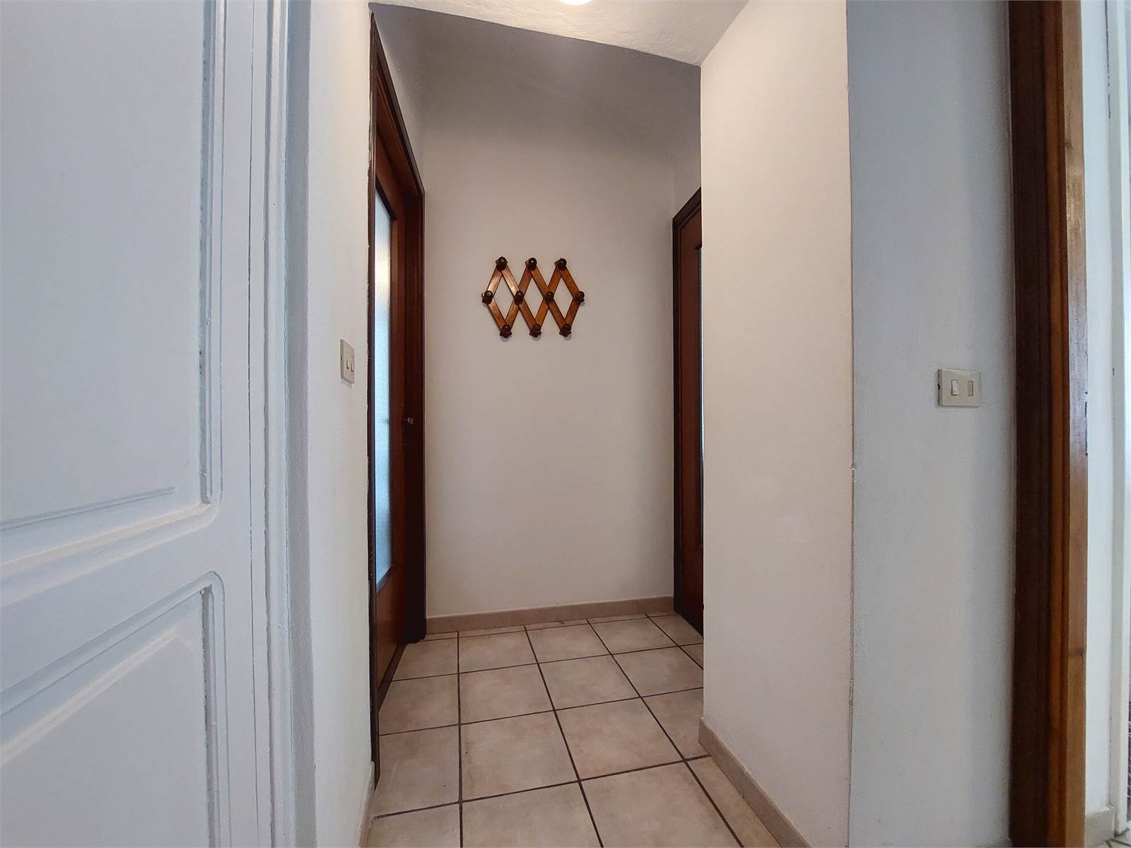 L'appartamento principale ha un corridoio d'ingresso che ne suddivide i diversi ambienti. La cucina abitabile ha un armadio a muro originale utilizzabile come dispensa, ha lo spazio per la lavatrice ed è dotata di un proprio balcone. Il soggiorno è posizionato nell'angolo del fabbricato ed è reso luminoso dalle due porte finestra che sono esposte a sud e a ovest. L'ambiente è anche provvisto di un balcone. La camera da letto è matrimoniale è anch'essa accessoriata con un balcone di pertinenza esclusiva. Il bagno ha la finestra e la vasca. Una scala interna all'appartamento, posizionata nell'ingresso, da accesso al solaio situato al piano sovrastante, il quale è suddiviso in due vani e da esso c'è la possibilità di accedere al terrazzo di proprietà, che misura circa 27 metri quadrati e dal quale la vista spazia dai tetti del centro alle montagne circostanti.