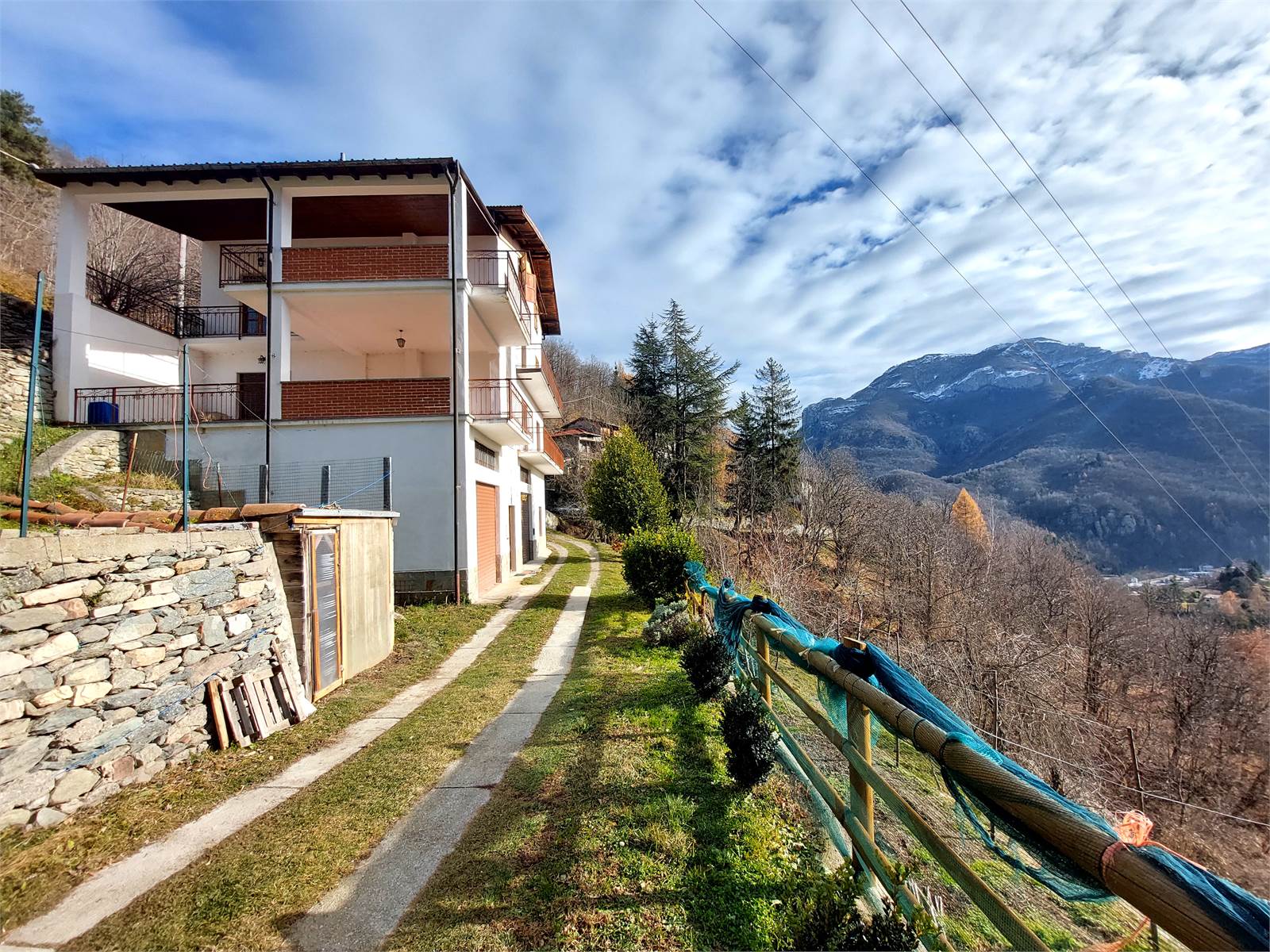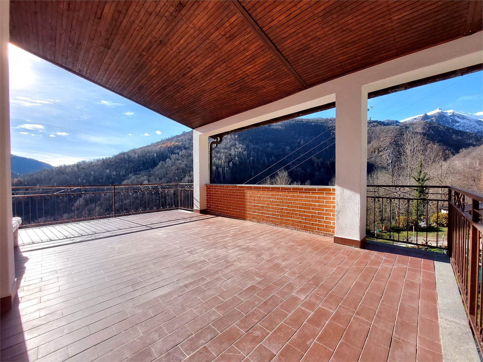 La cucina è abitabile ed ha una porta finestra che permette di accedere direttamente al terrazzo di proprietà. Quest'ultimo misura circa 25 metri quadrati ed è coperto da una tettoia in muratura. La posizione dominante della proprietà permette di godere di vista panoramica aperta sulle montagne e sulla vallata sottostante. Il terrazzo ha infine un piccolo cancello pedonale rivolto verso la strada comunale, il che permette all'alloggio di avere anche un ingresso completamente indipendente.