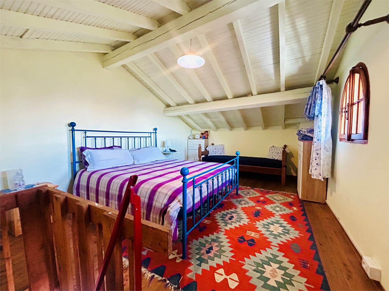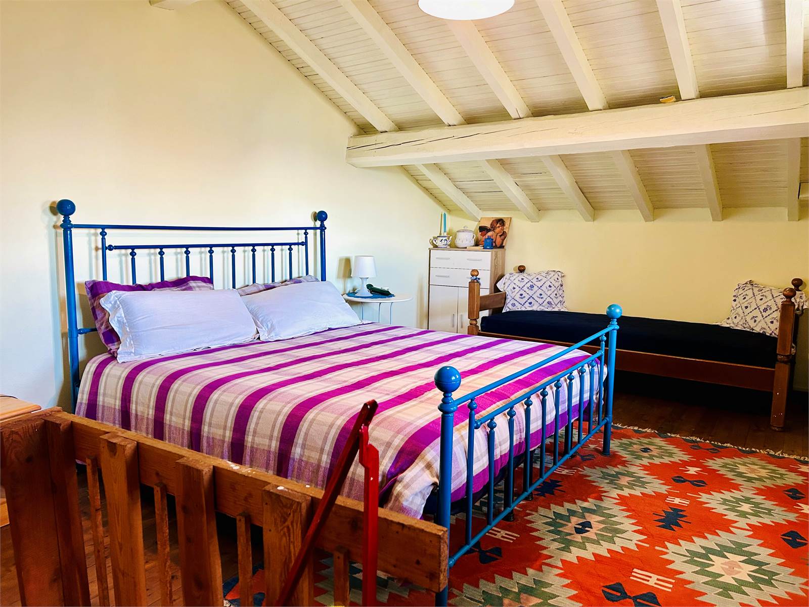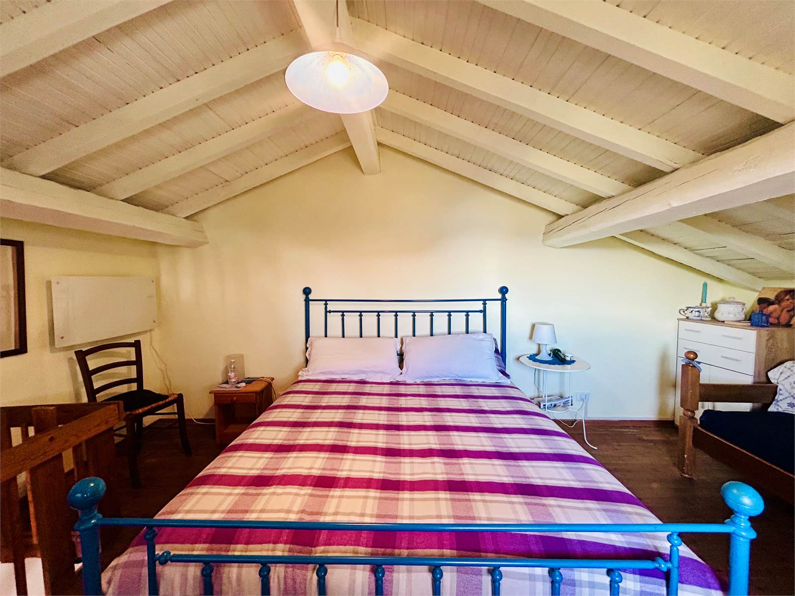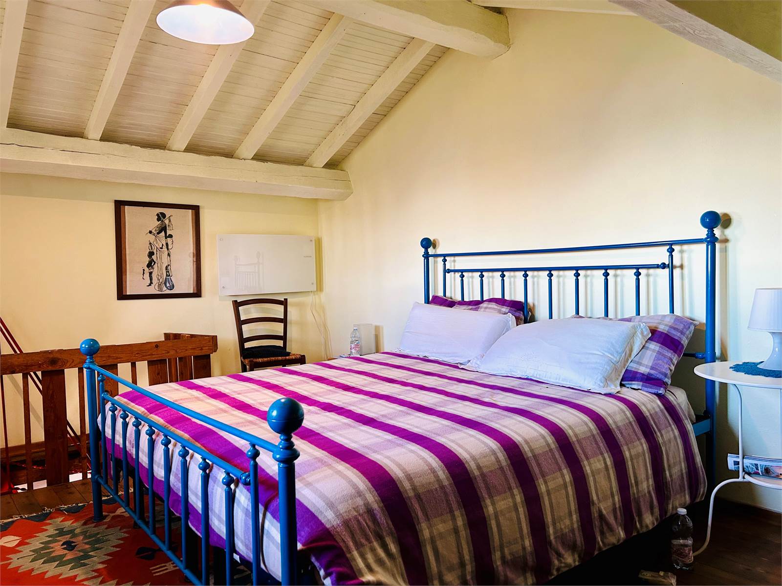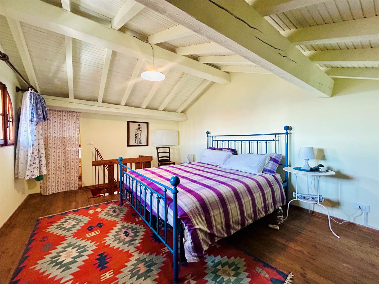 Salendo la scala interna, si raggiunge la camera da letto matrimoniale la cui caratteristica è di avere il tetto mansardato con travi a vista, oltre che al parquet in tavole.