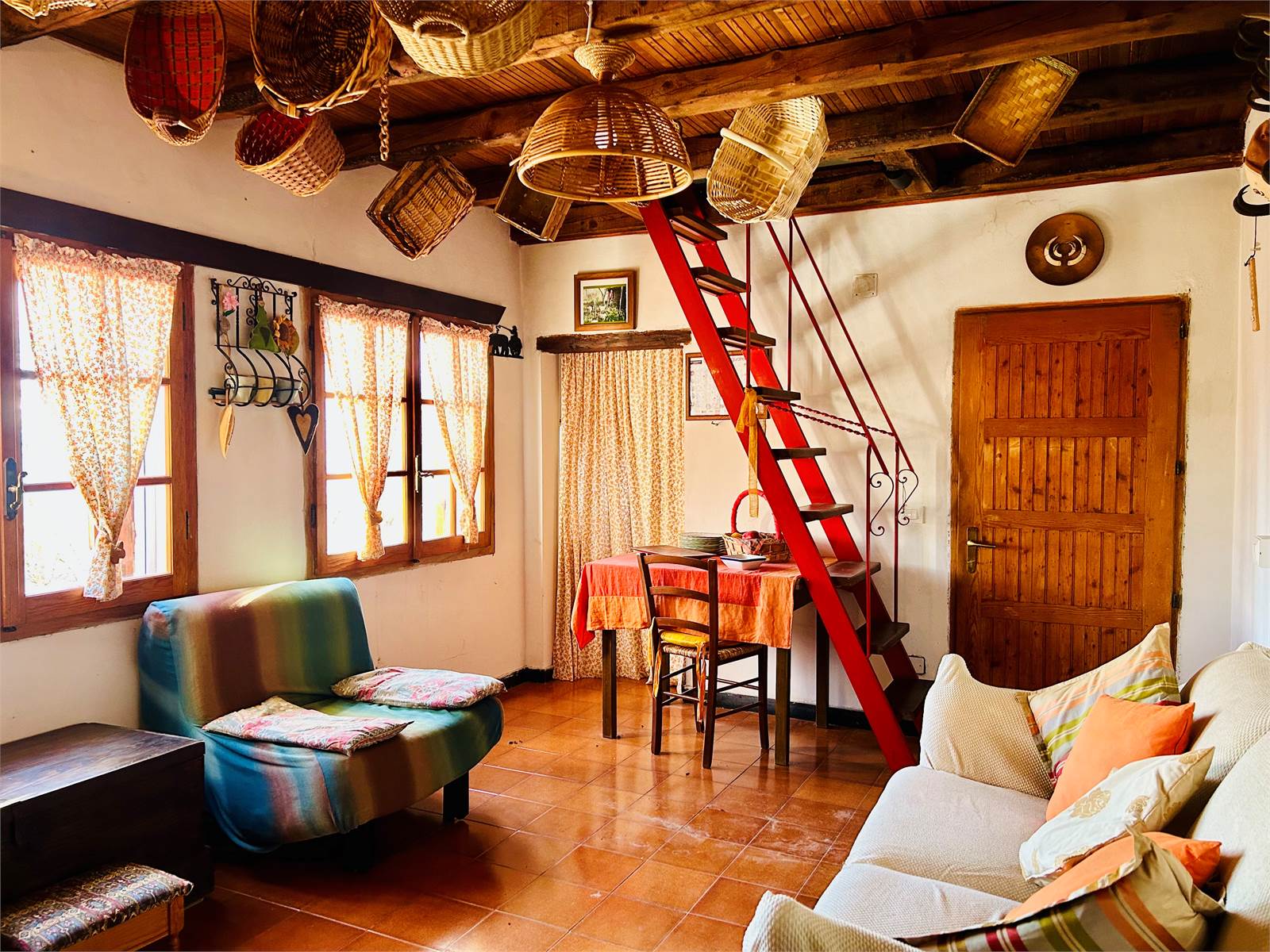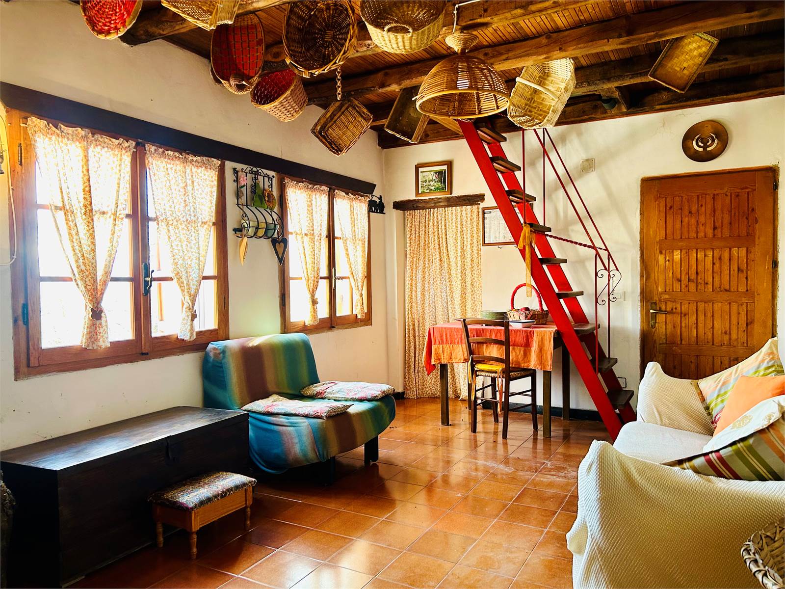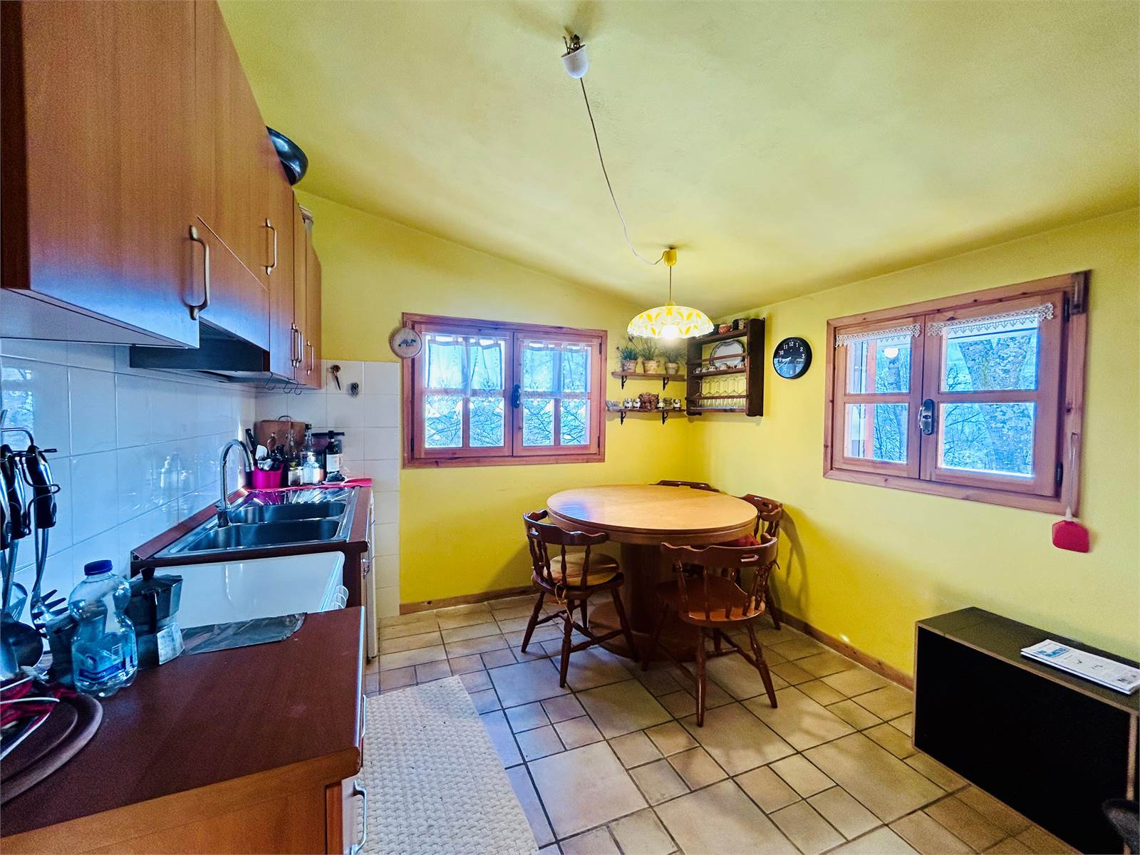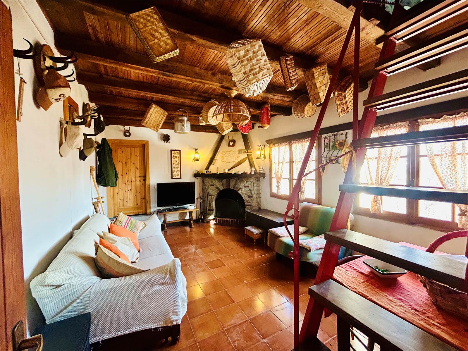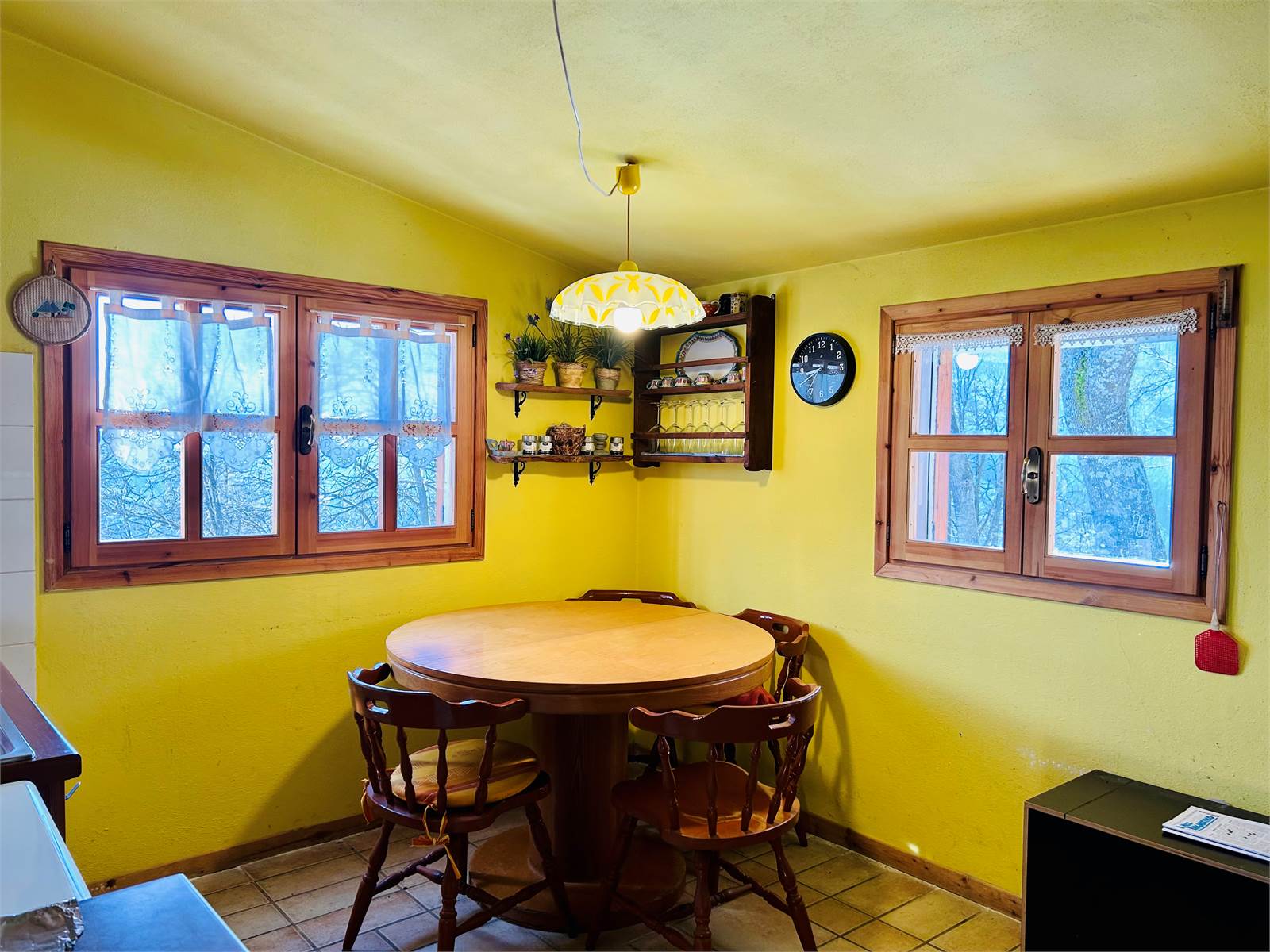 Da una parte la cucina abitabile dotata di angolo cottura e stufa a legna, dall'altra un comodo ripostiglio e uno spazioso soggiorno, reso luminoso da due finestre esposte a sud. Ad impreziosire l'ambiente, il soffitto in legno ed il camino in pietra che rendono l'atmosfera calda e accogliente.