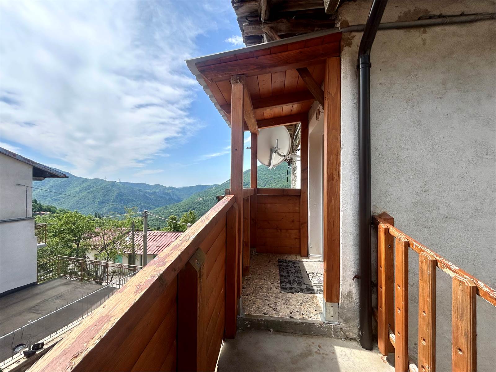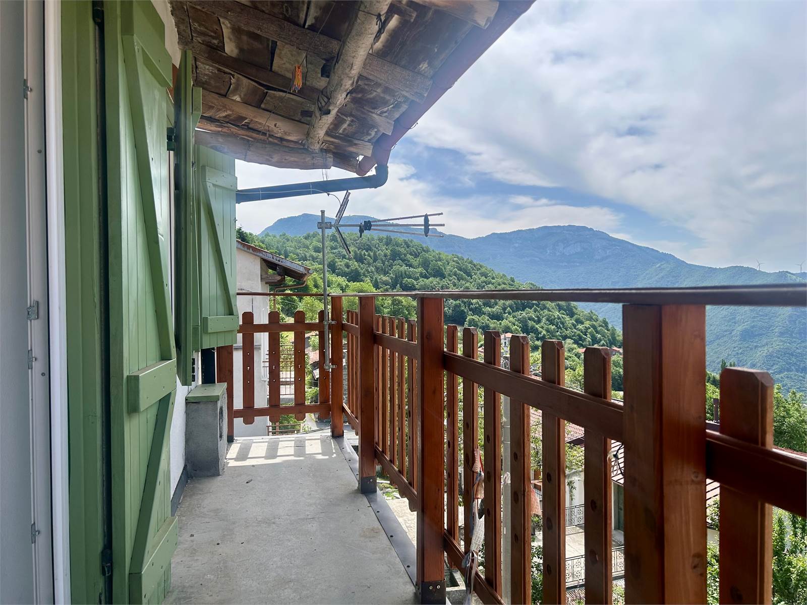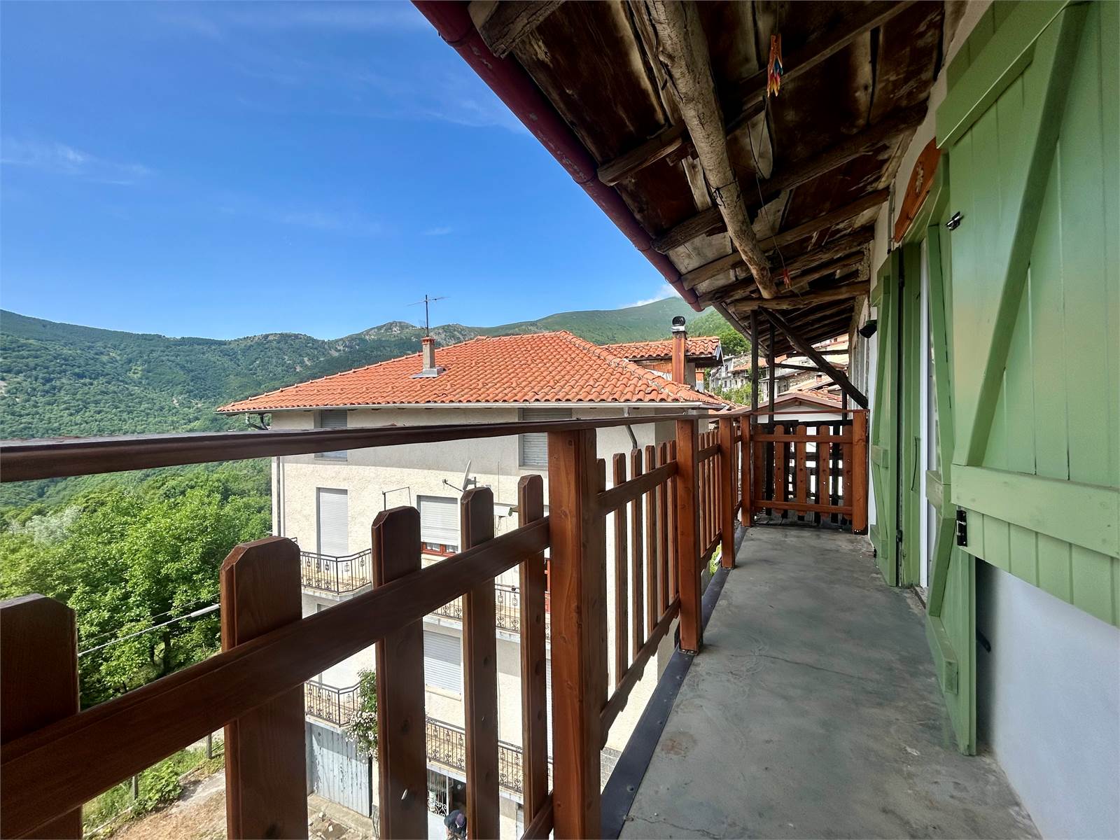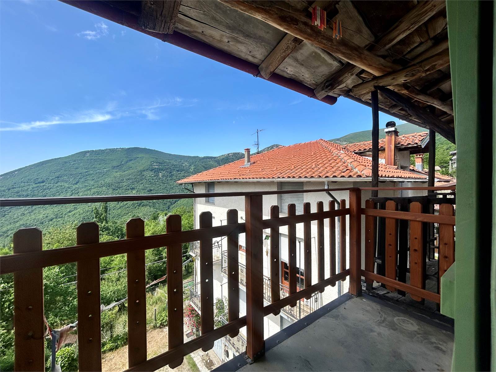 Il balcone in legno si estende per l'intera facciata ed ha la vista panoramica.