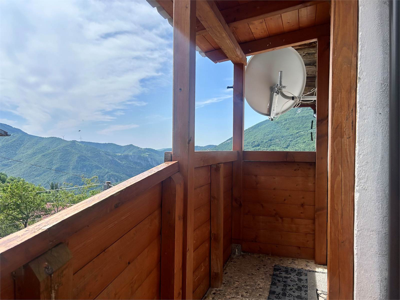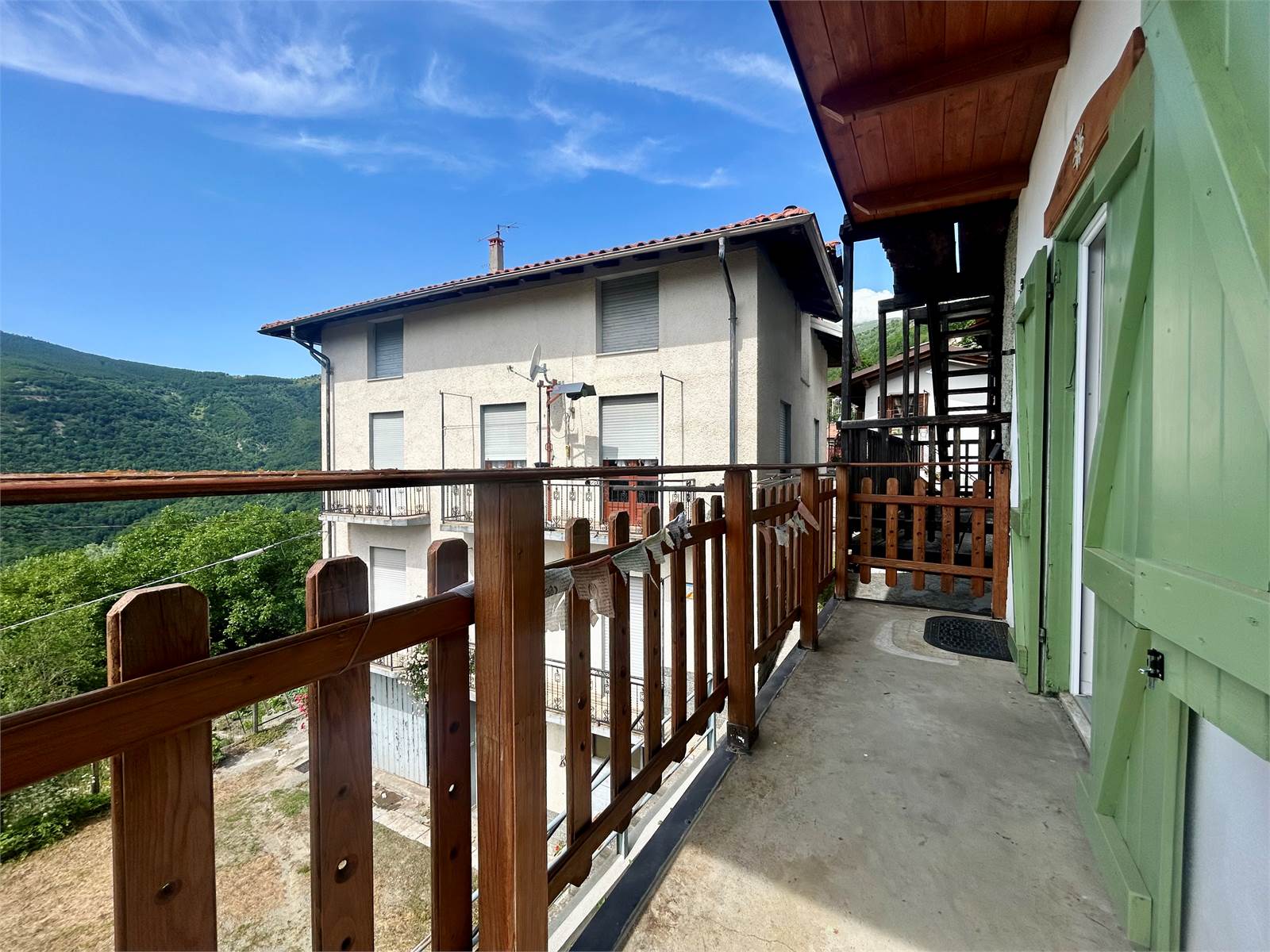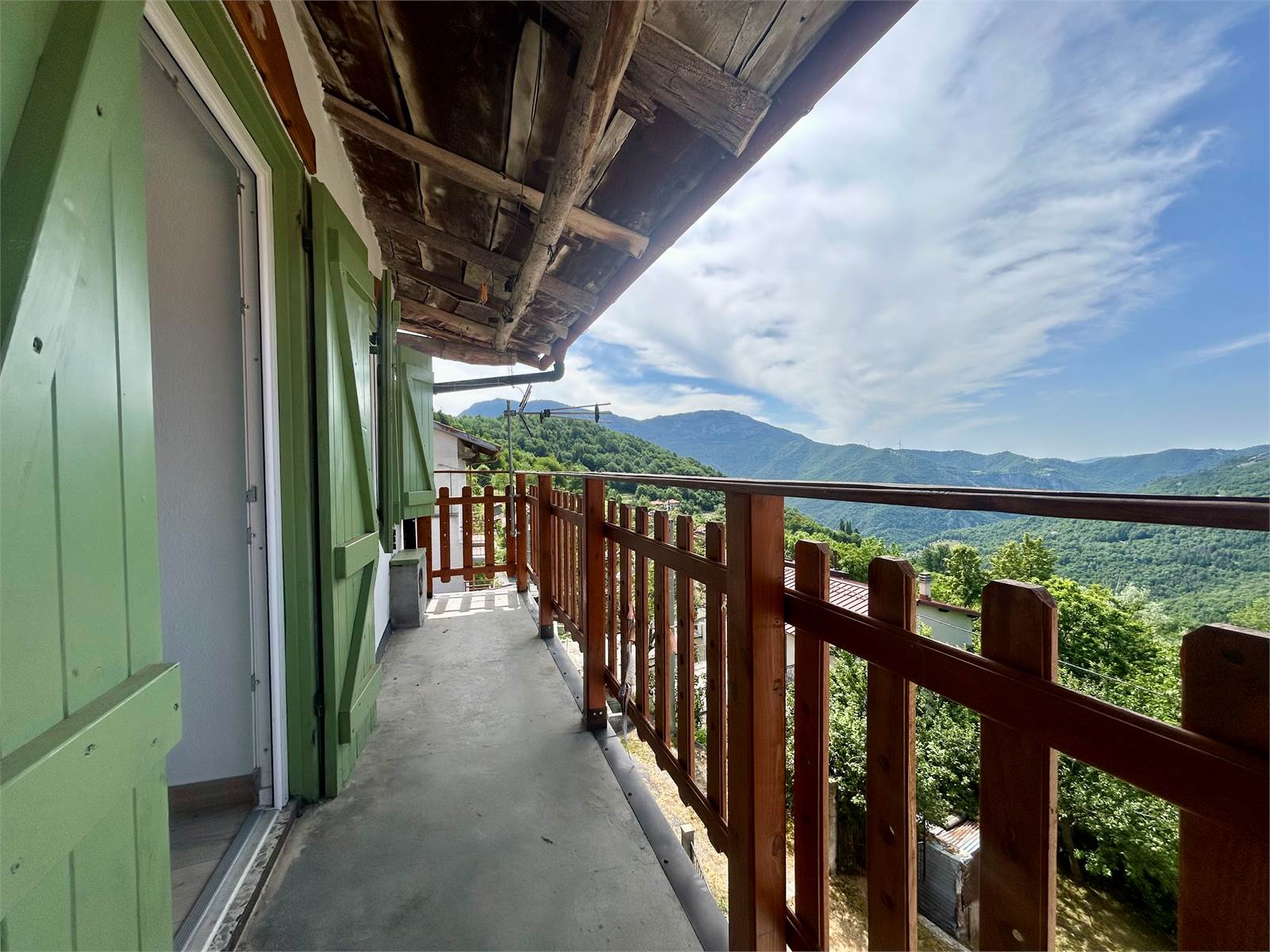 Il balcone in legno si estende per l'intera facciata ed ha la vista panoramica.