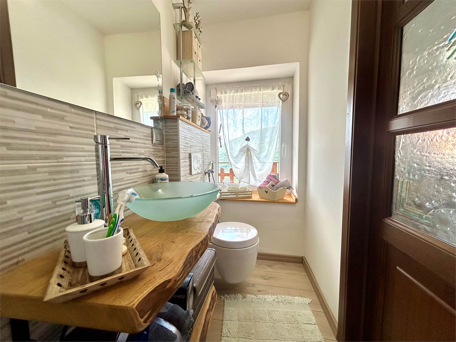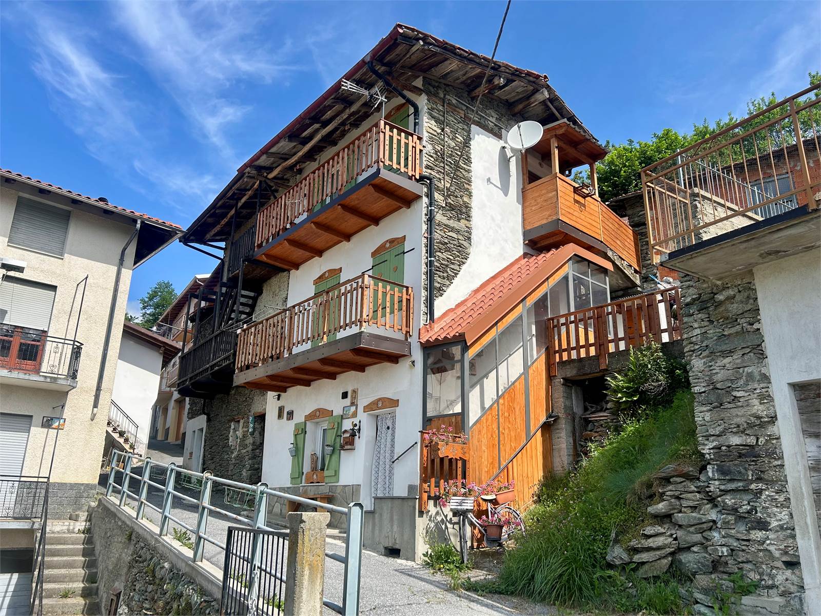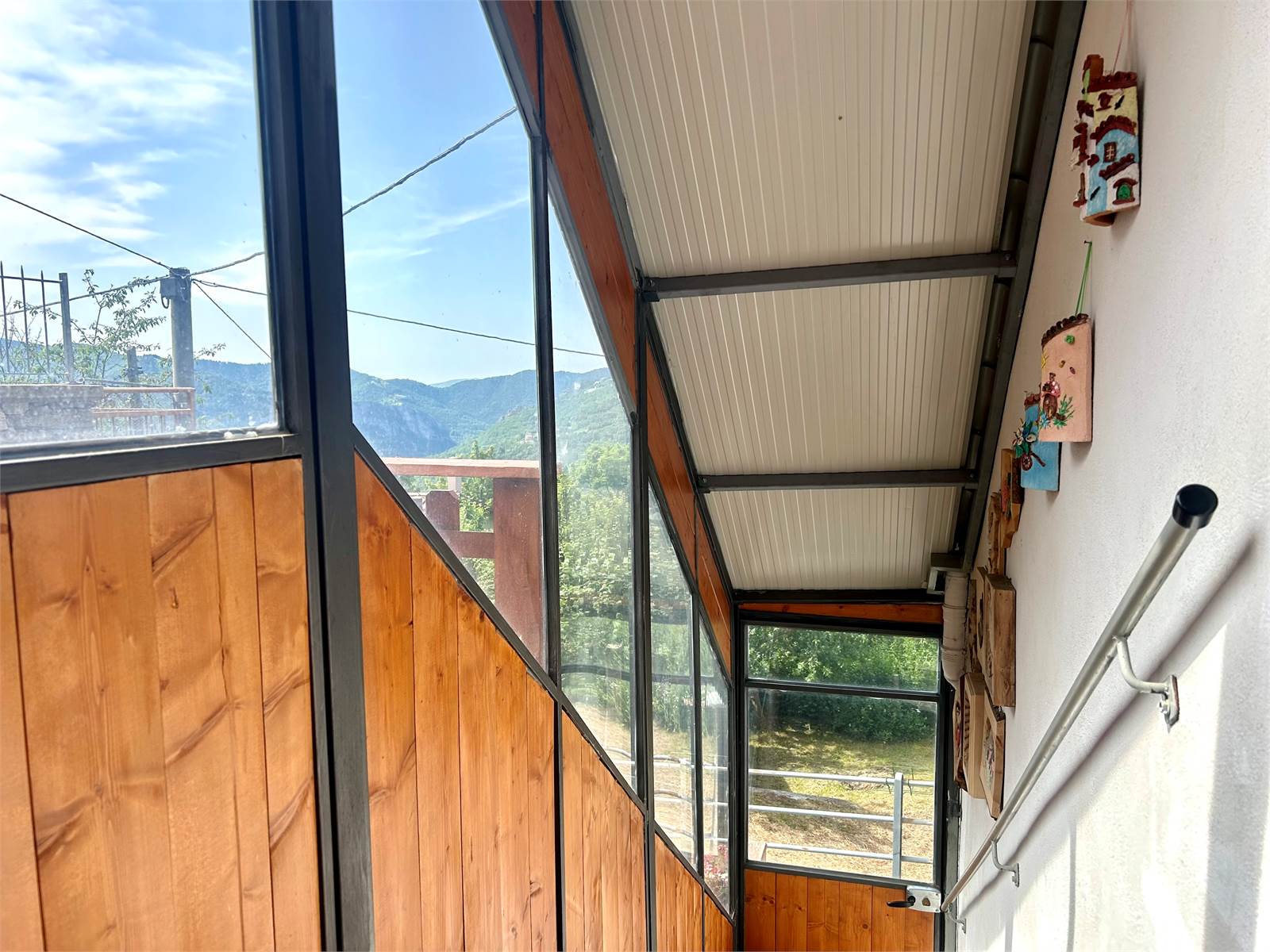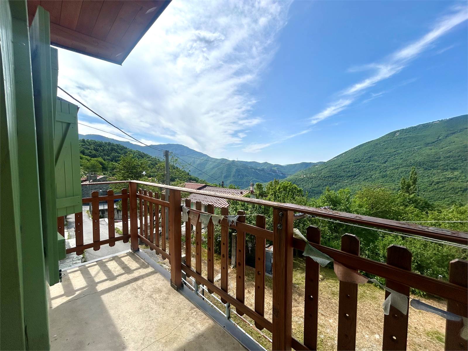 Il balcone in legno si estende per l'intera facciata ed ha la vista panoramica.
