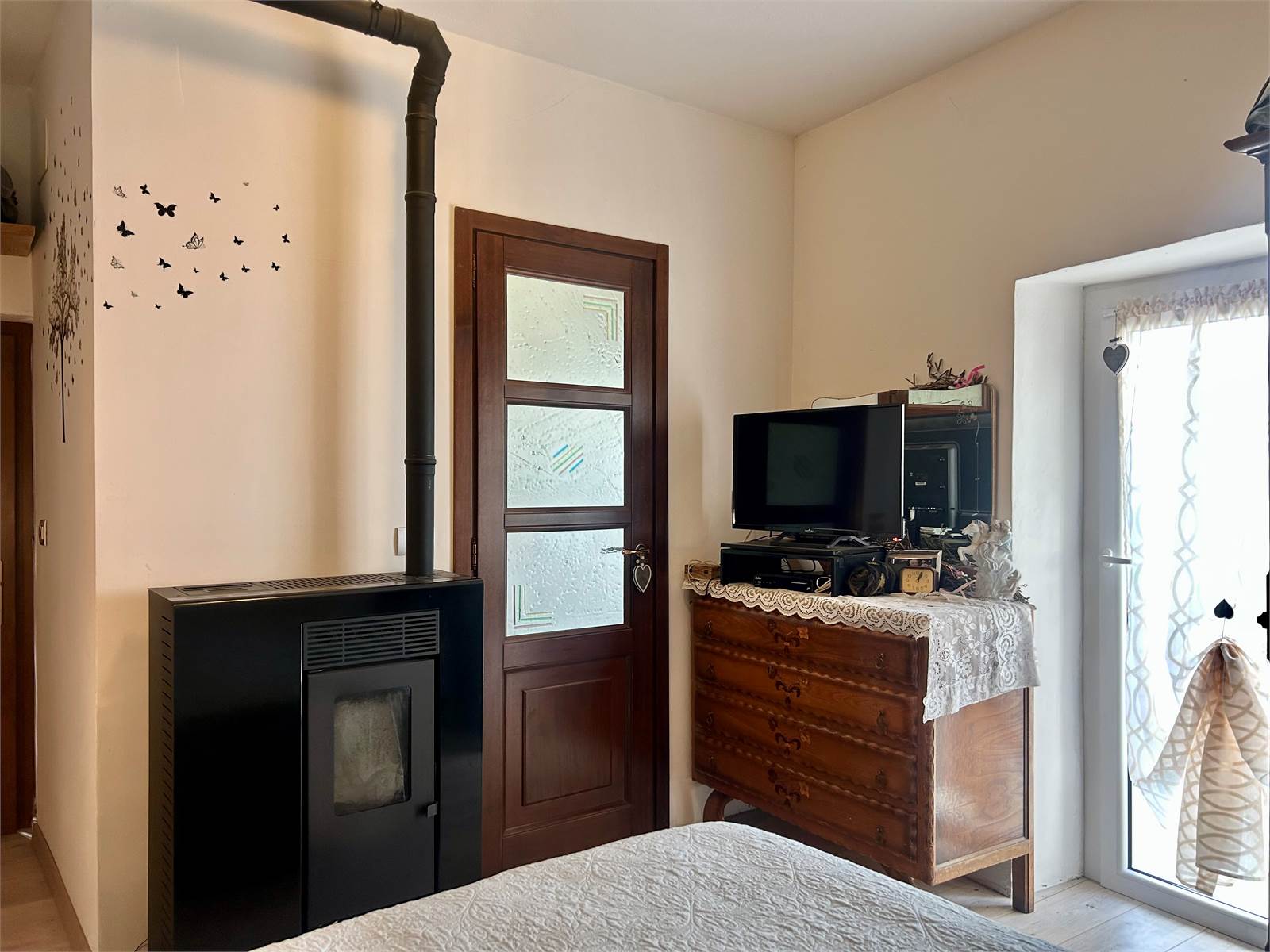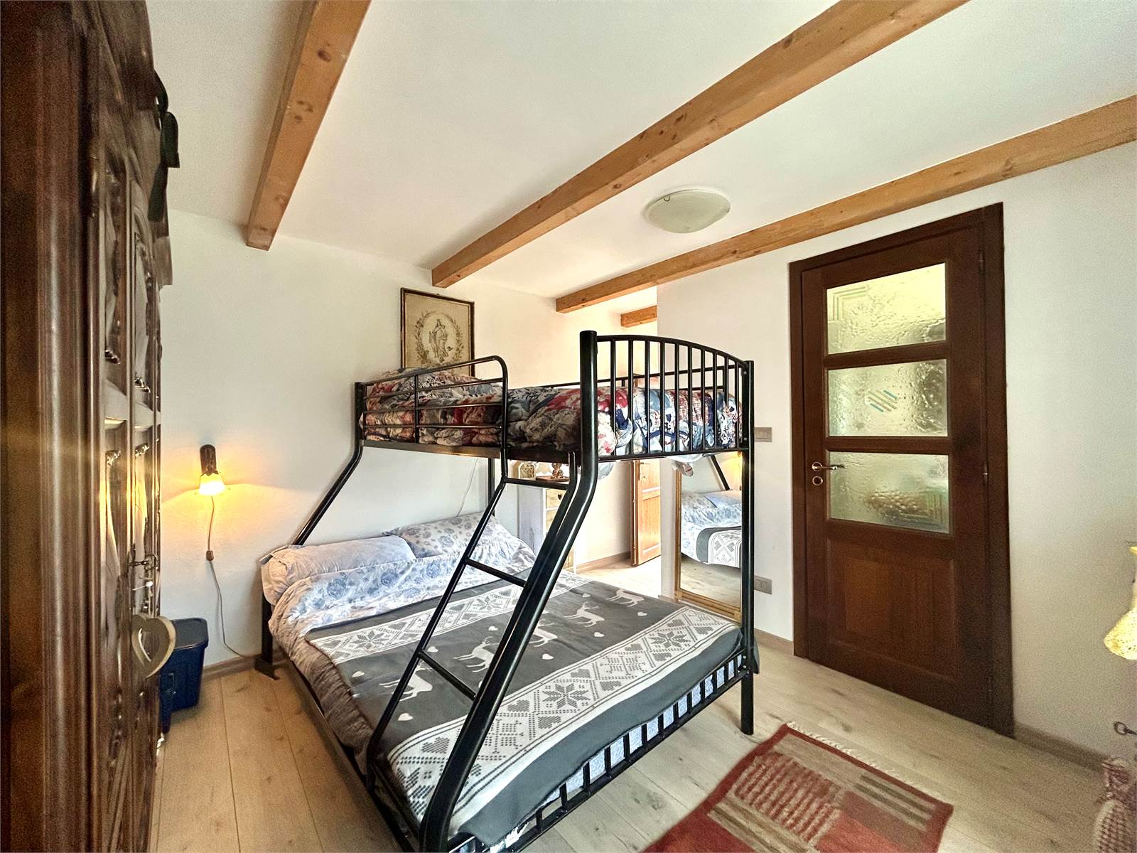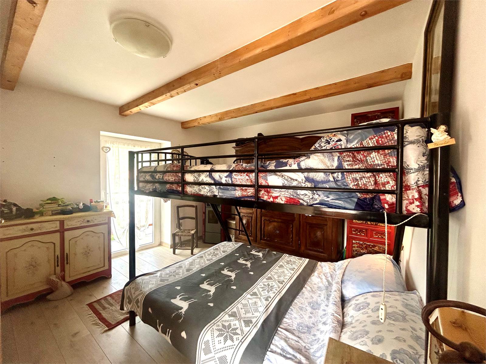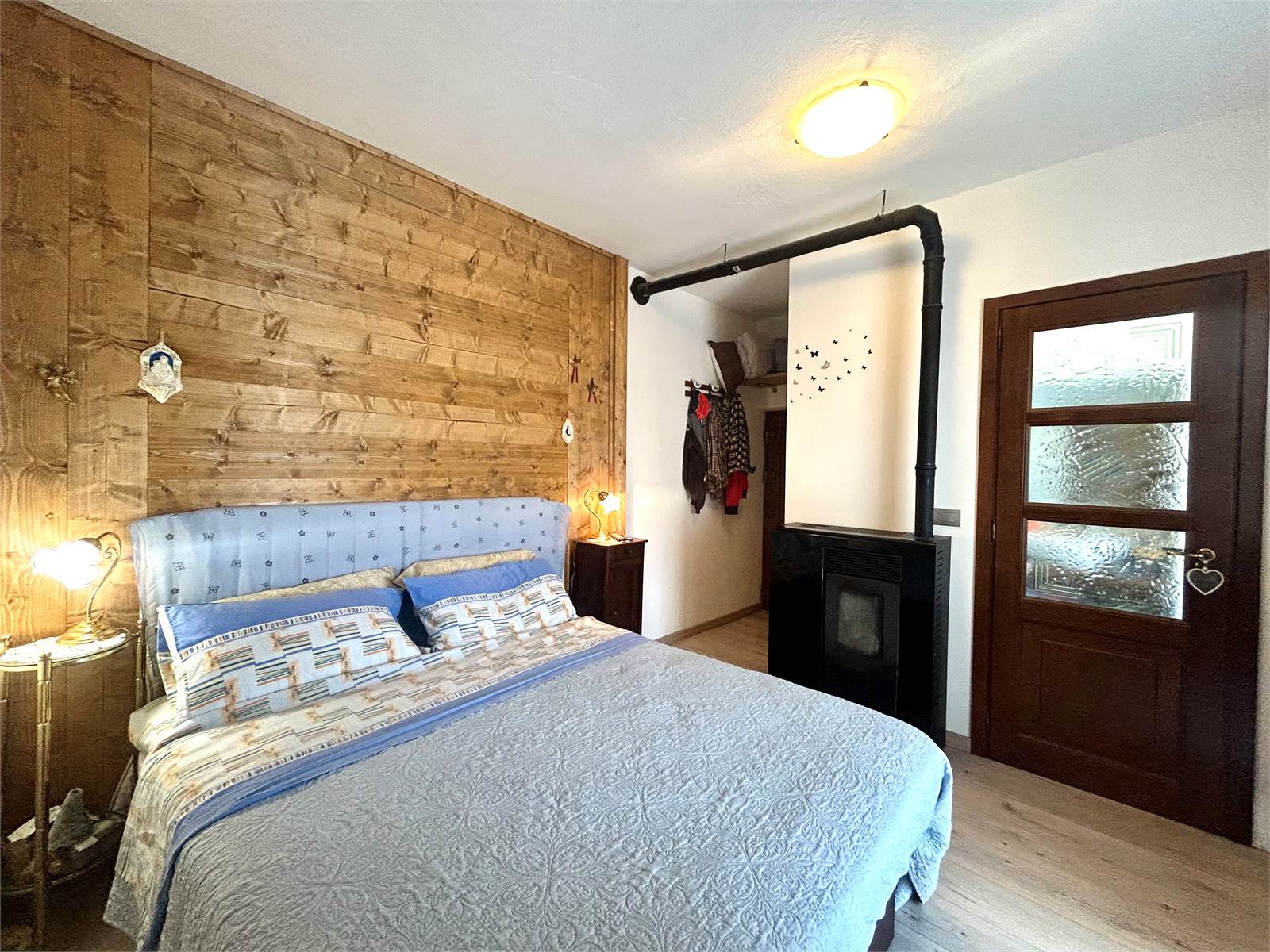 Grazie alla scala coperta esterna si sale al primo piano dove la camera da letto matrimoniale con stufa a pellet accompagna al primo balcone con la vista panoramica sulla vallata.