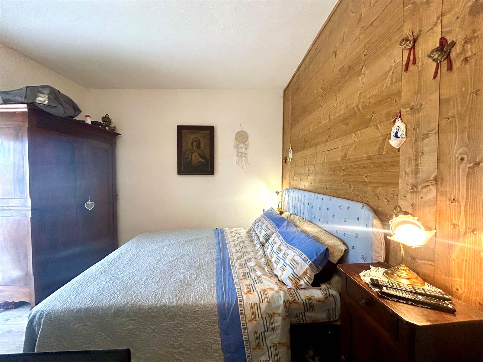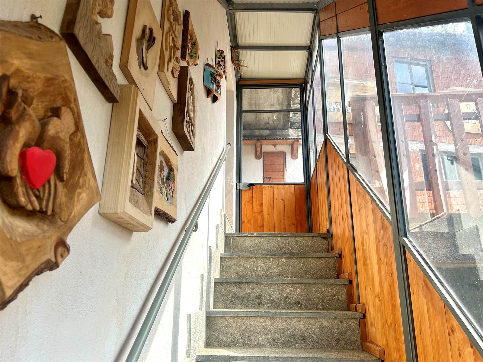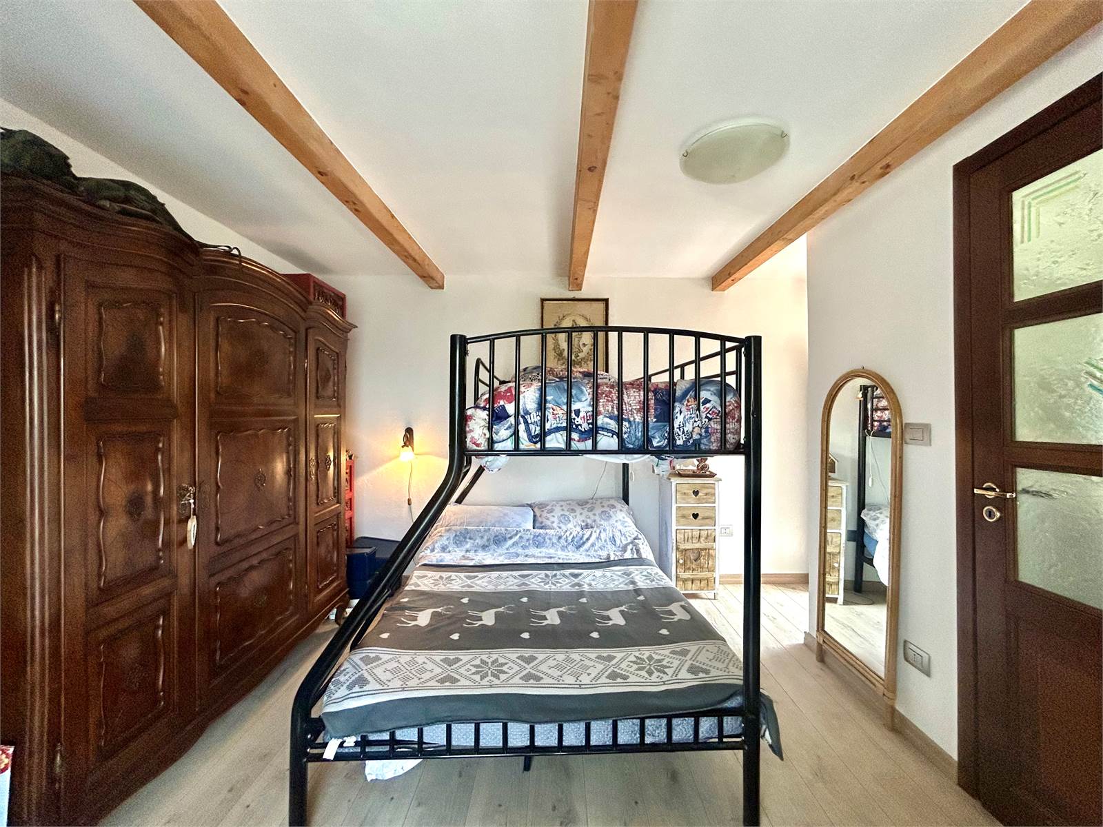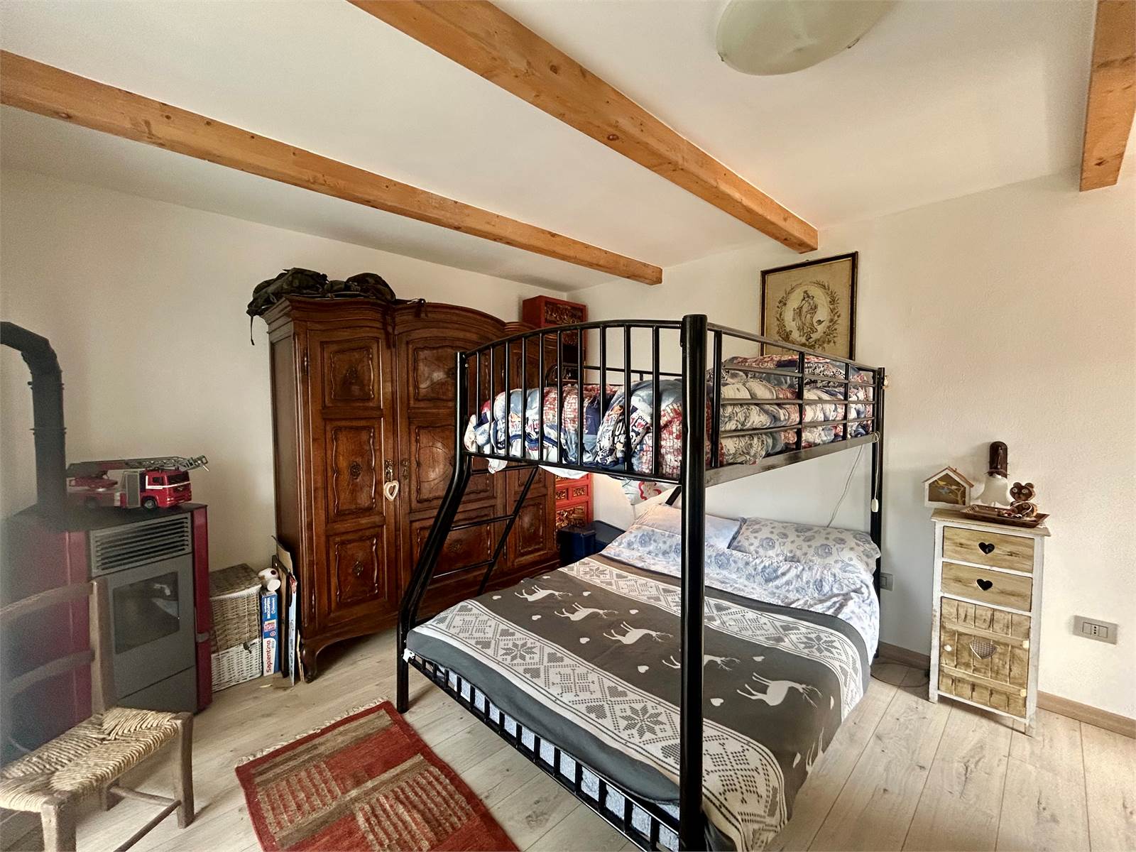 Grazie alla scala coperta esterna si sale al primo piano dove la camera da letto matrimoniale con stufa a pellet accompagna al primo balcone con la vista panoramica sulla vallata.