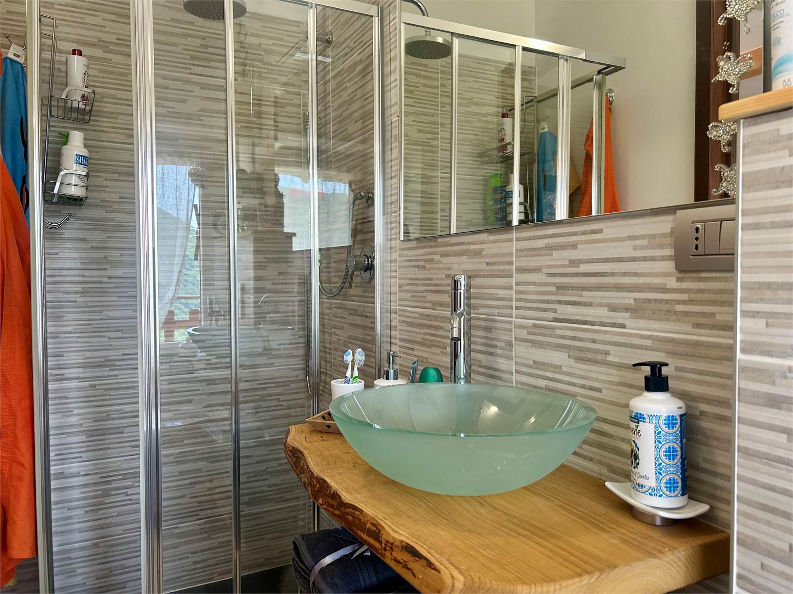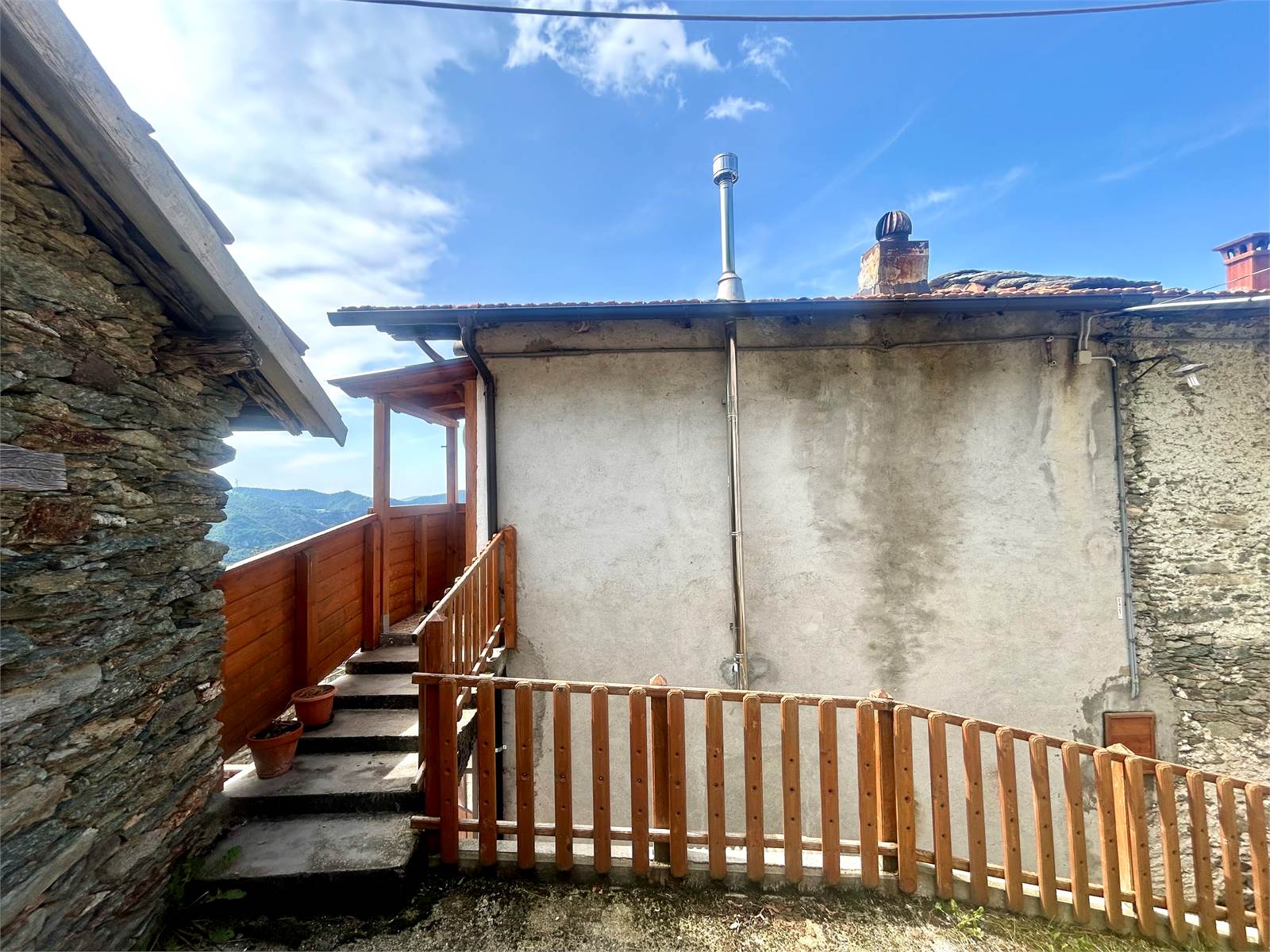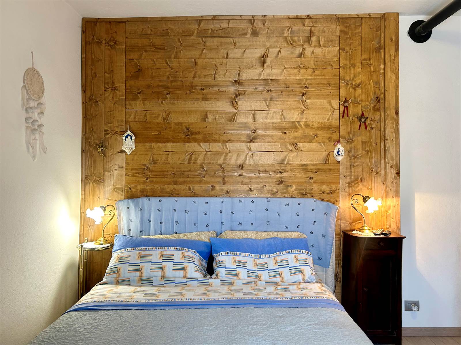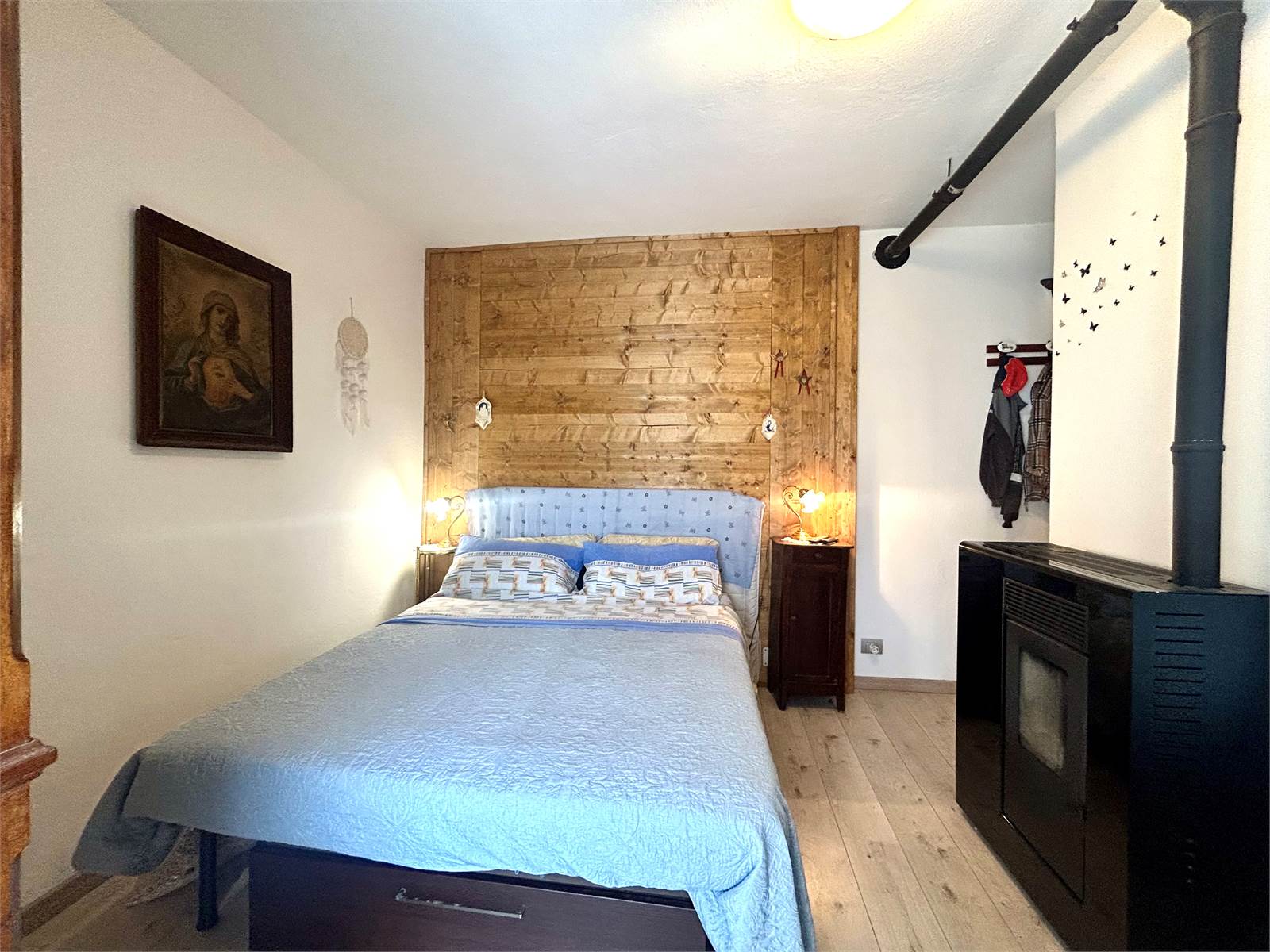 Grazie alla scala coperta esterna si sale al primo piano dove la camera da letto matrimoniale con stufa a pellet accompagna al primo balcone con la vista panoramica sulla vallata.