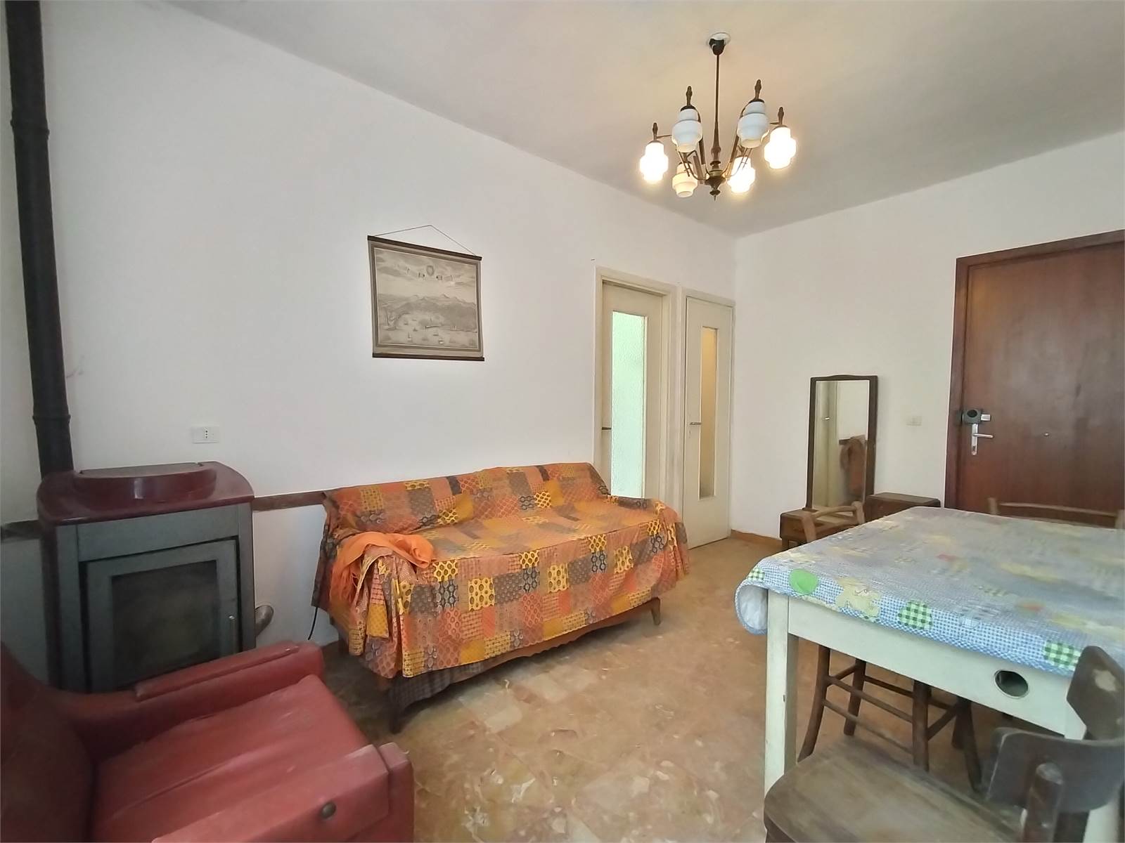 L'alloggio è suddiviso in ingresso con stufa a legna, cucinotto, due camere da letto matrimoniali e un piccolo bagno con vasca.