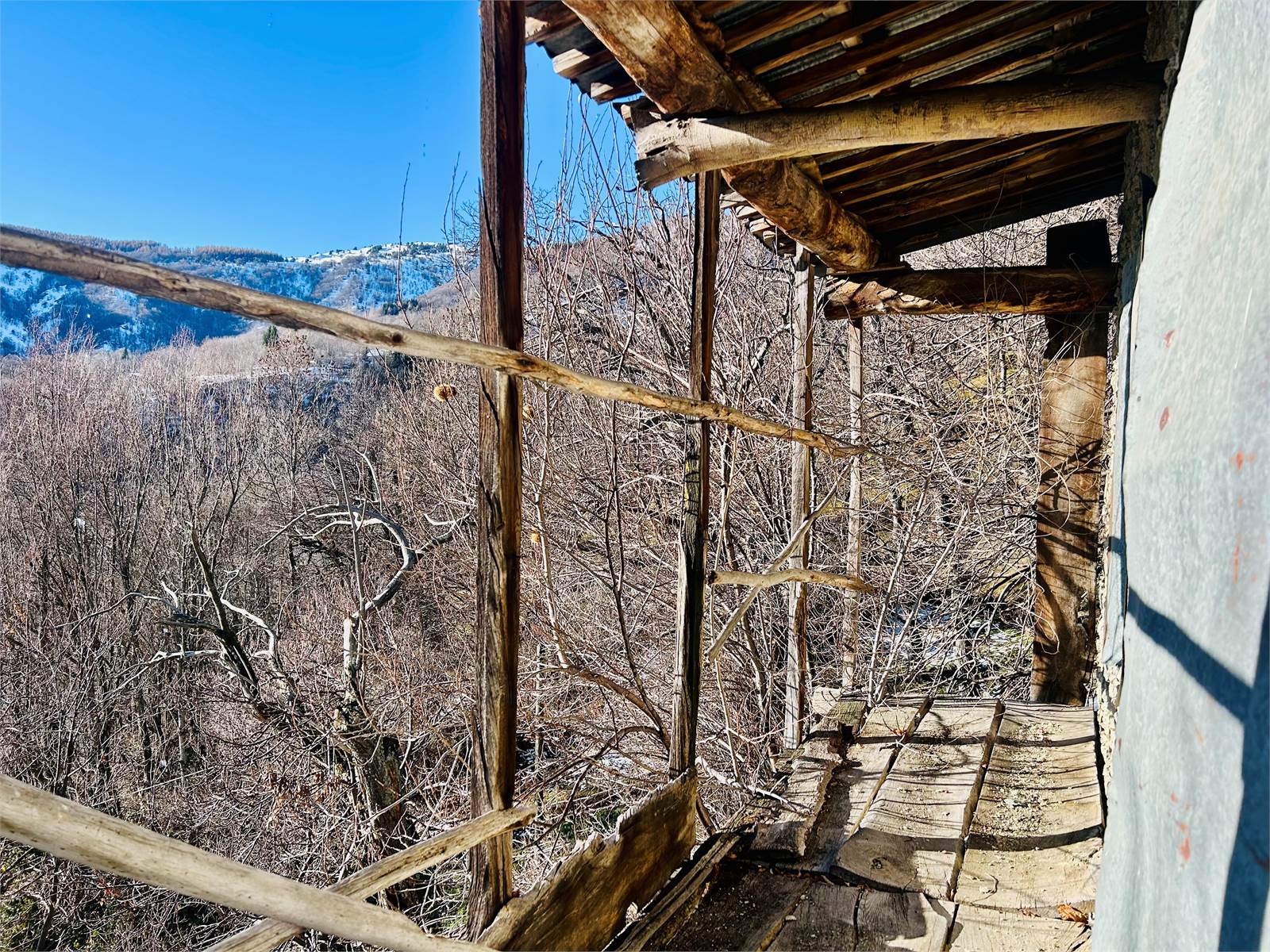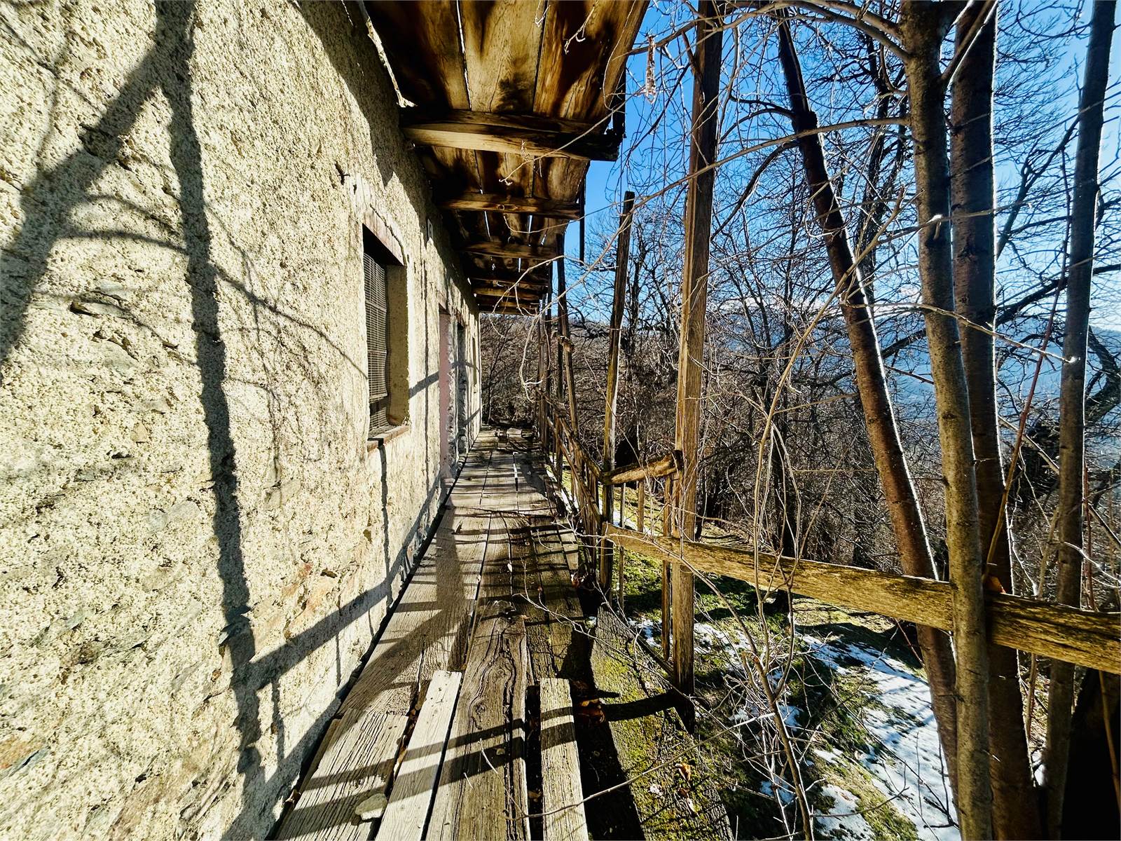 Attraverso la scala esterna si accede al balcone in legno del primo piano che si estende per l'intera facciata e da accesso a due locali che misurano più di 25 metri l'uno. Uno di essi un tempo veniva utilizzato come cucina in quanto è provvisto di un'antica stufa economica a legna.