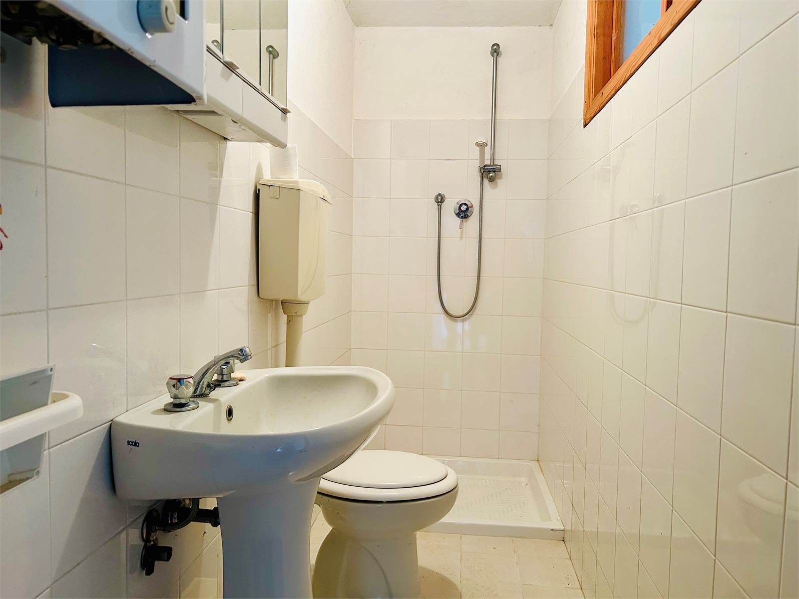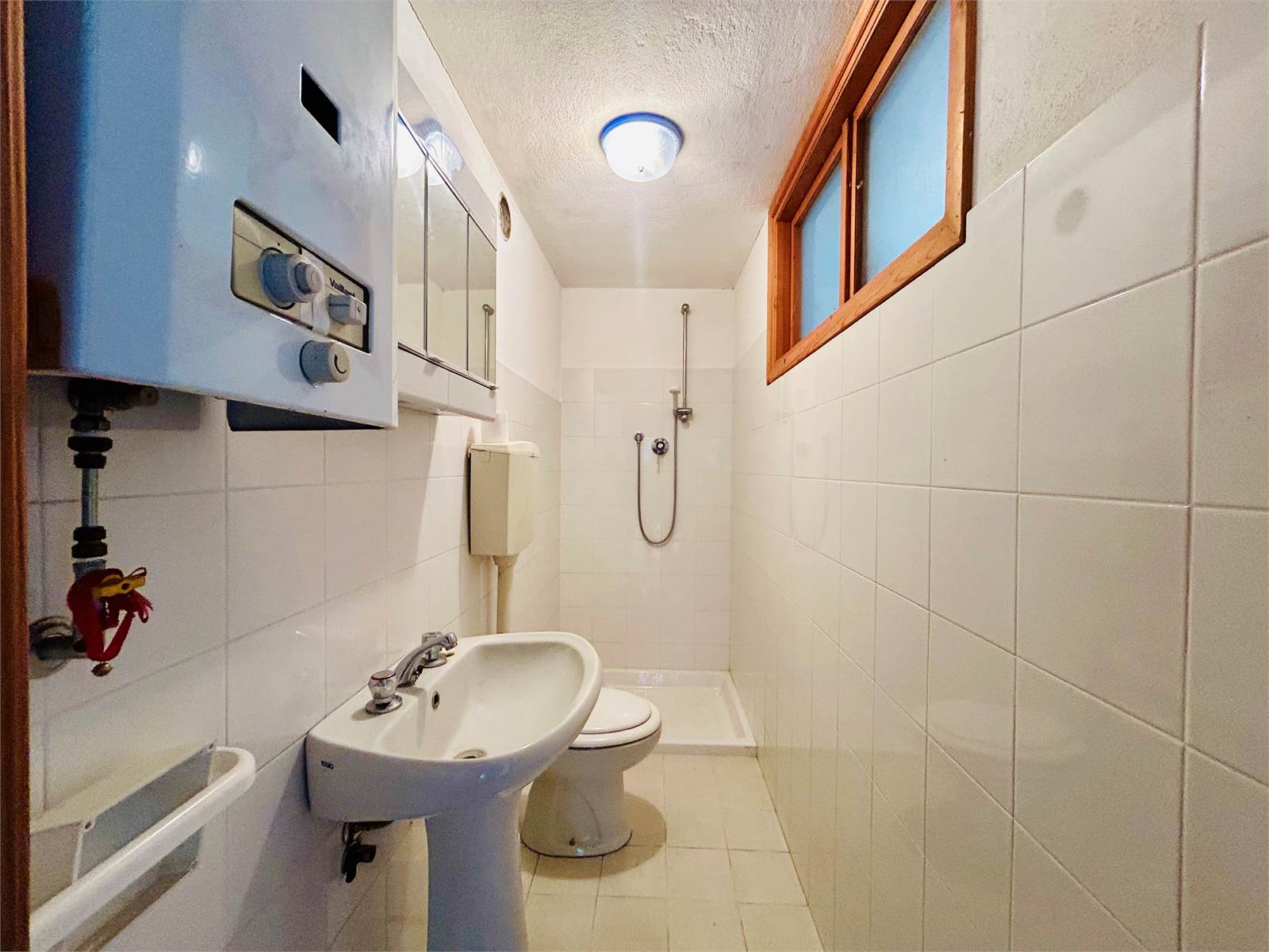 Il bagno che serve il piano, di più recente ristrutturazione, è dotato di doccia e calderina a gas per l'acqua calda sanitaria.