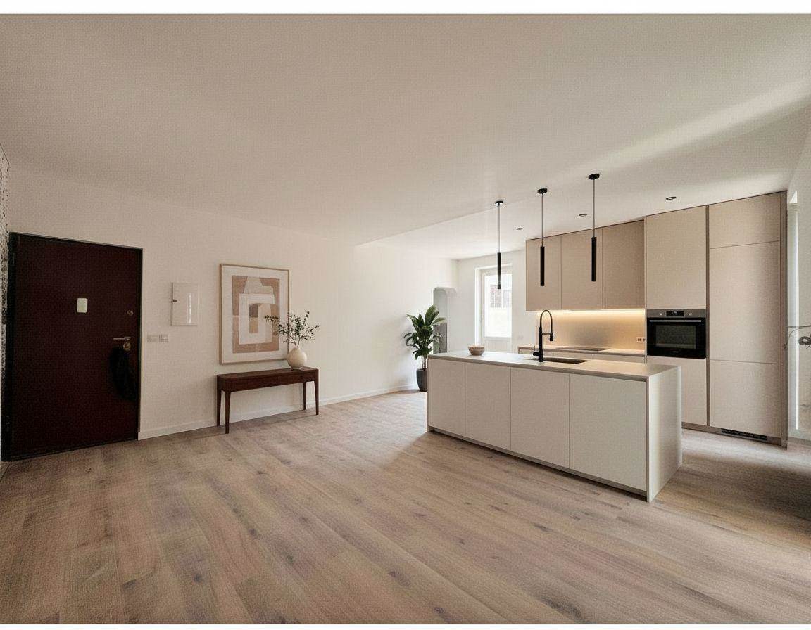 L'ingresso conduce a un grande soggiorno con cucina a vista e balcone. Sono state posate delle piastrelle in maiolica per definire l'area della cucina, aggiungendo personalità e stile alla stanza. Il balcone affaccia sul cavedio interno della palazzina e dona luminosità alla zona giorno.