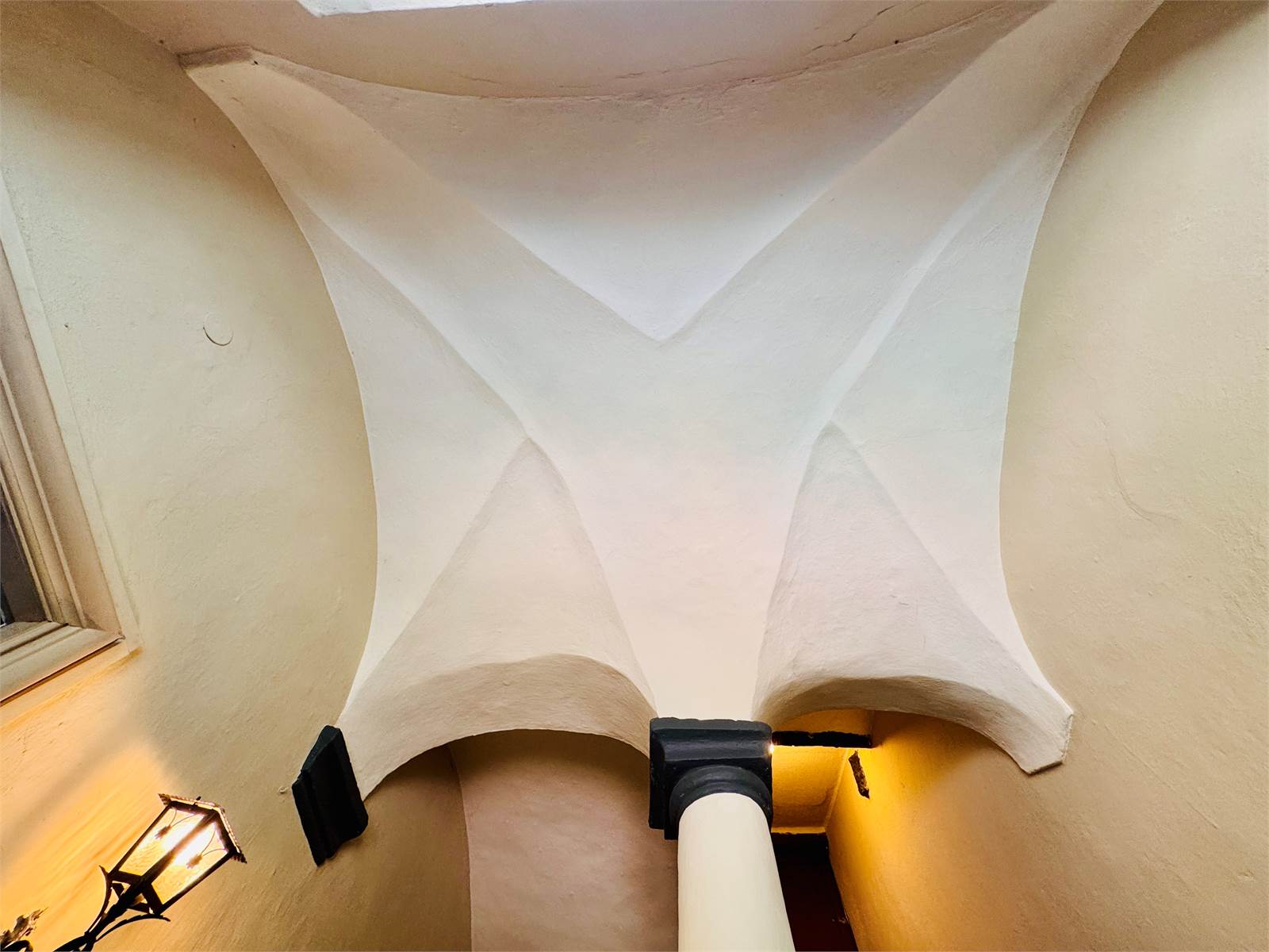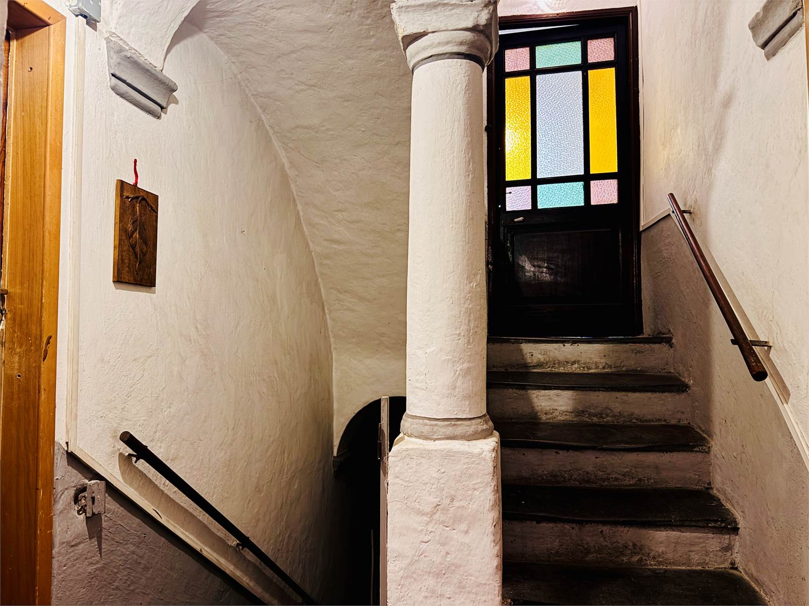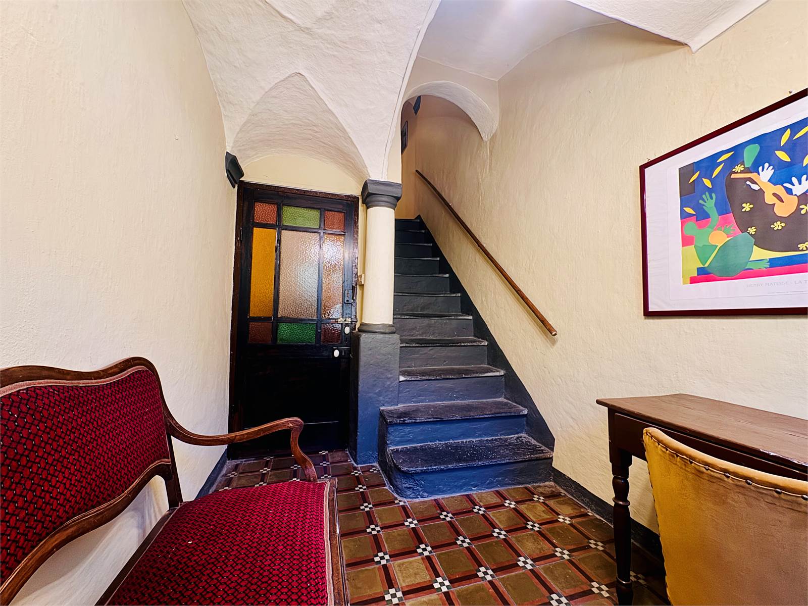 L’ingresso avviene dal vicolo laterale attraverso un atrio comune condiviso con altri tre appartamenti situati al piano terra. Salendo pochi gradini, si accede a un pianerottolo privato con finestra, ideale come zona filtro per riporre indumenti o accessori utilizzati all’esterno.