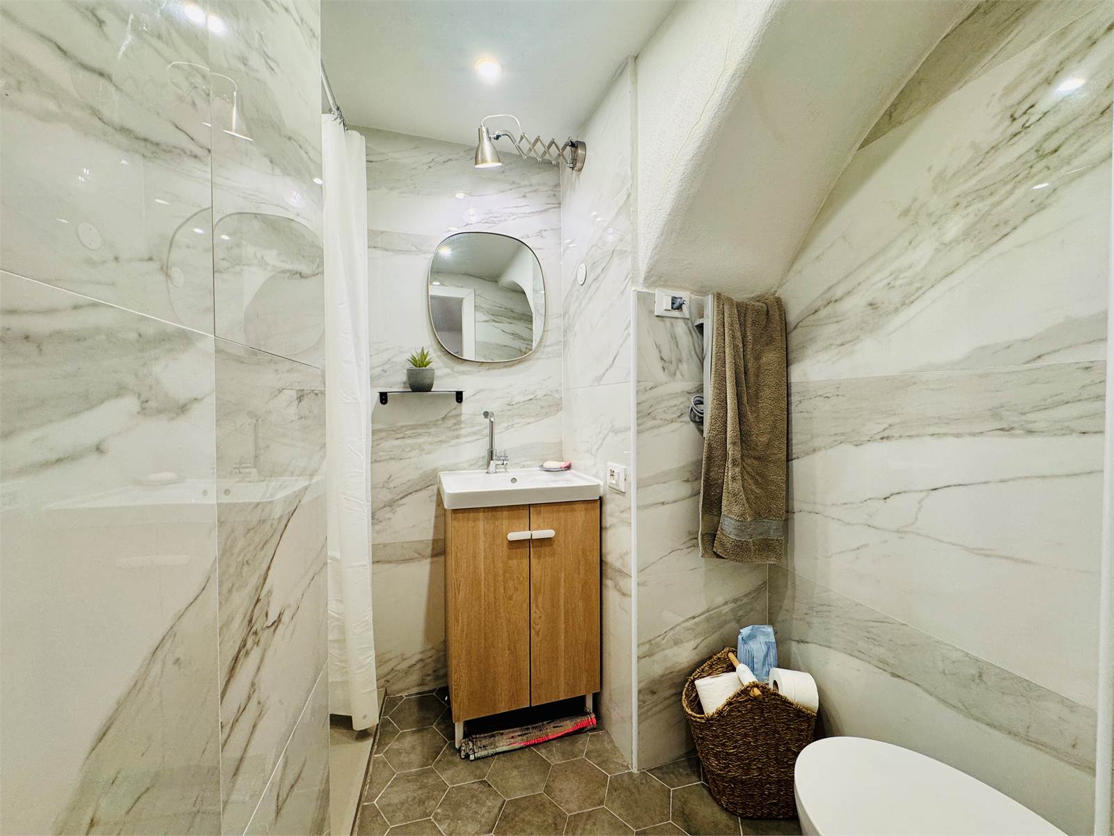 La zona notte si trova leggermente rialzata rispetto al soggiorno e si raggiunge salendo solo quattro gradini. È composta da due camere da letto, una singola e una matrimoniale, entrambe con affaccio sui suggestivi carruggi del centro storico.