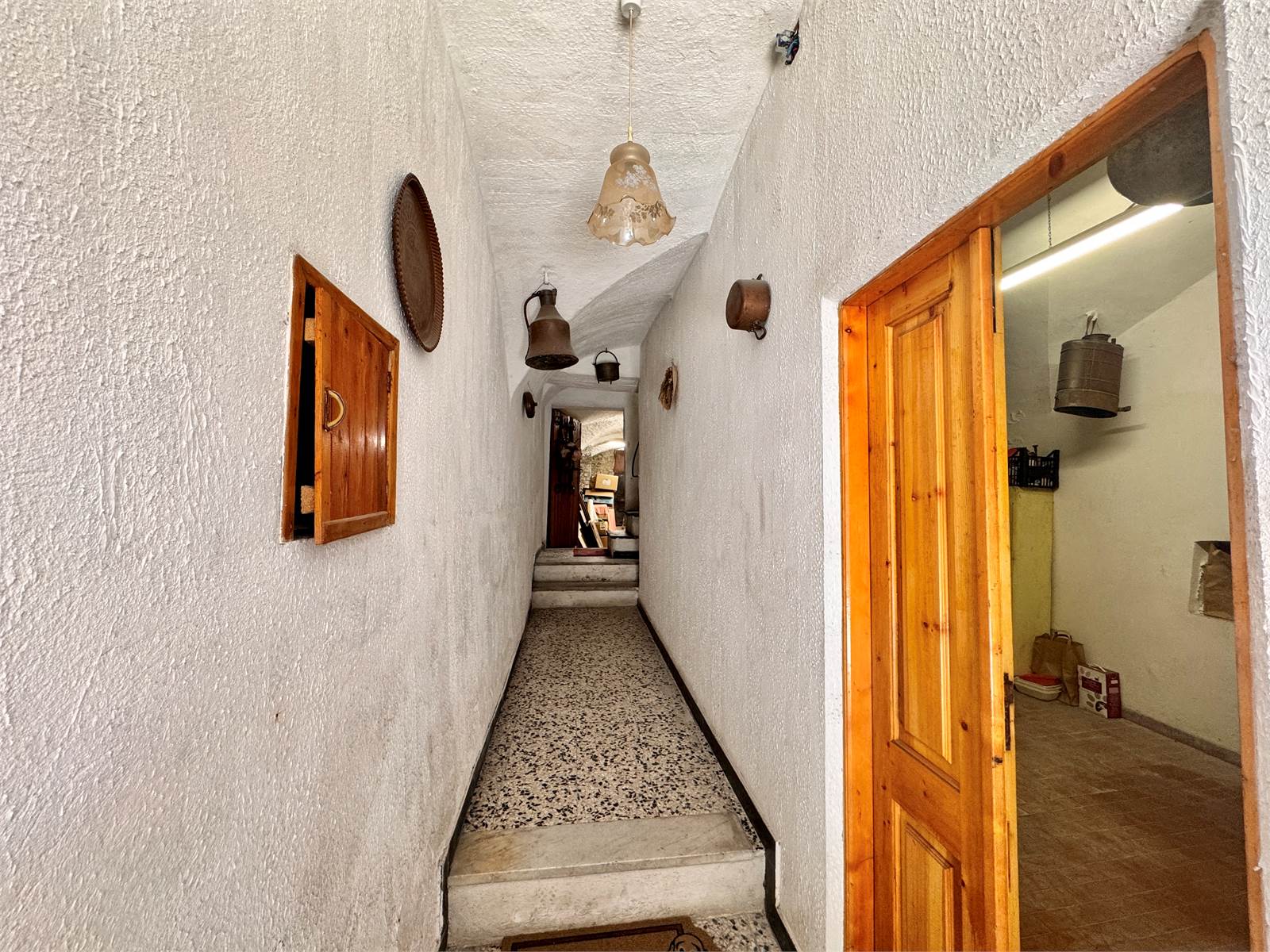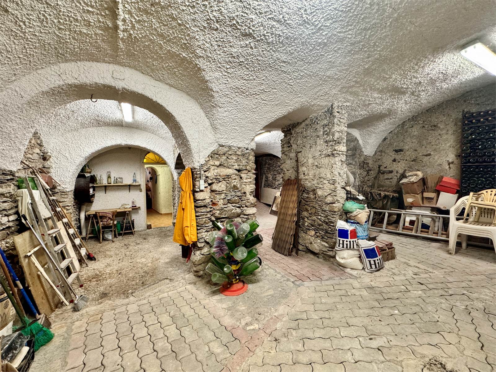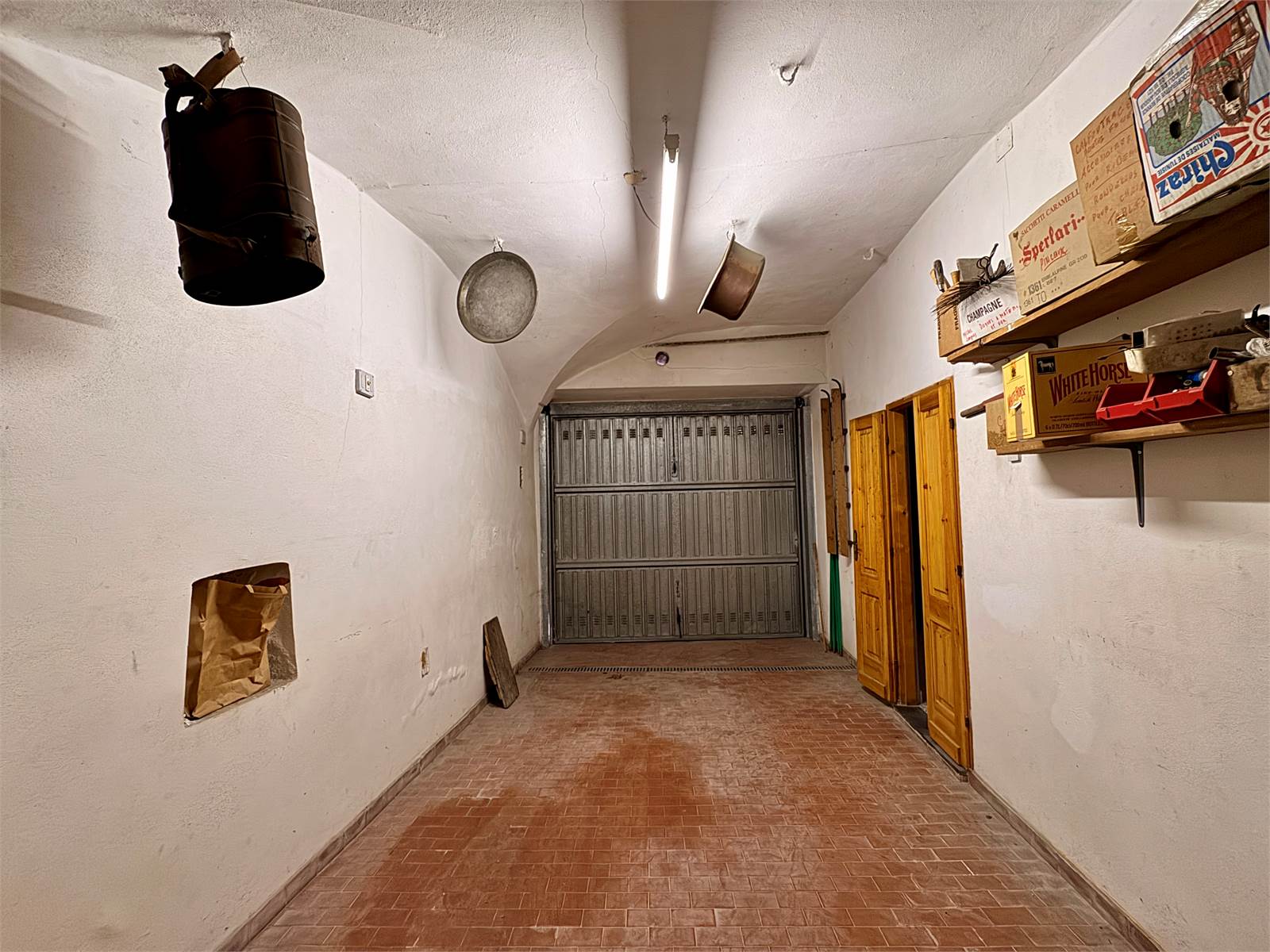 di 17 metri quadrati con ingresso carraio dalla via del paese, un ripostiglio e un'ampia cantina con accesso al giardino che misura circa 40 metri quadrati e che è dotata di bagno di servizio e di pilastri e volte in pietra. Tutti questi vani sono accessibili in modo indipendente da entrambi gli ingressi dell'abitazione.