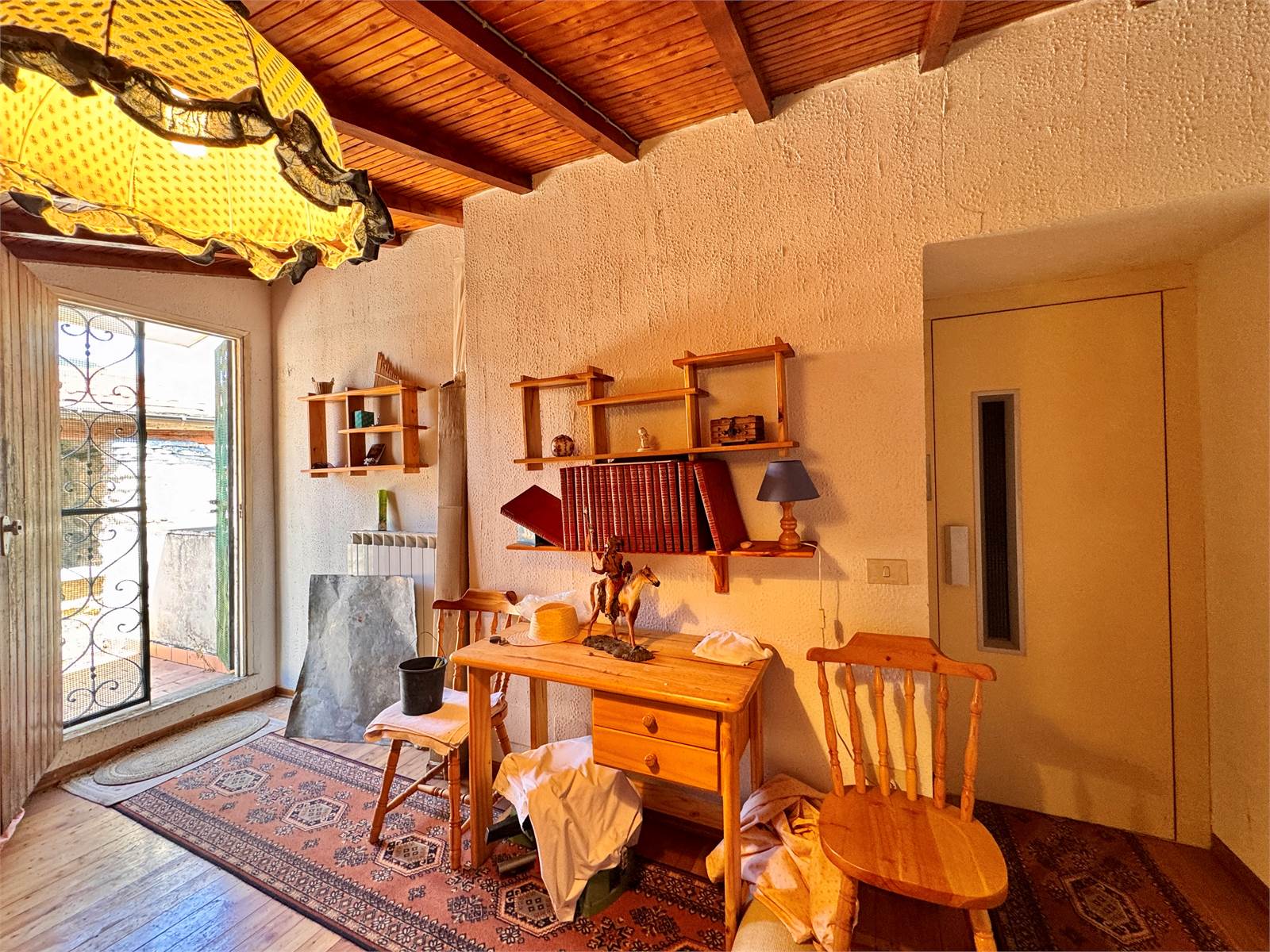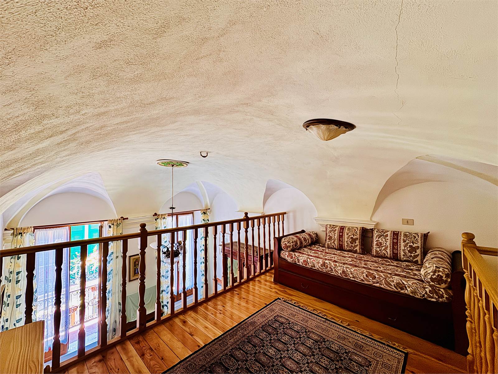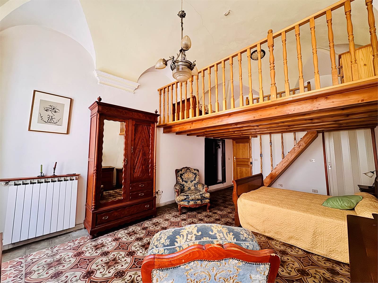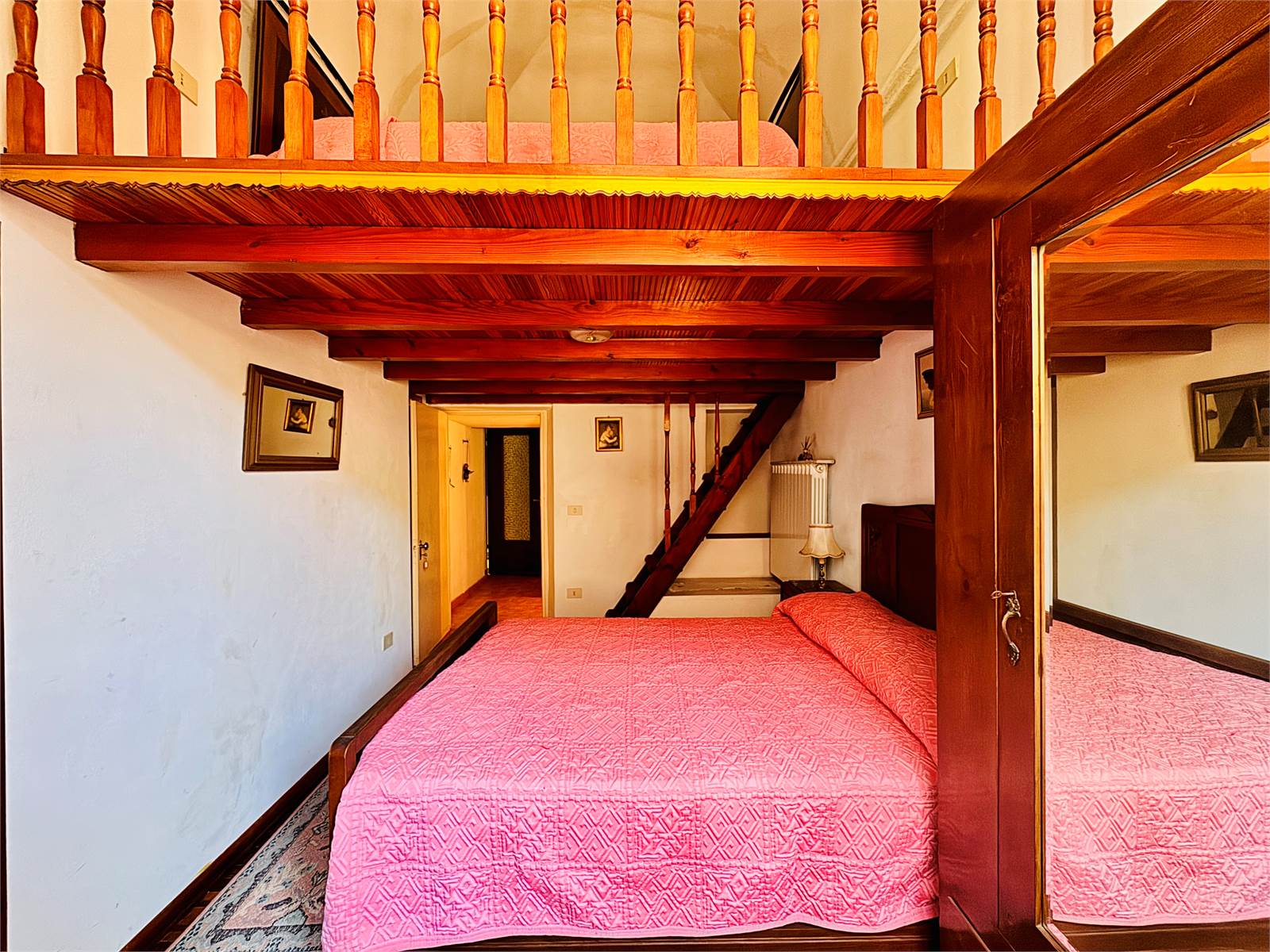 Al primo piano dell'abitazione sono presenti due alloggi indipendenti sia come impianti che come ingresso, che però possono essere accorpati in un unico grande appartamento in quanto già dotati di porta interna di comunicazione. Un alloggio è suddiviso in un unico ambiente con cucina abitabile e soggiorno, bagno cieco con doccia e camera da letto con pavimento in parquet, soppalco in legno e balcone, mentre il secondo appartamento è strutturato in soggiorno con cucina a vista, bagno cieco con doccia e camera da letto matrimoniale con pavimento in cotto decorato e soppalco in legno.